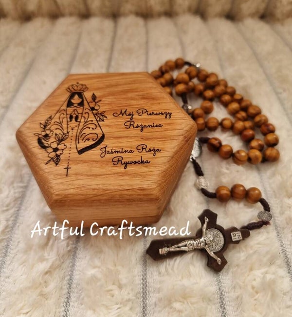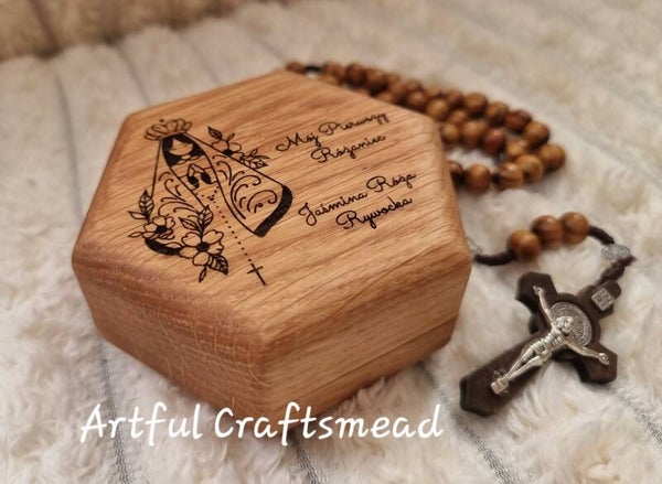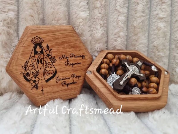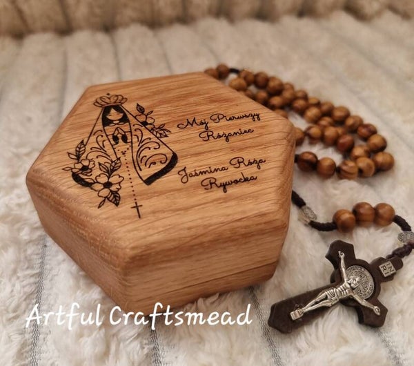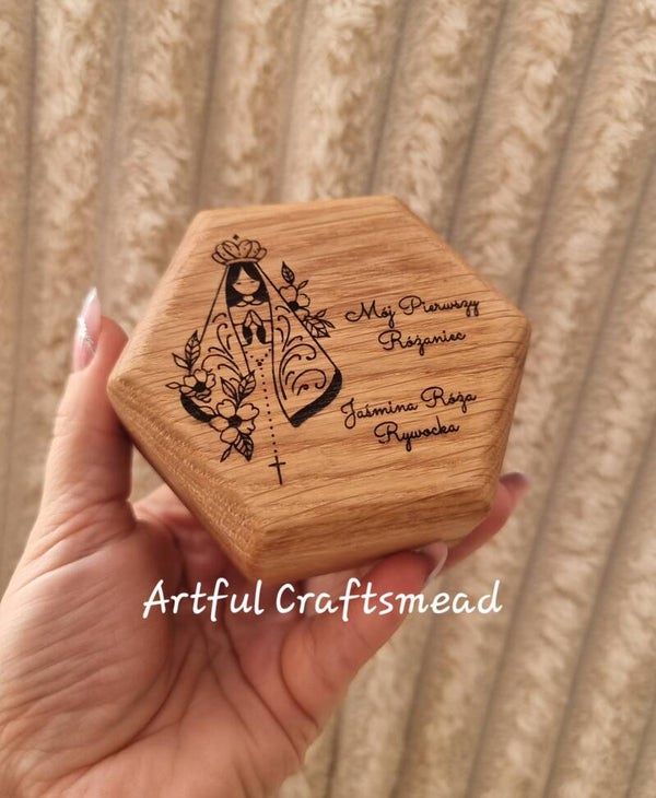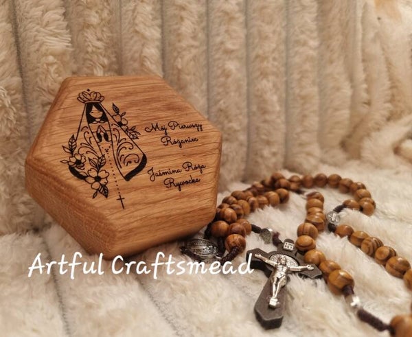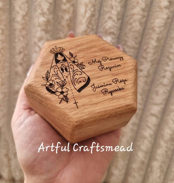 Hello, lovely gift-givers! 😊 Are you searching for a unique and heartfelt gift that will be treasured for generations? Our **Beautiful Hexagon Rosary Box** is here to captivate your heart. Crafted with love from solid oak, this charming hexagon-shaped box features a stunning laser-engraved image of the Blessed Virgin Mary with a rosary. ✨📿 Rosary not included!!!