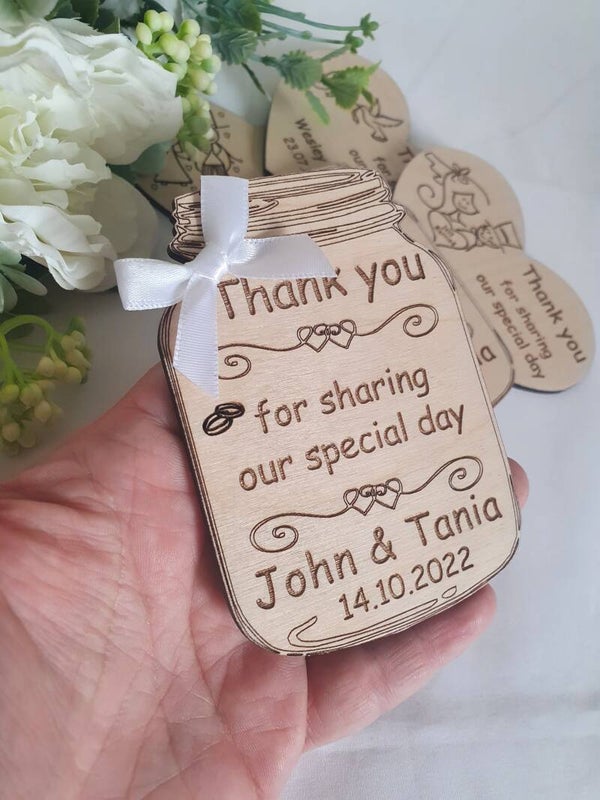 Imagine this: a delightful jar-shaped magnet, topped with an adorable little white bow. Inside, your names and wedding date are beautifully personalized, along with the heartfelt message "Thank you for sharing our special day." 🥰💌