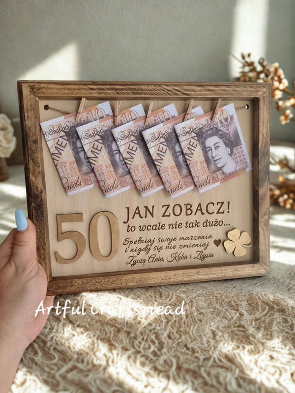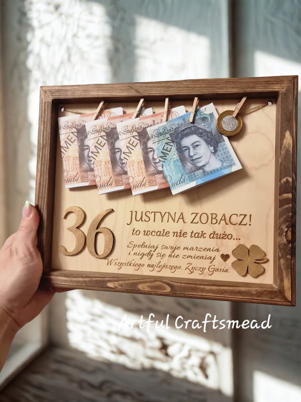 This personalised wooden frame is designed to hold banknotes, turning a simple cash gift into a fun and meaningful presentation.