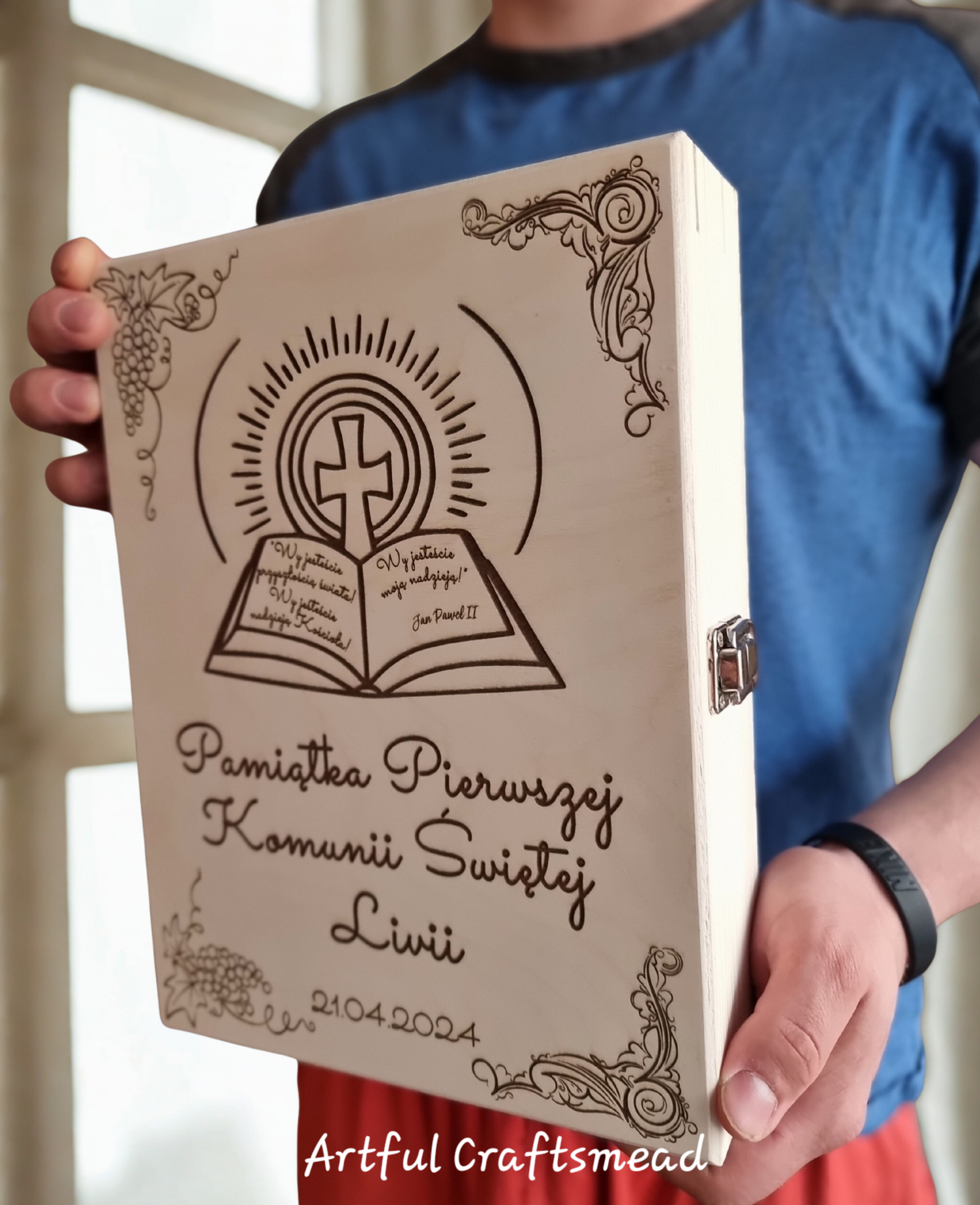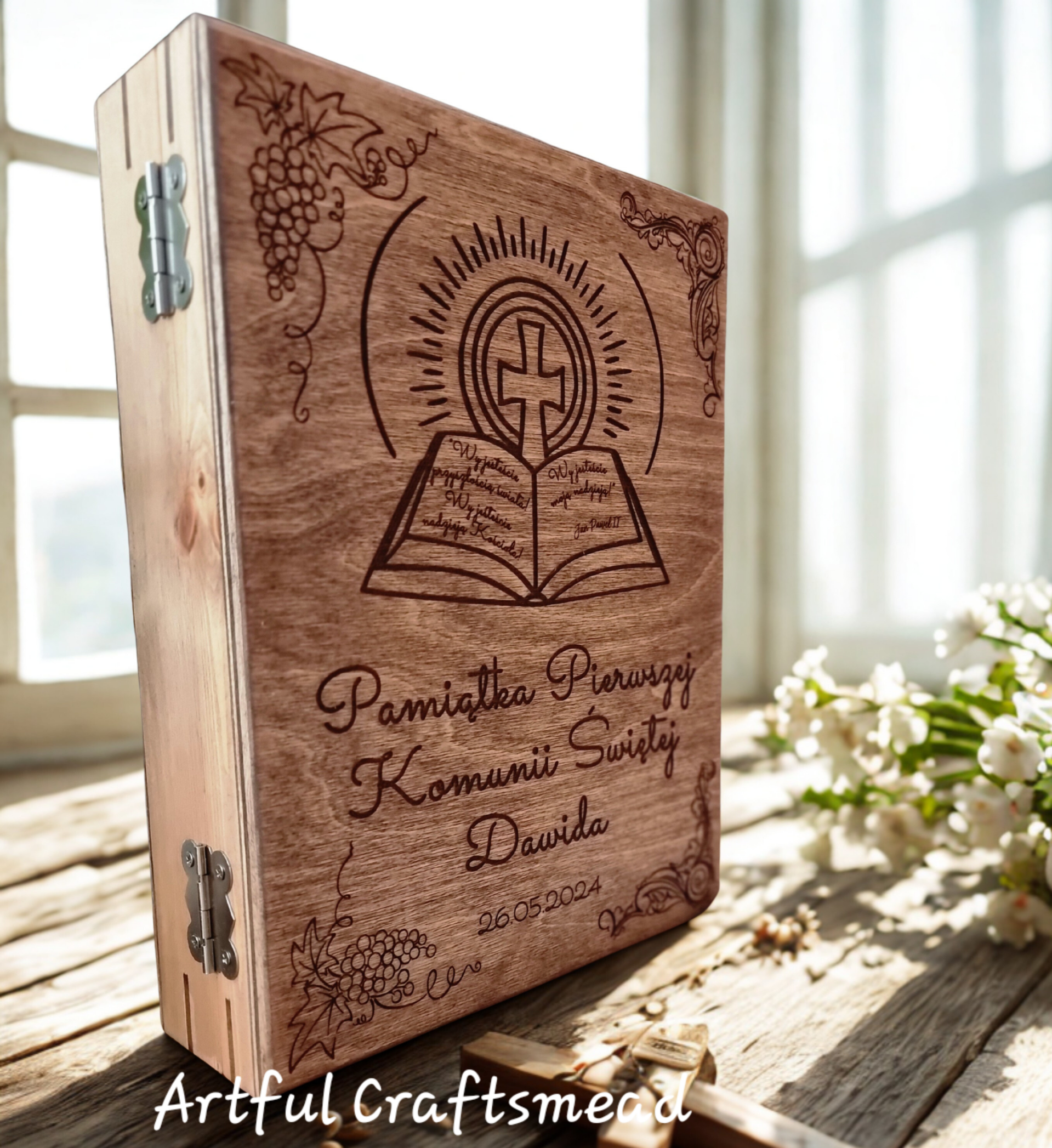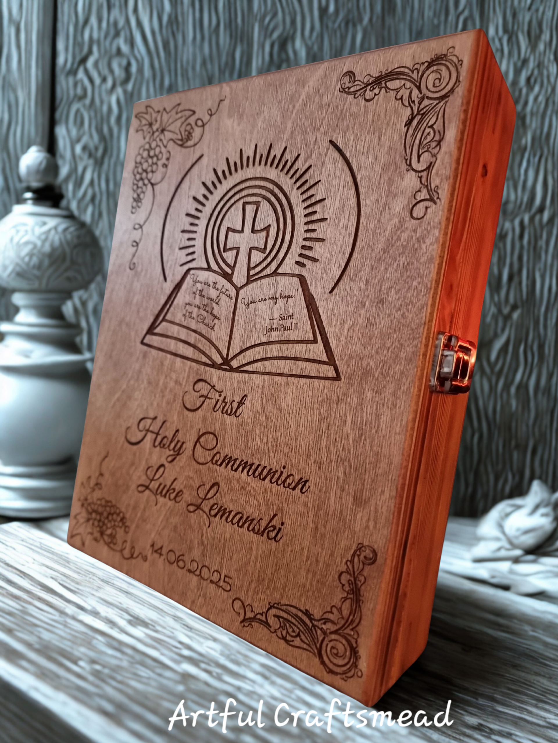 This personalised Bible keepsake box is handcrafted by us from solid wood, designed especially to store a Holy Bible or other religious books for First Holy Communion.