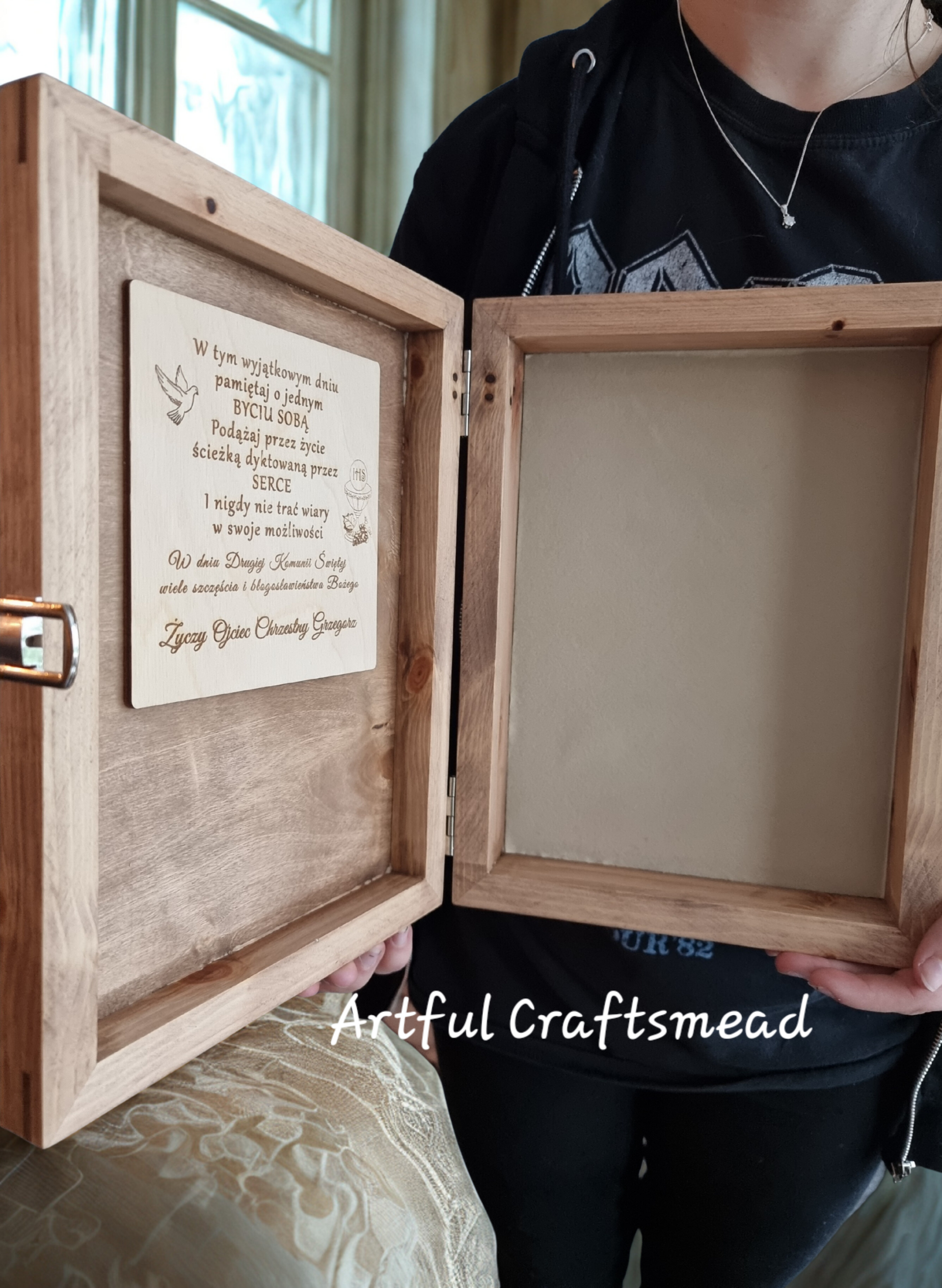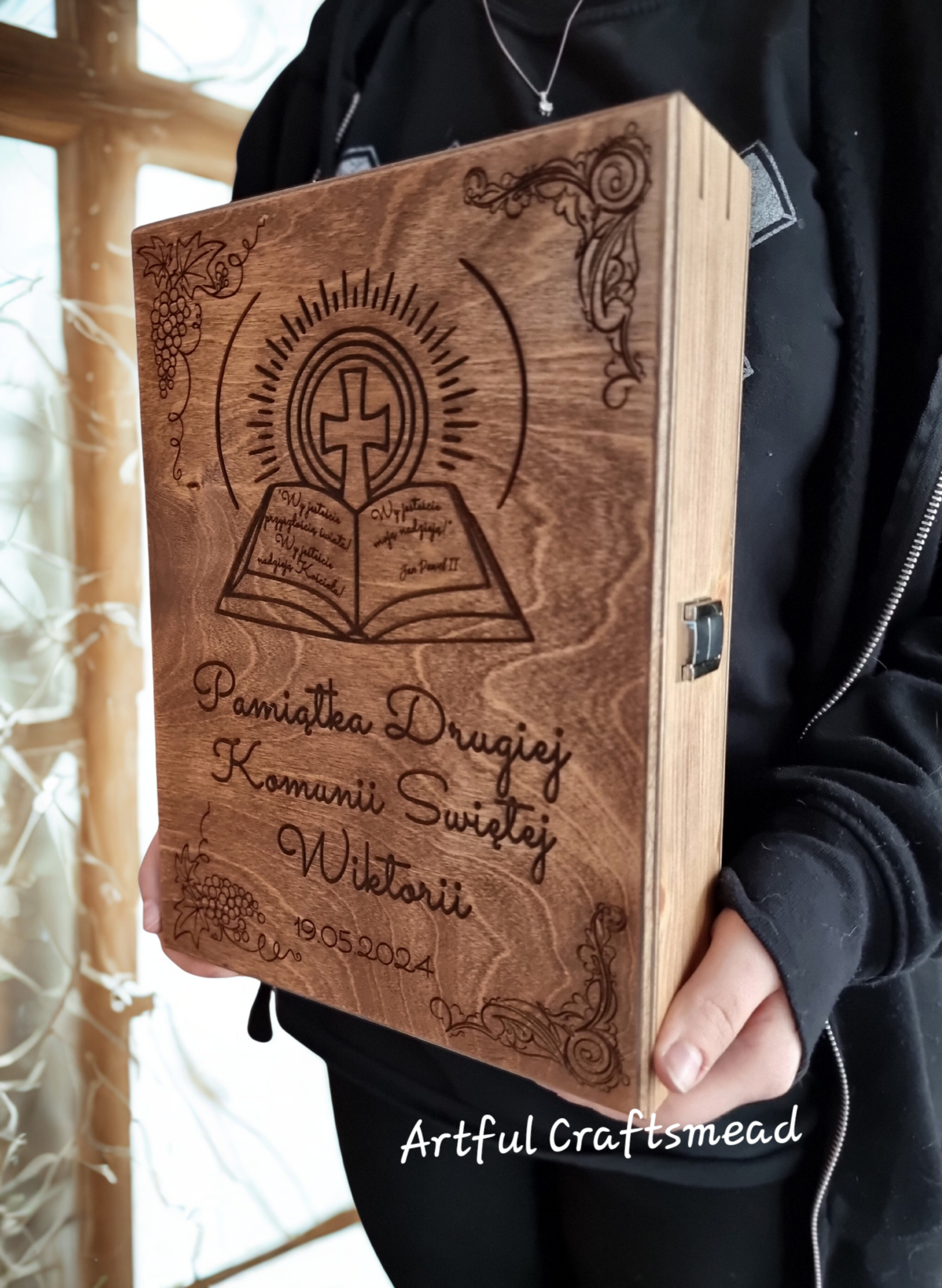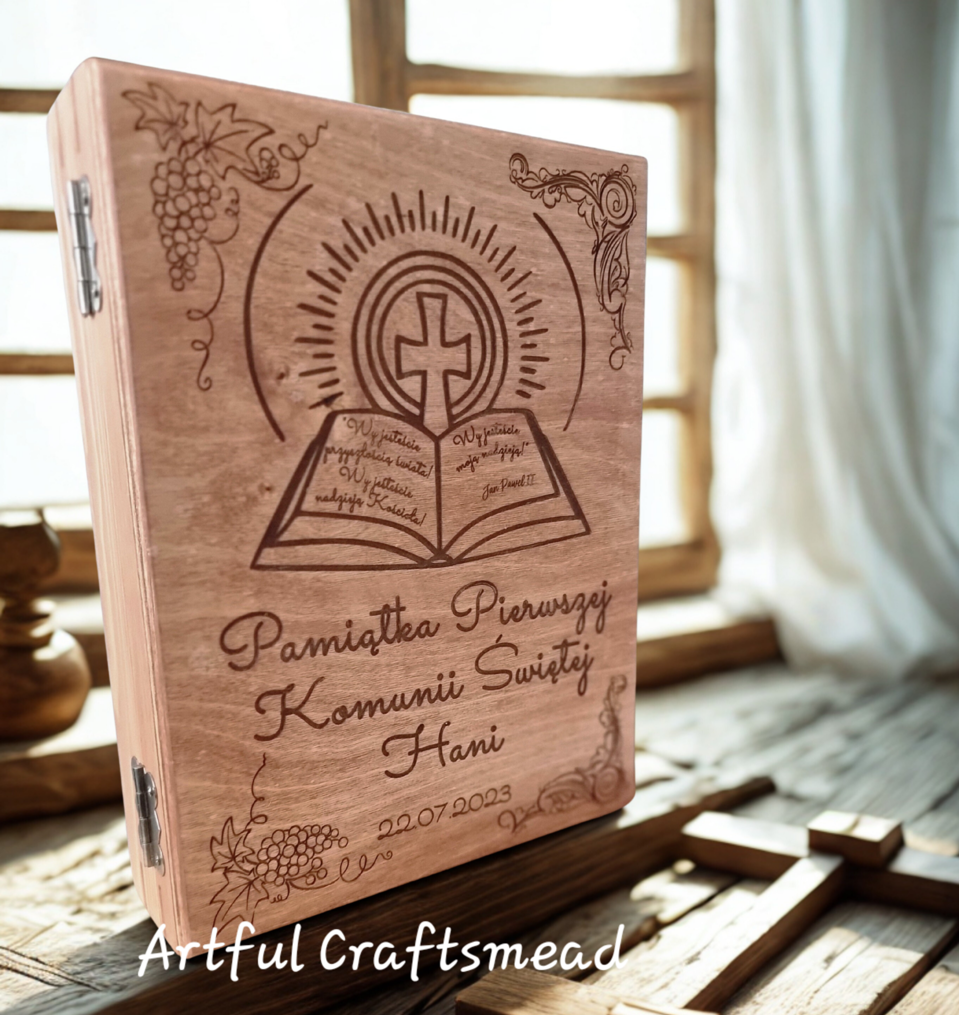 This personalised Bible keepsake box is handcrafted by us from solid wood, designed especially to store a Holy Bible or other religious books for First Holy Communion.