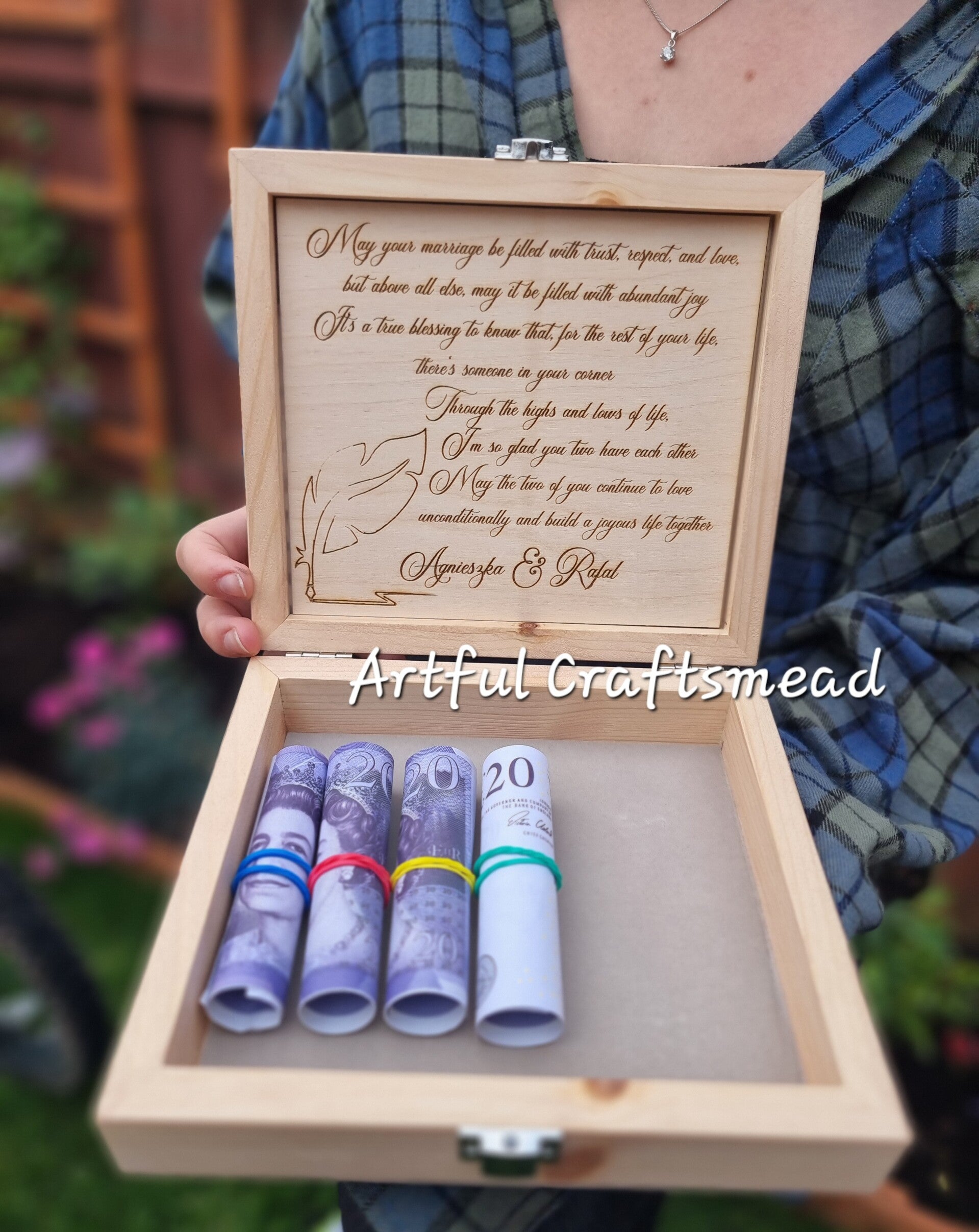 Visit our Etsy shop to order this delightful wooden money box. Whether you're attending a wedding or celebrating your own, this gift will be cherished forever.