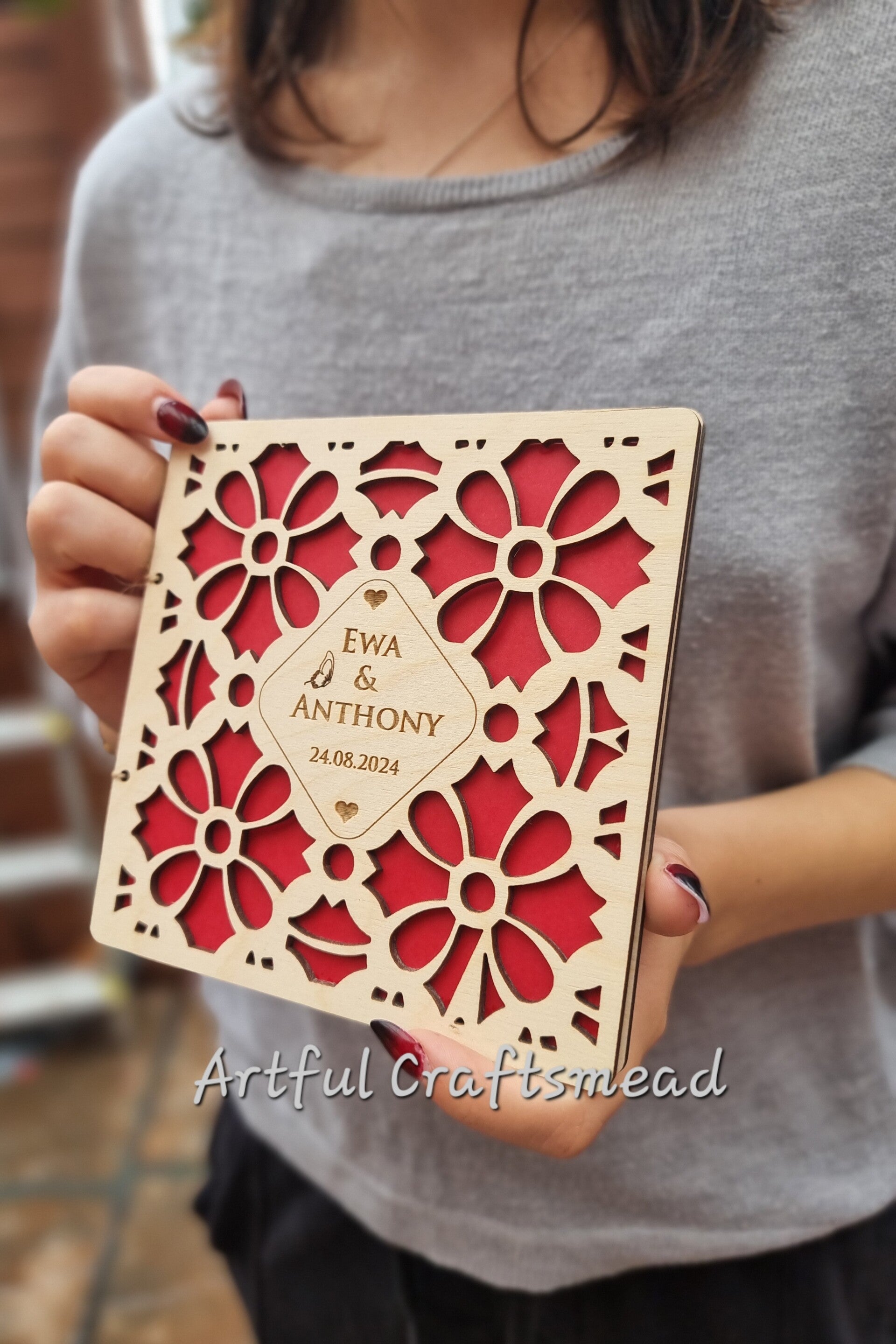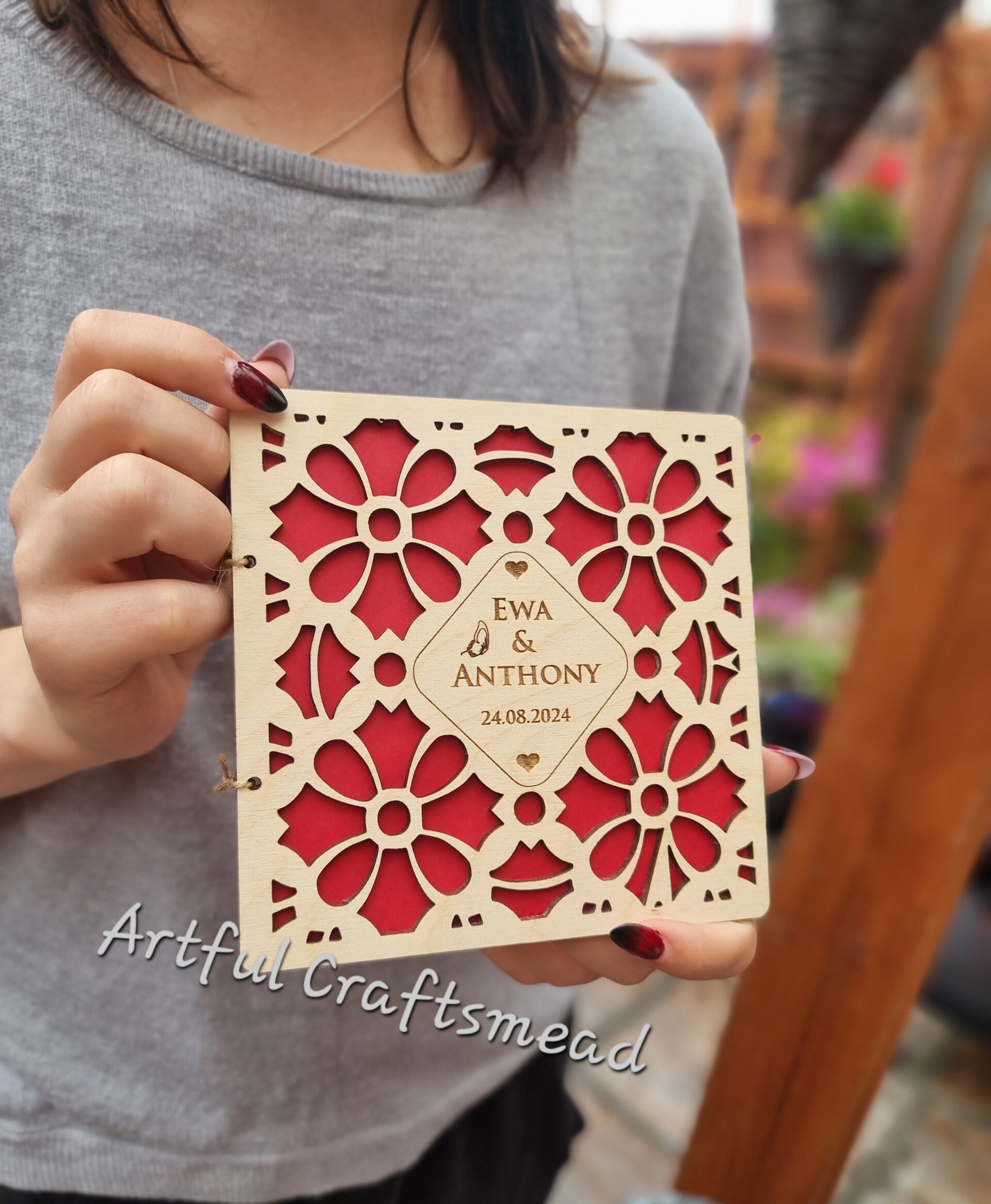 Celebrate love with our exquisite personalized wooden wedding card! This unique alternative to a standard money envelope features delicate laser-cut floral patterns on the front. The center showcases personalized names and the special date of the occasion. Through the intricate cutouts, a vibrant red envelope peeks through, though you can choose from other colors in our collection.