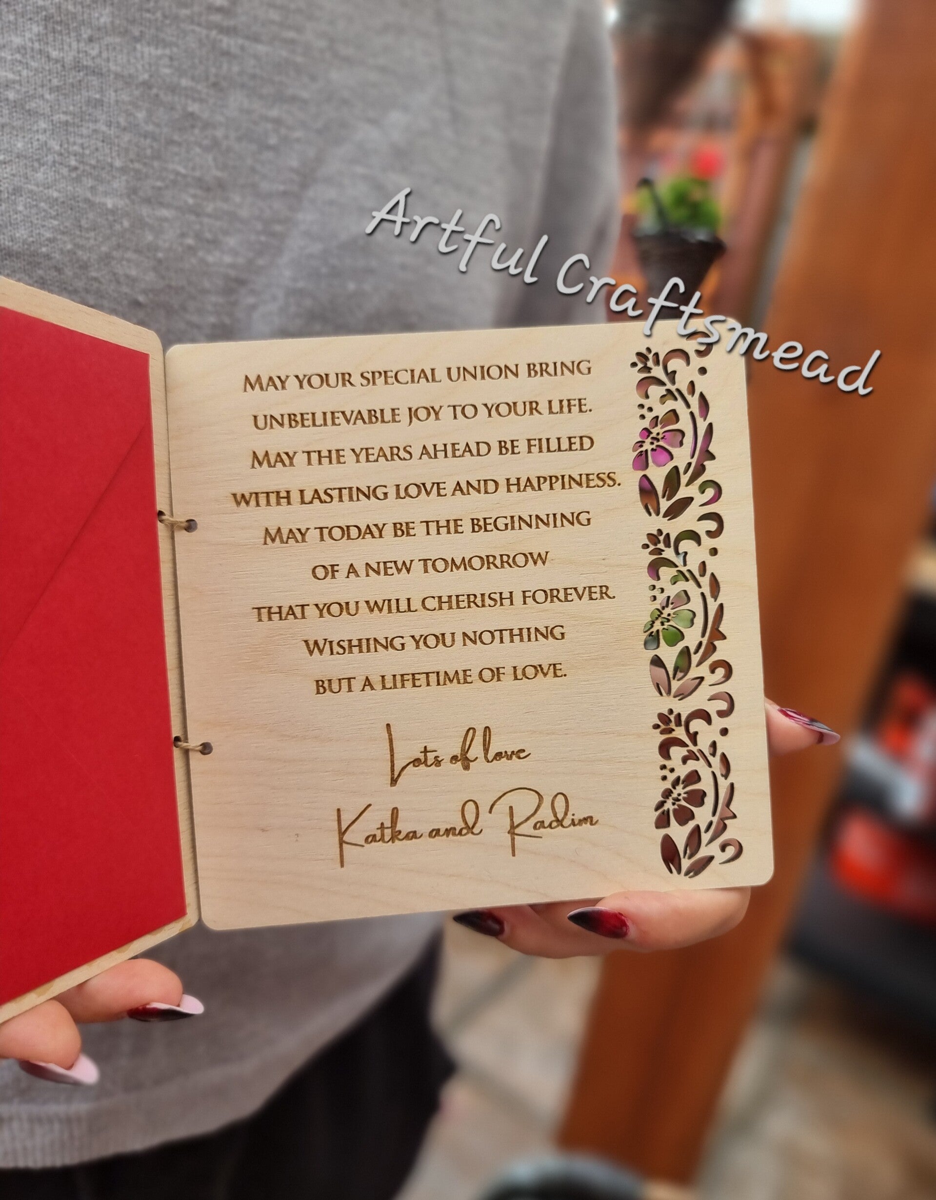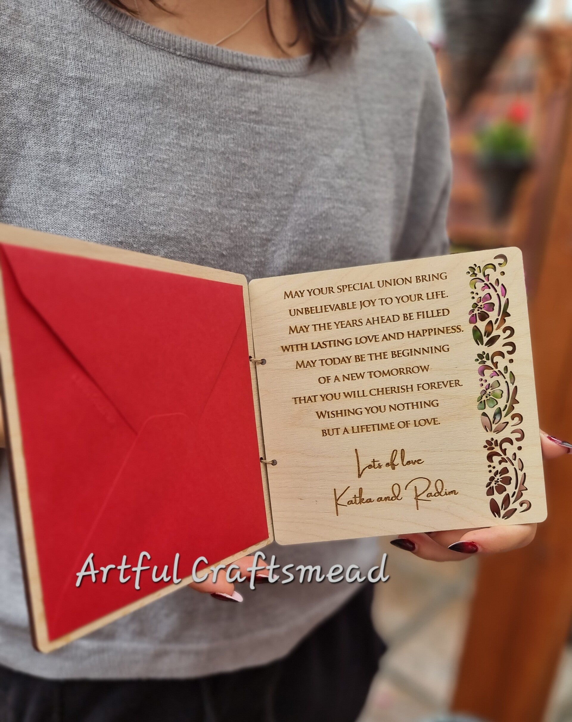 This wooden wedding card is a heartfelt keepsake that captures the essence of love and celebration.
