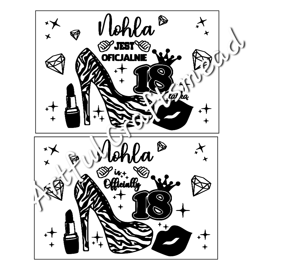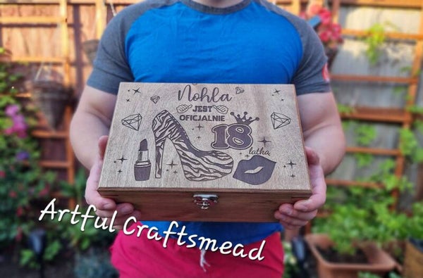 The lid of the box is adorned with beautifully engraved designs that are unmistakably feminine, featuring diamonds, a high-heeled shoe, lips, and a lipstick. The most important element is the personalization – the birthday girl's name and her age, making it a unique and thoughtful gift. While the example shows "18," this box can be customized for any age, whether it's 30, 50, or 70.