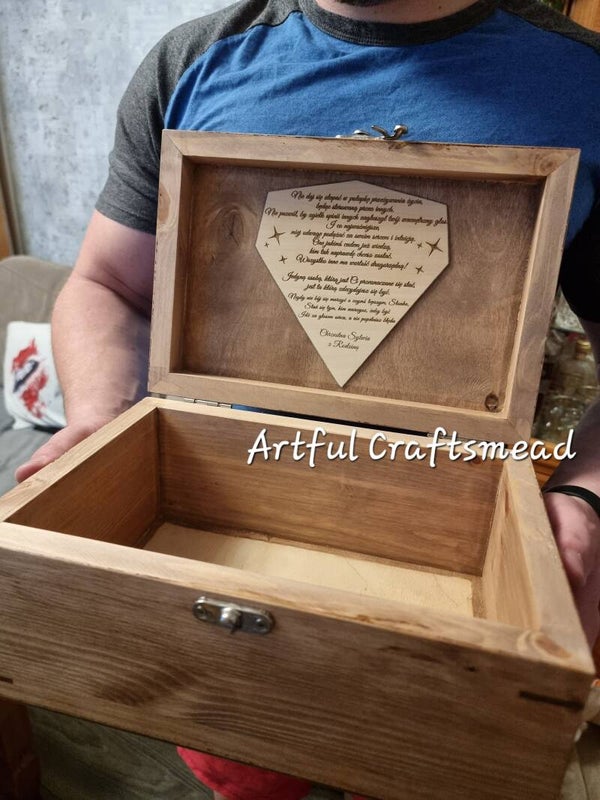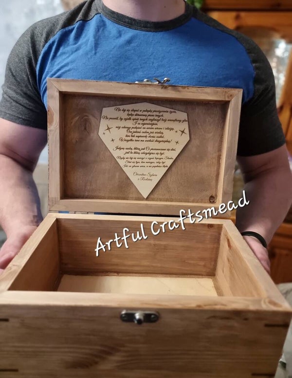 Inside the lid, you have the option to include heartfelt wishes and a dedication. This is an additional feature, so please let us know if you would like to include it. If not specified, the box will come without these engravings. Remember, the design on the lid is fixed, so please ensure you provide the correct personalization details, as we will copy and paste them exactly as provided.