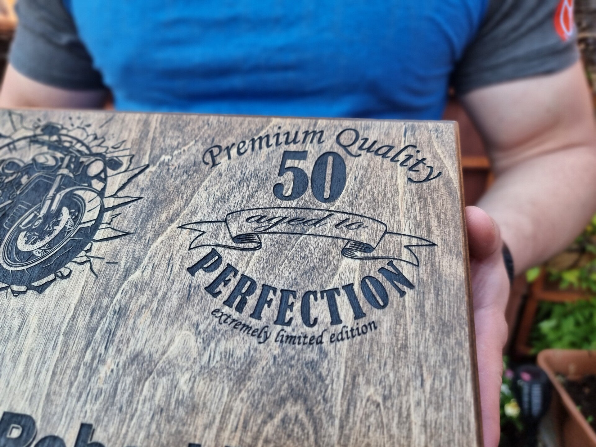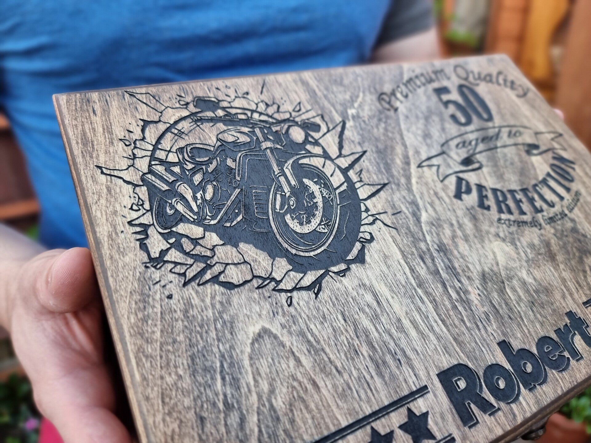 - **Design:** The lid features an engraved motorcycle, the recipient's name, age, and the inscription "Premium Quality"