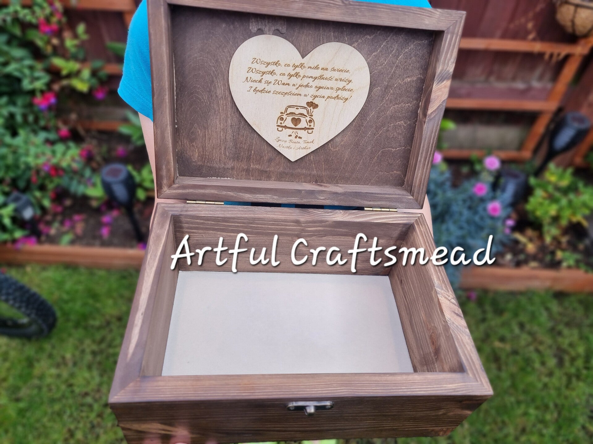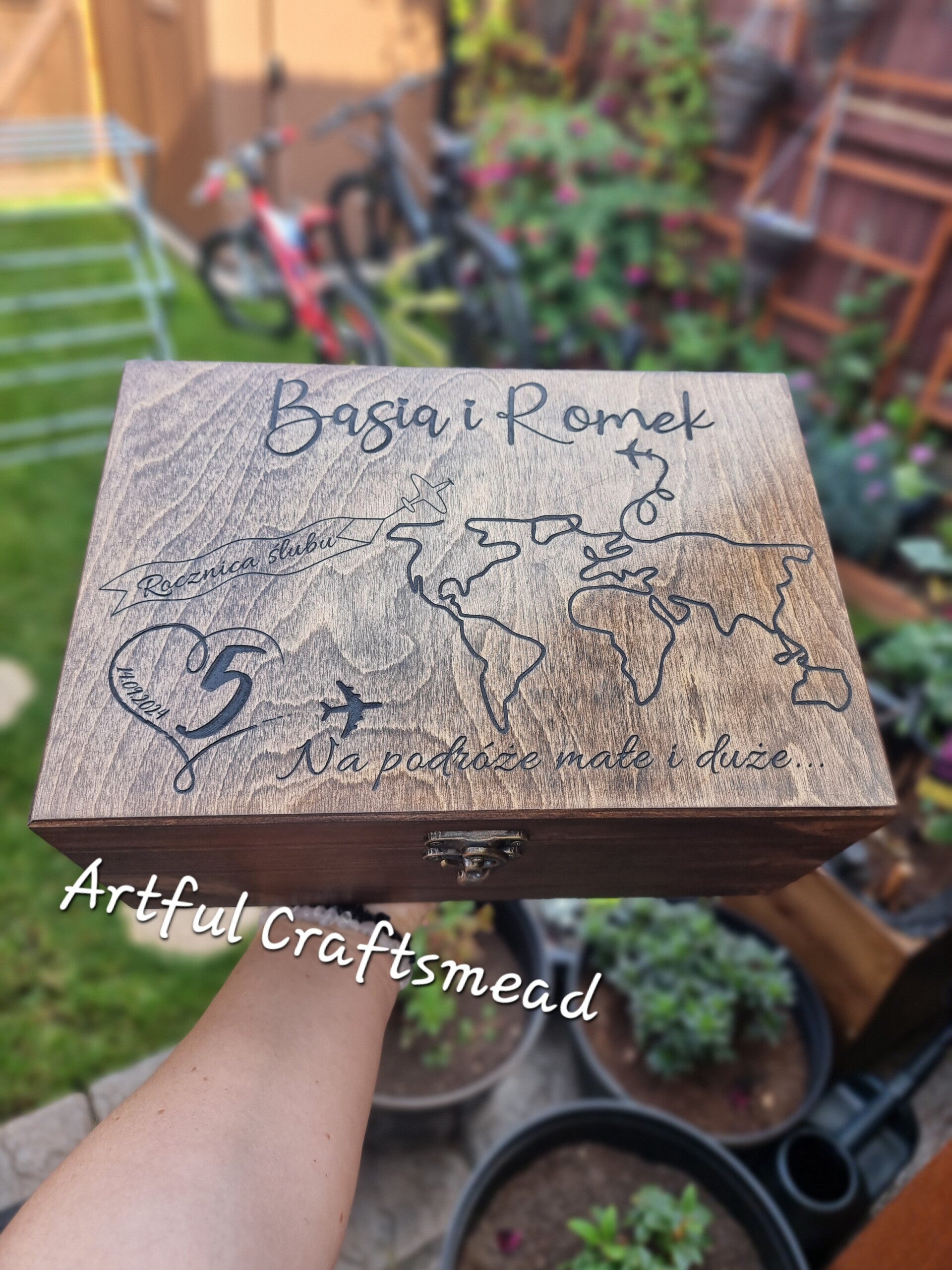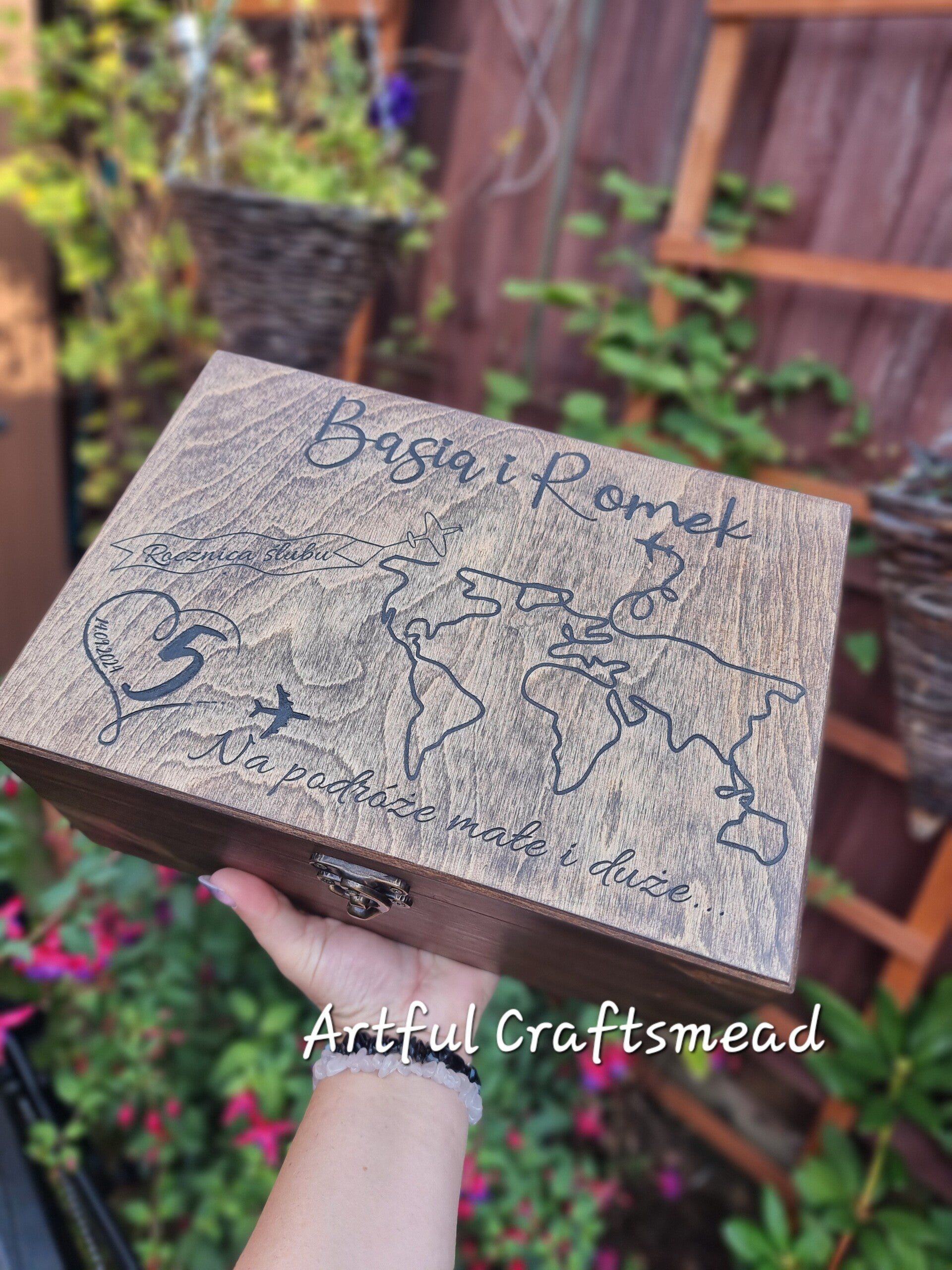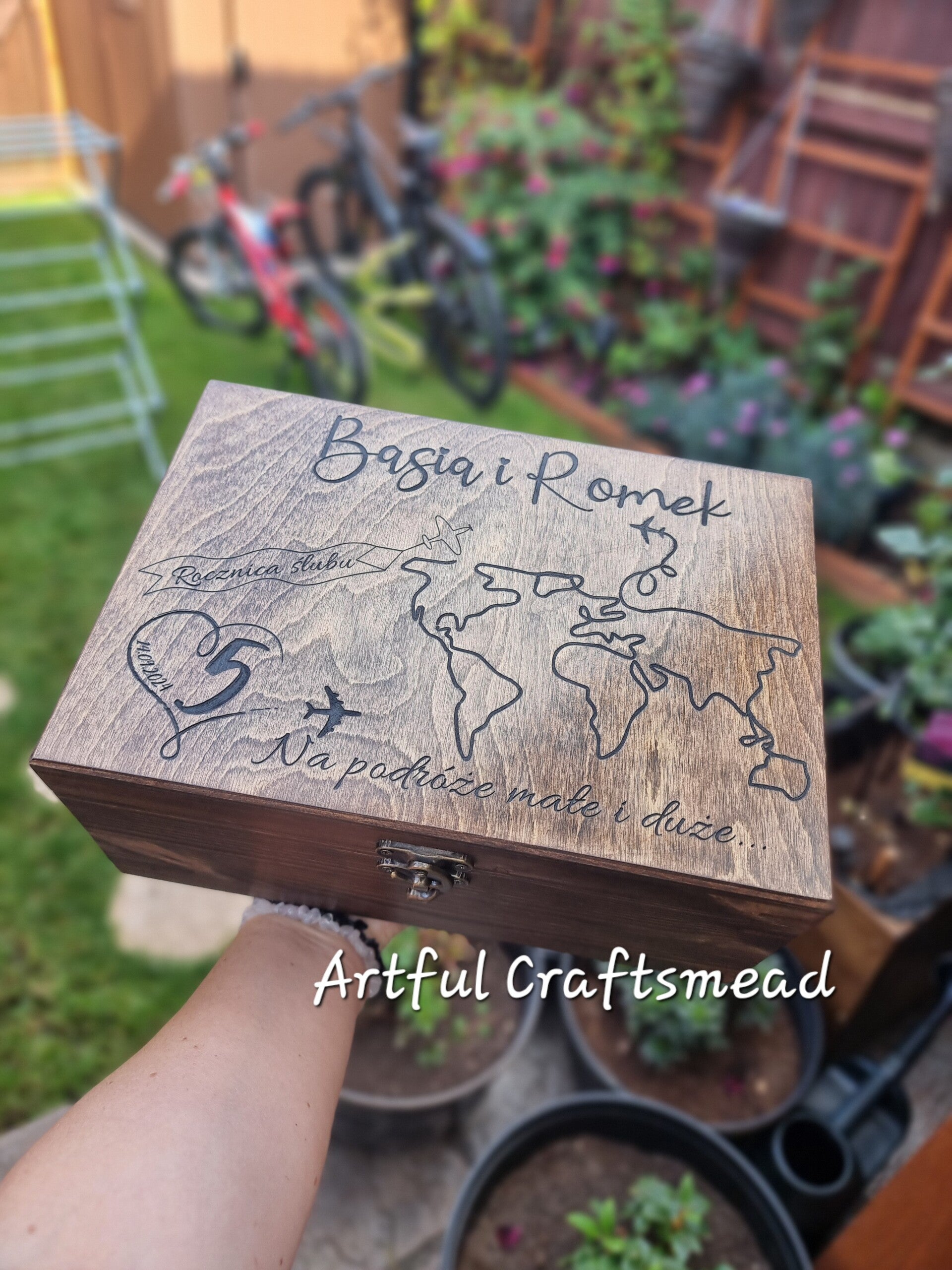 Celebrate your special anniversary with our exquisite wooden keepsake box, perfect for couples who love to travel! Measuring approximately 29x20x13cm, this solid wood box is designed to store your precious memories and mementos.