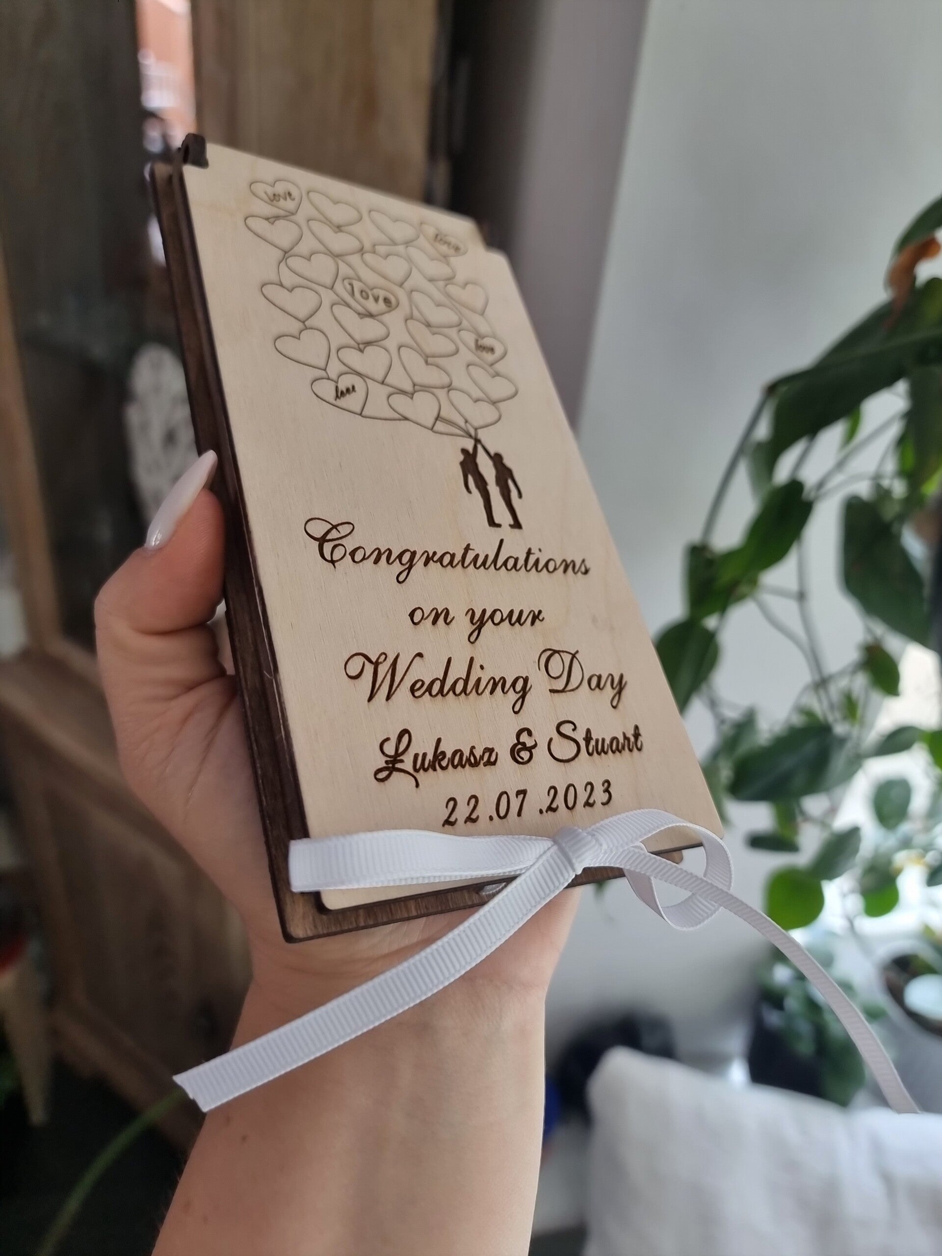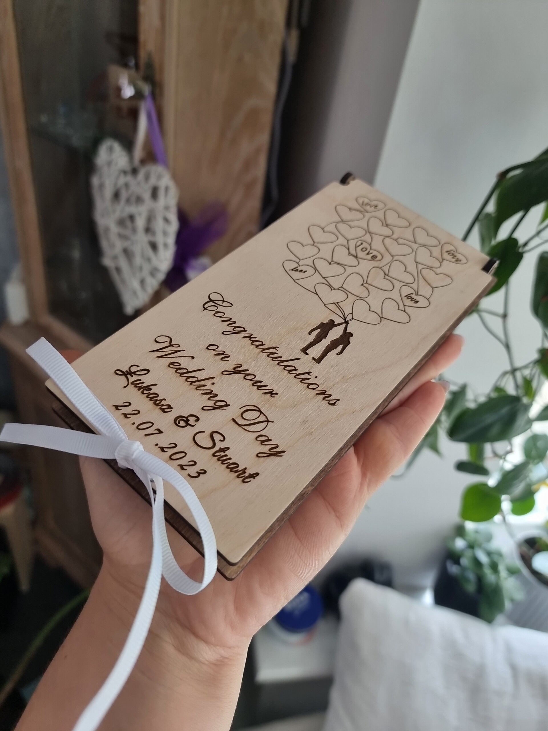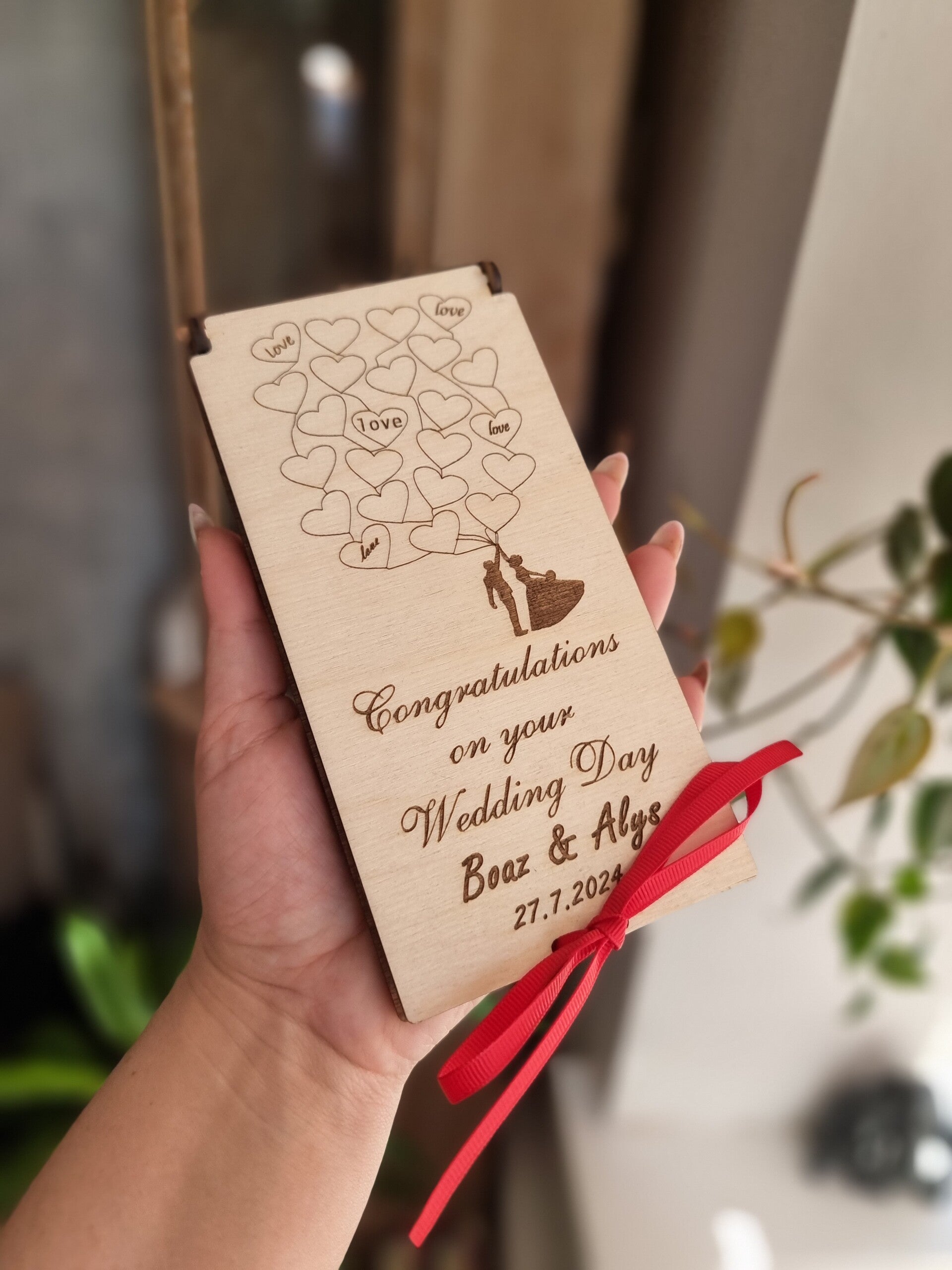 - **Beautiful Engraving:** The lid features an engraved image of a young couple holding heart-shaped balloons, along with the text "Congratulations on your wedding day," the couple's names, and the wedding date.