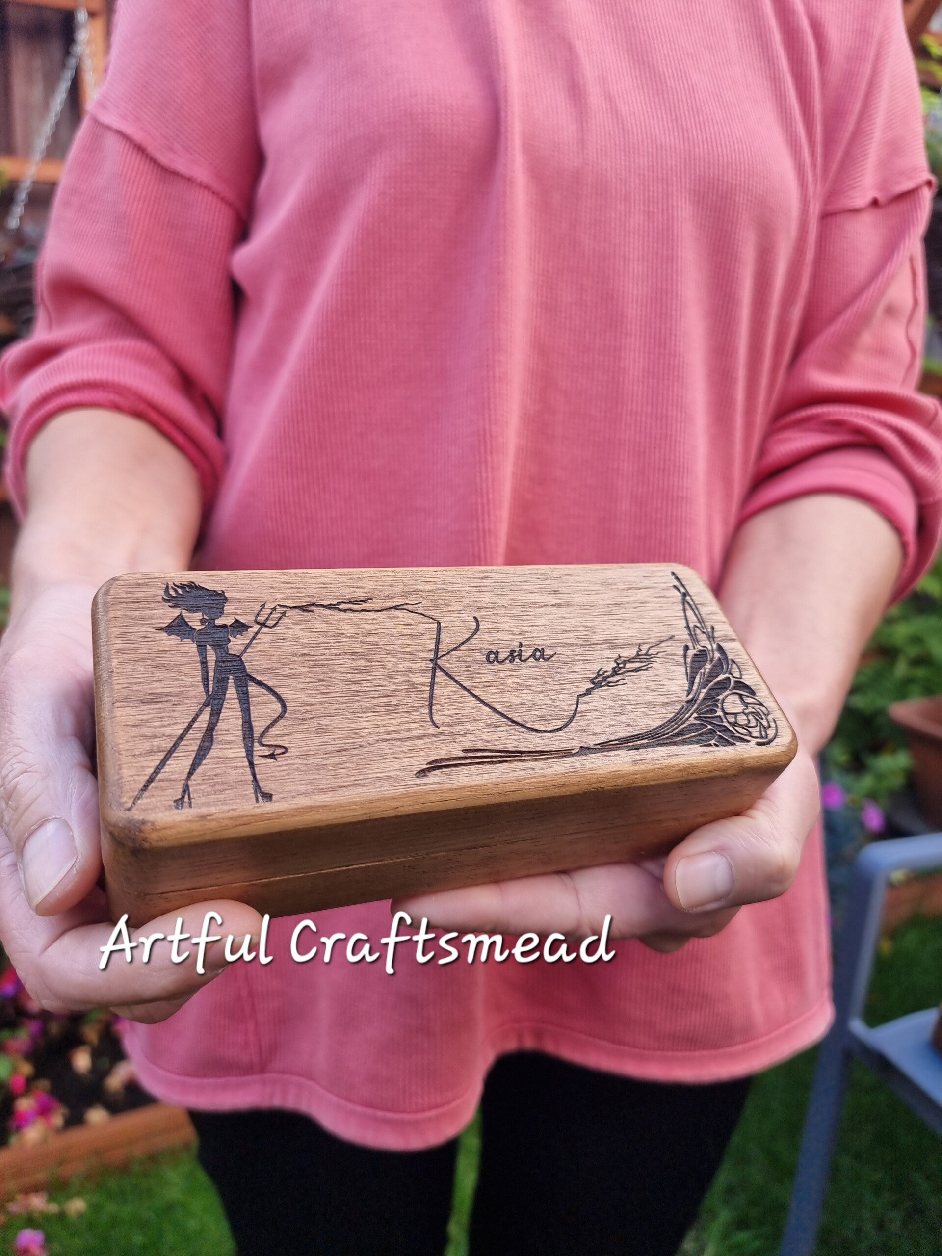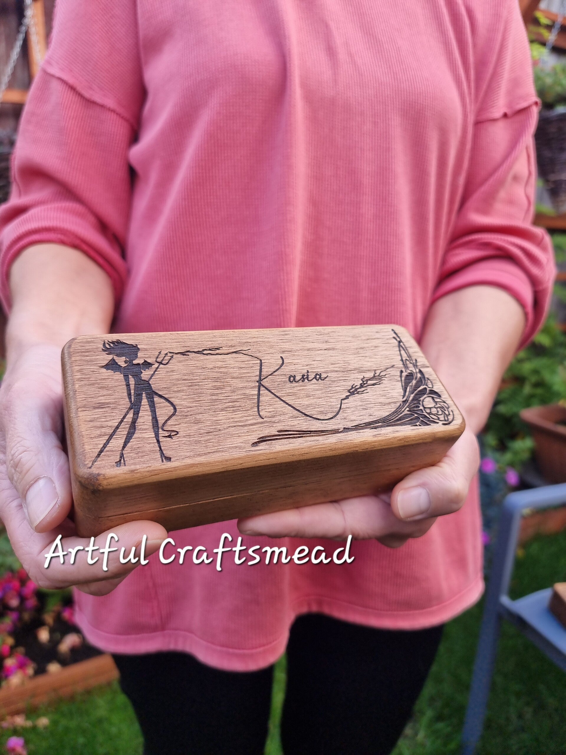 - **Beautiful Artwork**: The lid features a stunning floral corner ornament with a beautiful, seductive she-devil holding a trident from which a lightning bolt emerges, forming an electrifying name. The name of the recipient is elegantly incorporated into the design.