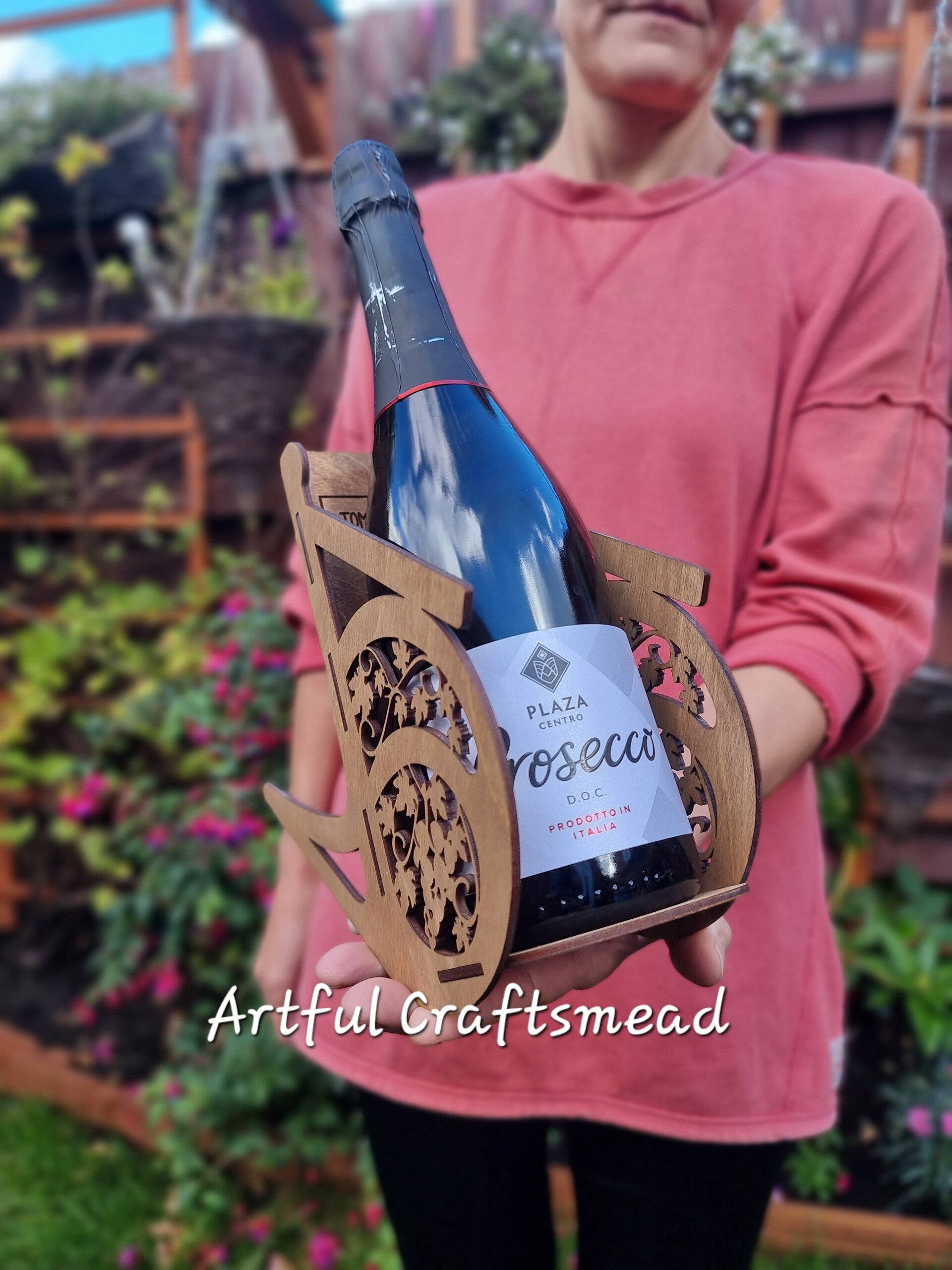 Introducing our exquisite **Wine Bottle Holder**, crafted from 3mm plywood and designed to add a touch of elegance to any setting. This unique holder features beautifully cut grapevine leaf patterns on its sides, giving it a sophisticated and artistic look. Shaped like a rocking chair, it provides a stable and stylish way to present your favorite bottle of wine or other alcohol.