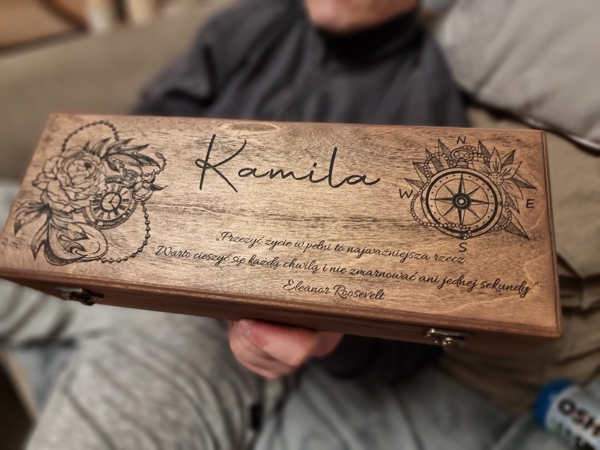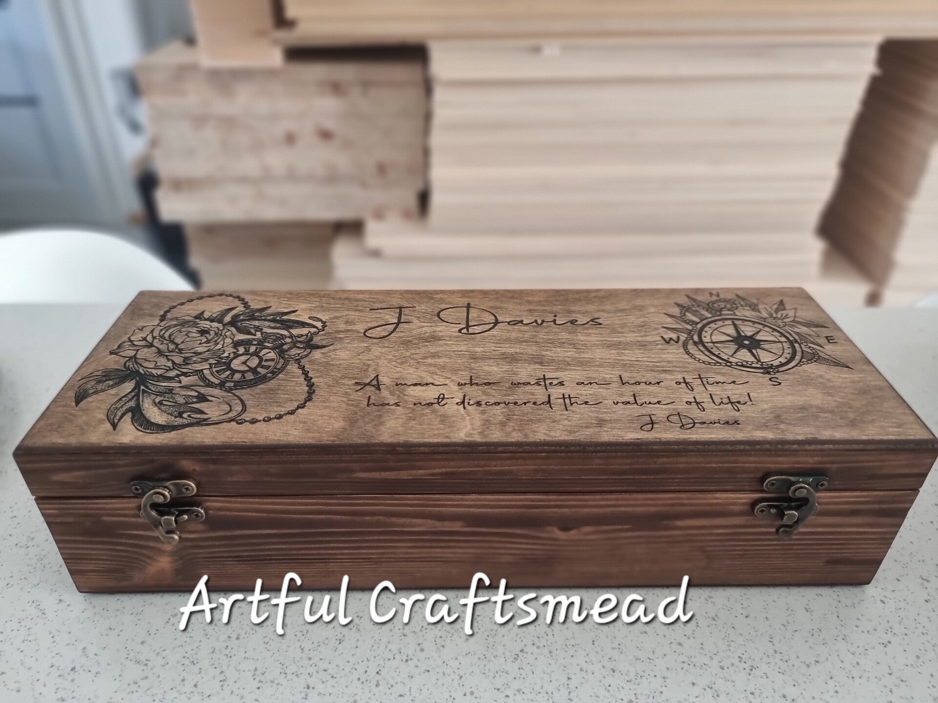 The wooden and engraved top with the name and quotes and beauty graphic, wooden exterior with soft felt and black or beige cushions, and metal locks add a clean, modern aesthetic to the watch box.