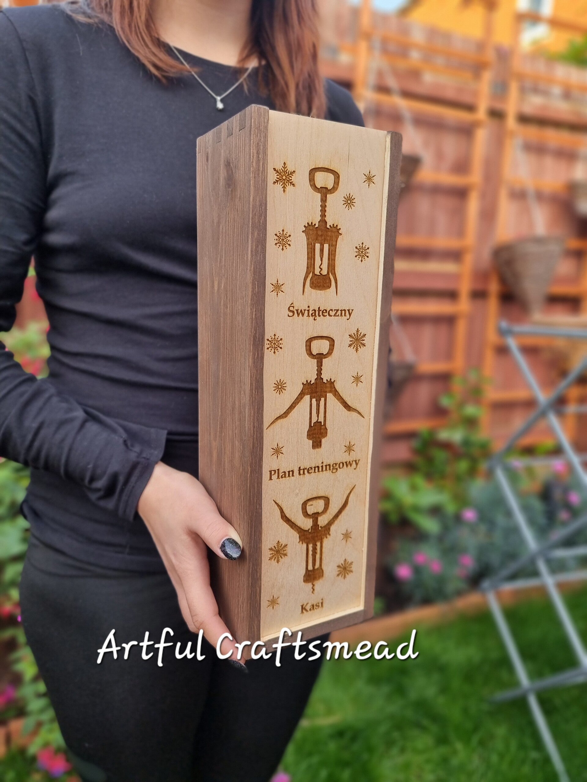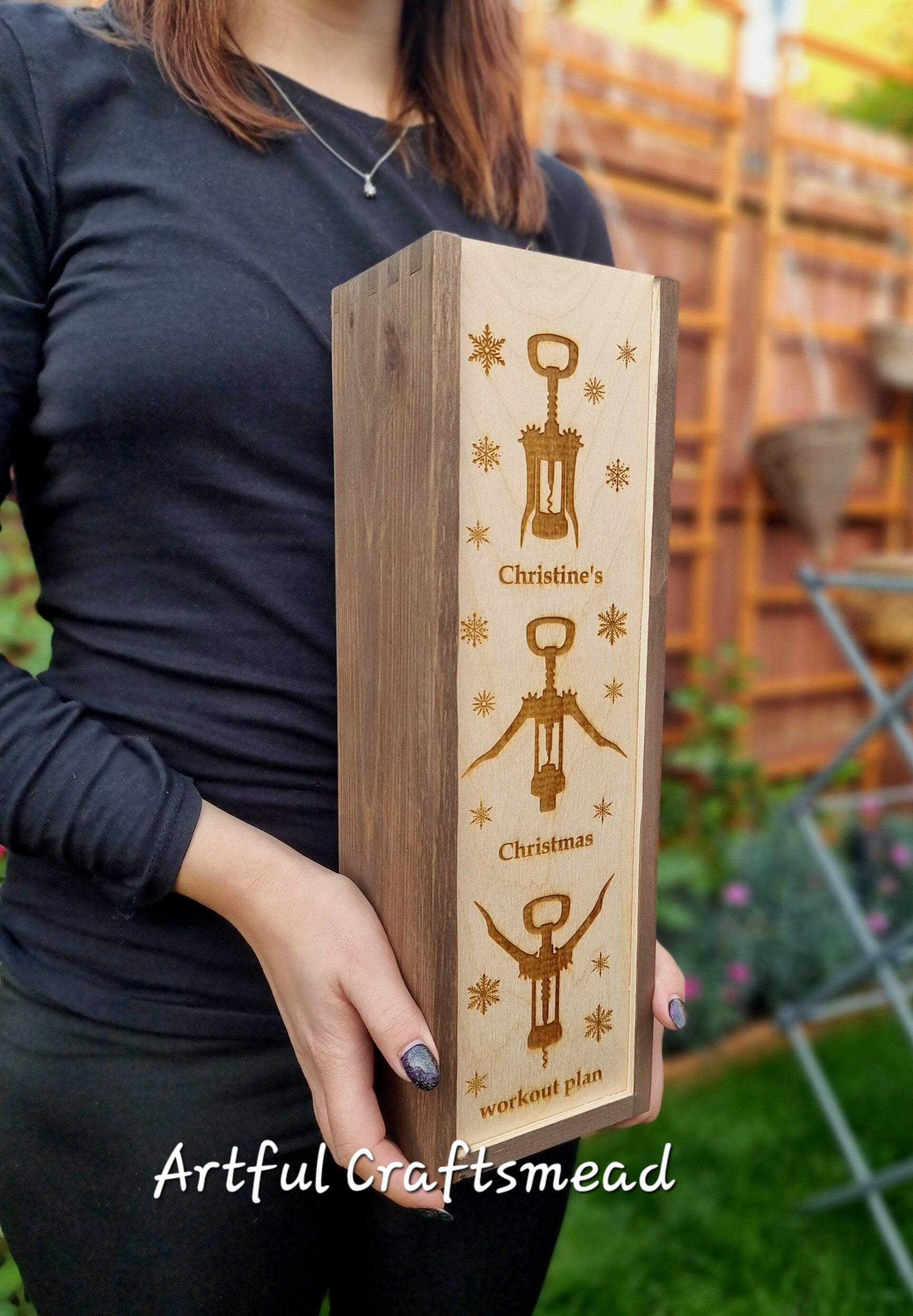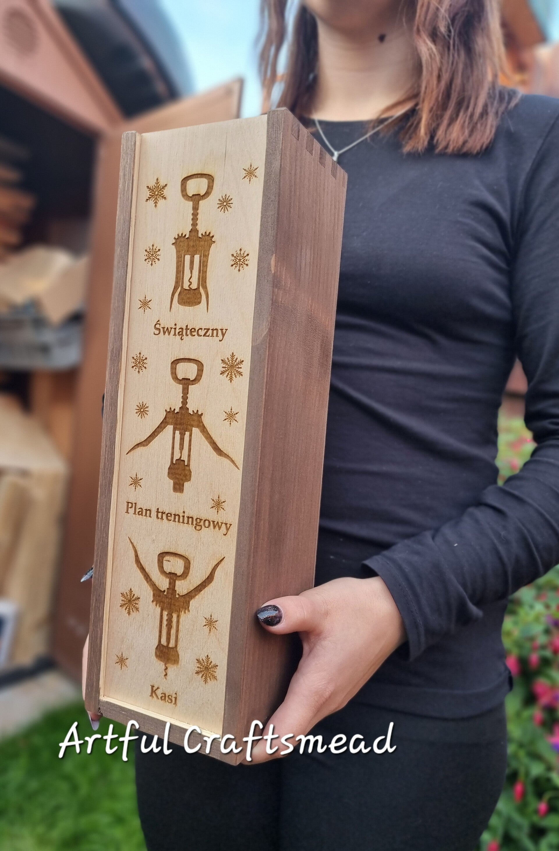 Make this Christmas extra special with our personalized wooden wine box, perfect for adding a touch of humor and charm to your holiday celebrations! This unique box opens by sliding the lid upwards, making it easy to insert your favorite bottle of wine (up to 33cm in height). The top features a jute rope handle for convenient carrying.