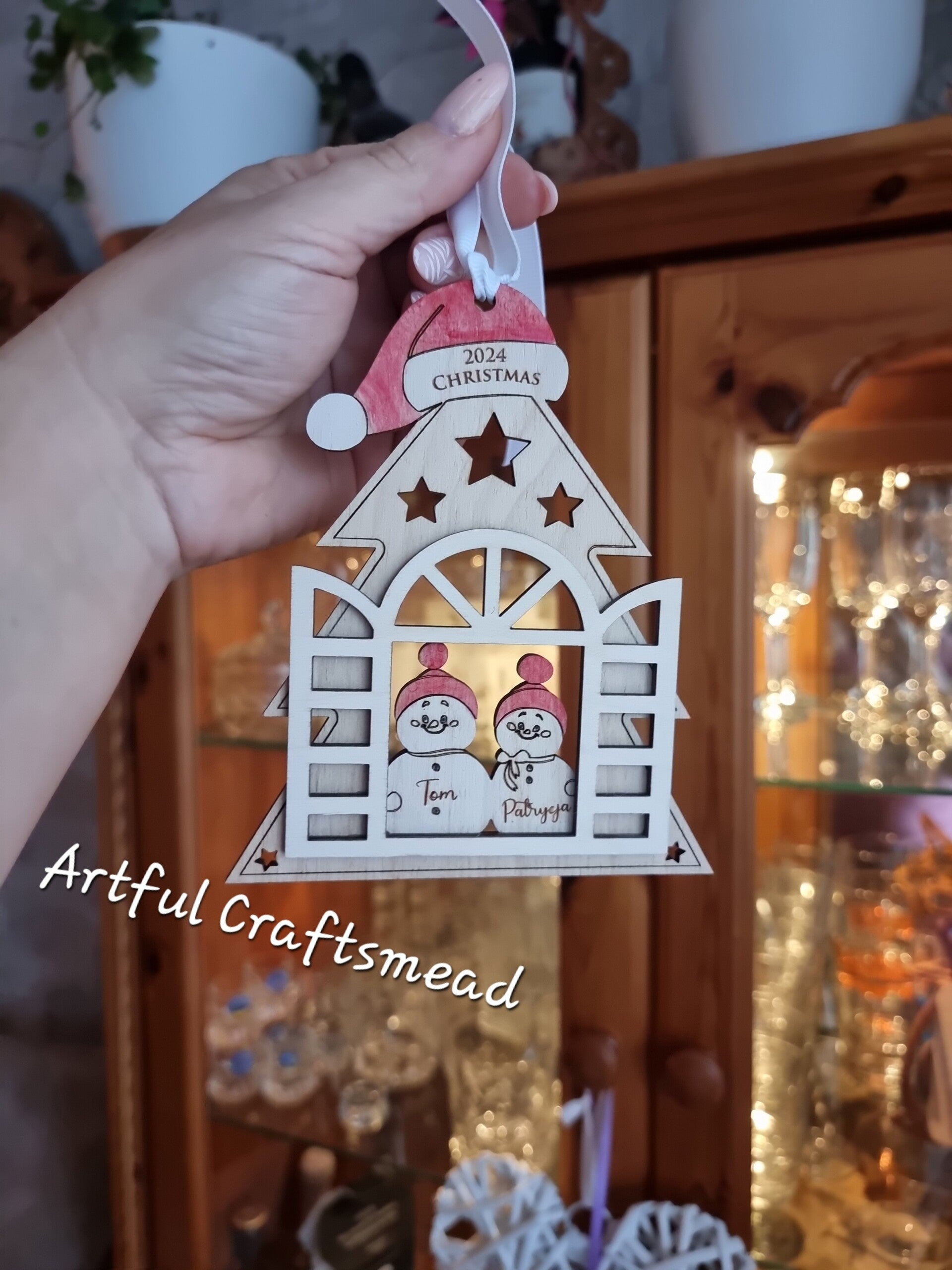 - **Unique Design:** Crafted from high-quality plywood, this ornament is shaped like a Christmas tree/house, topped with a Santa hat. In the center, it features windows with a family of snowmen peeking out – parents and children, each snowman can be personalized with a name.
