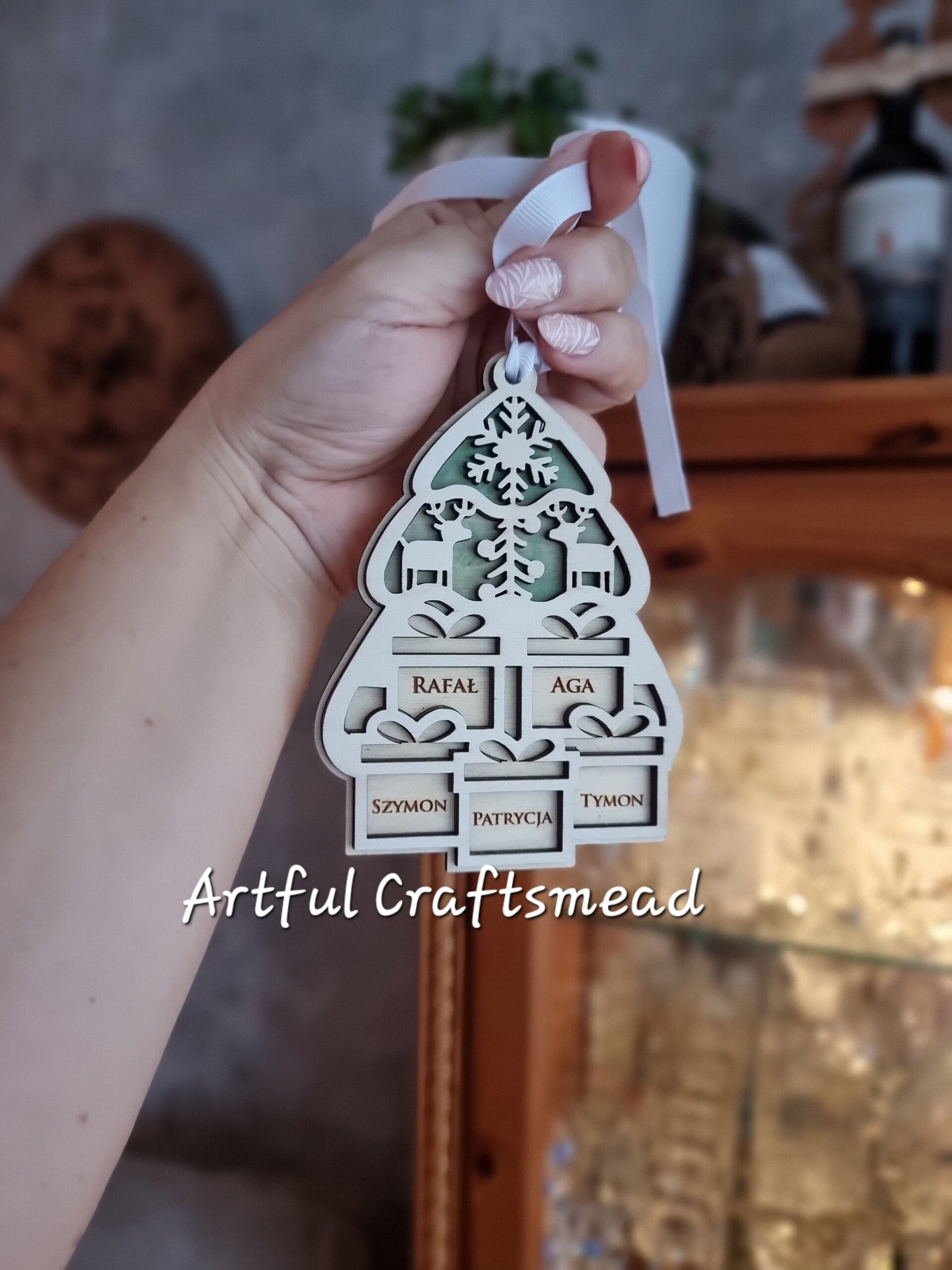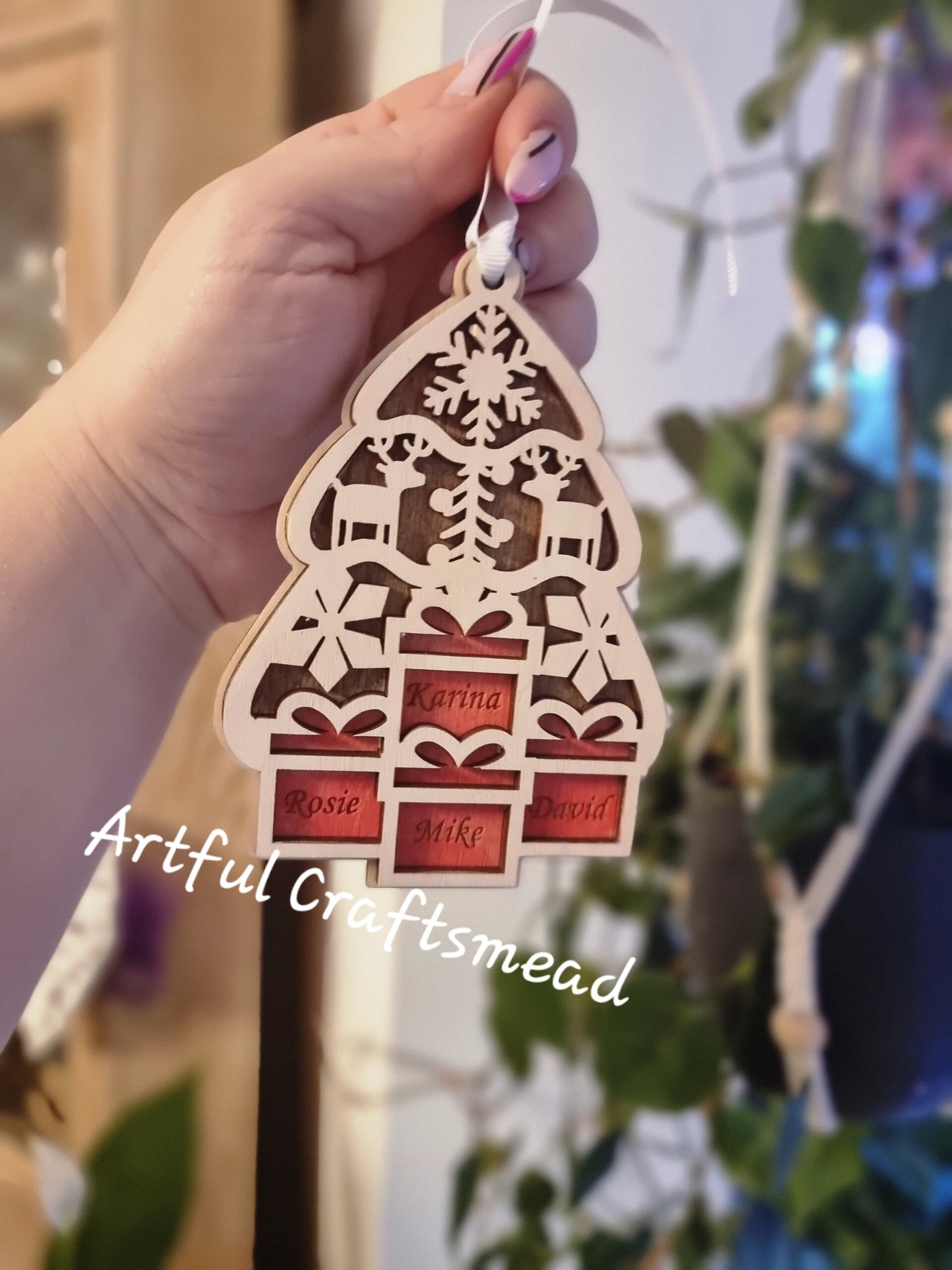 Personalized Wooden Christmas Ornament – A Unique Holiday Keepsake, Christmas Tree with Presents Shape with names family