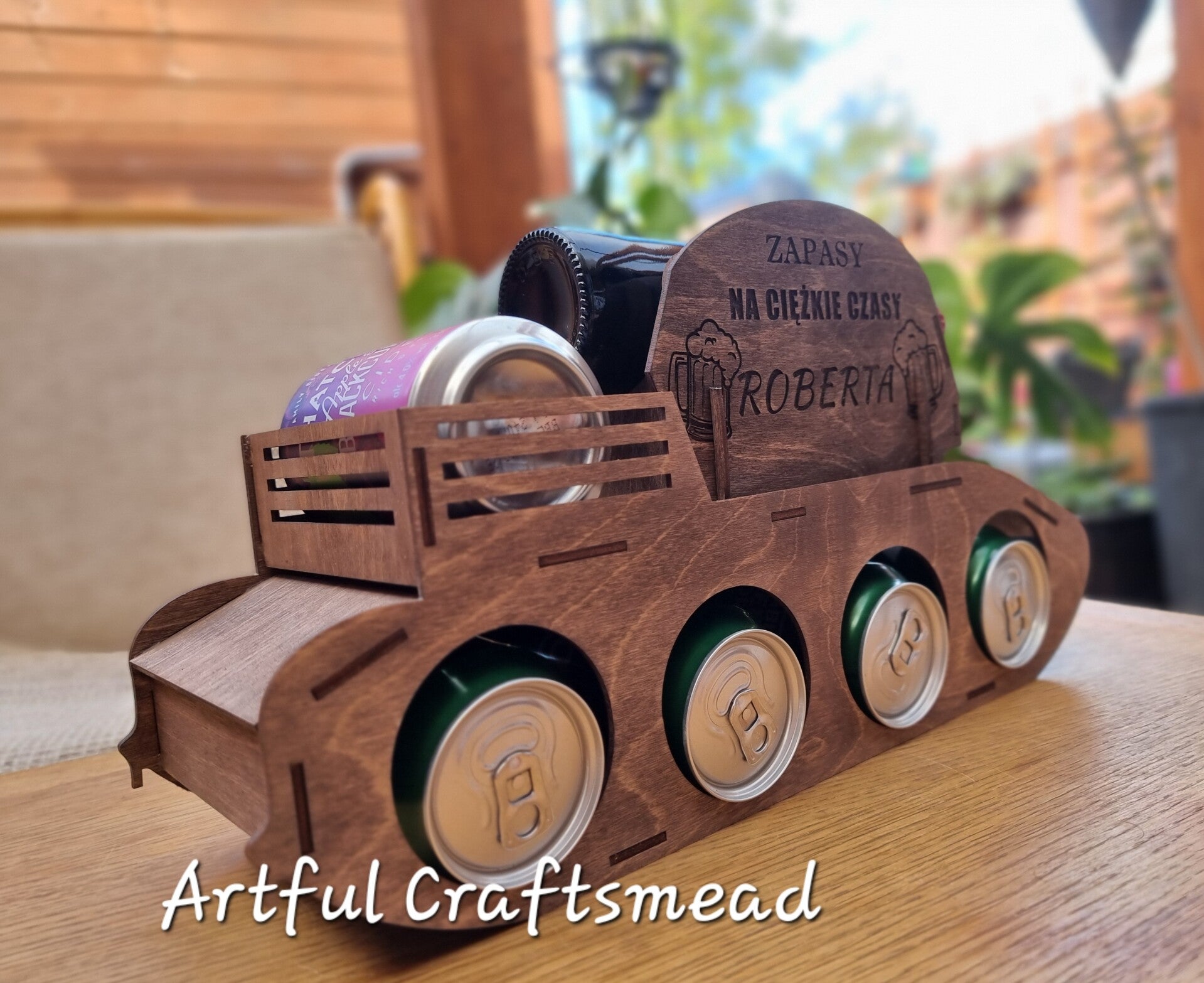 Personalized Wooden Beer Rack Holder – Unique Tank Design, Custom with name and message, Gift For All Occasion