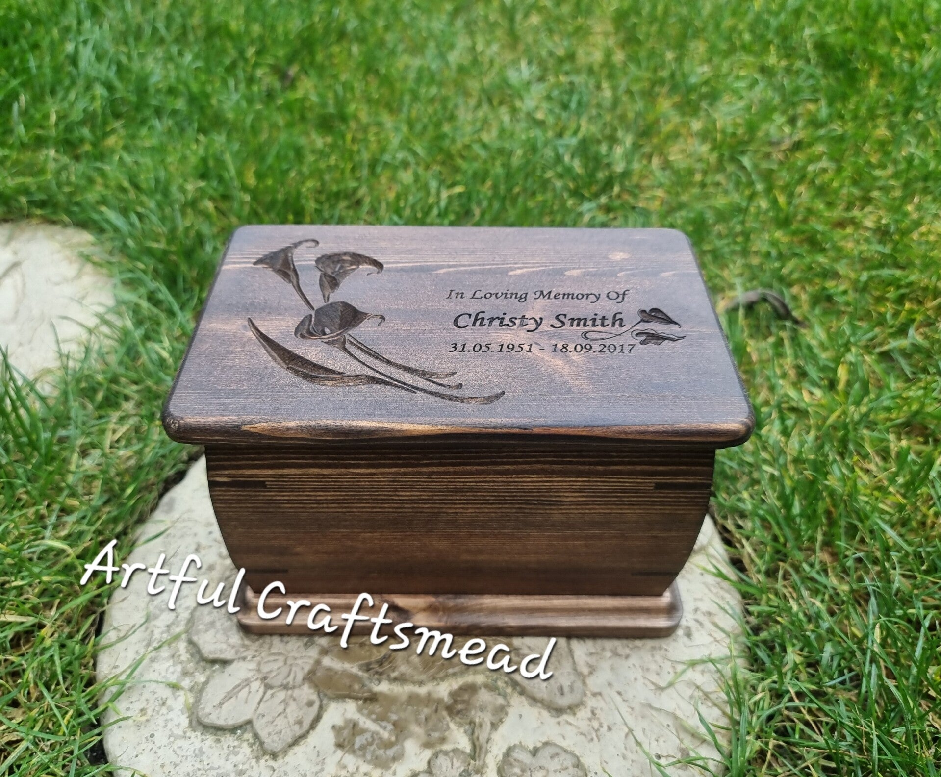 - **Intricate Detailing:** The lid is deeply engraved with elegant calla lilies, alongside the words "In Loving Memory," the name(s), and dates.