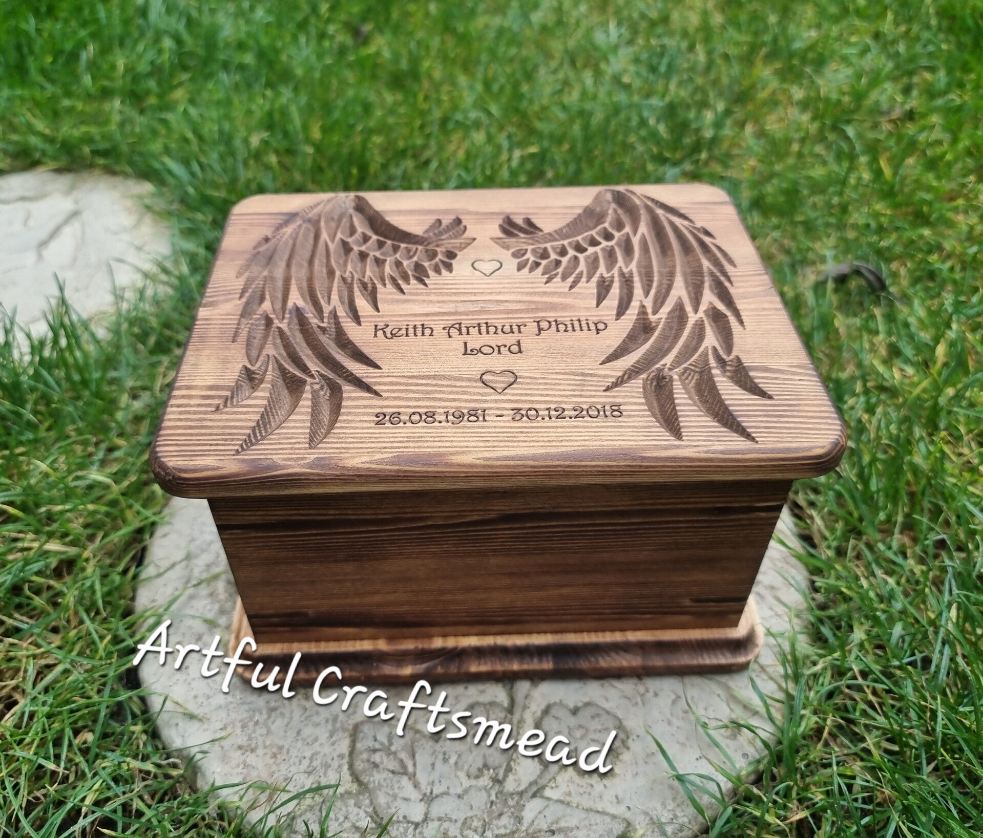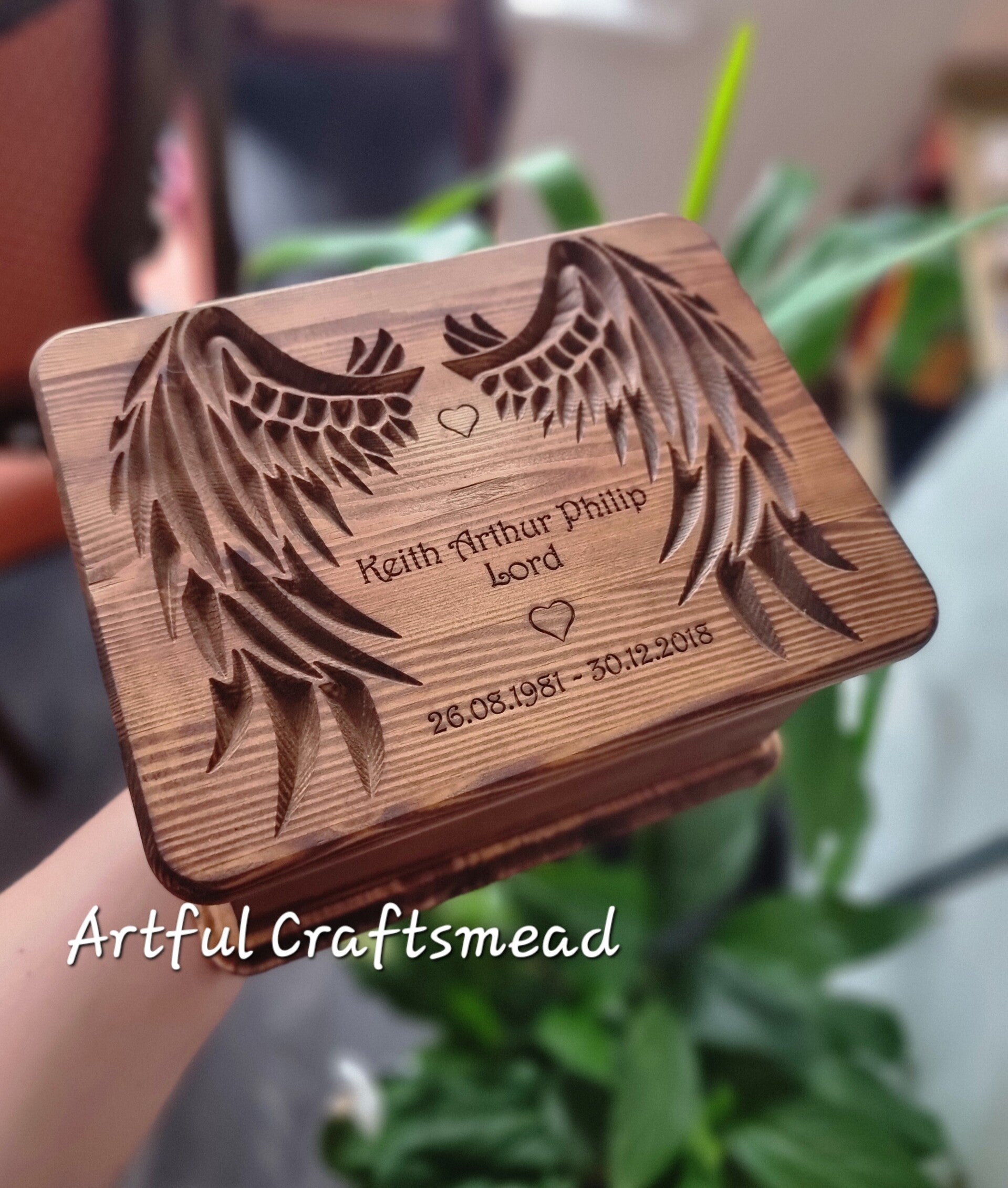 Personalised Wood Urn, Handcrafted Pine Wood Urn with Angel Wings Engraving, With Names And Date