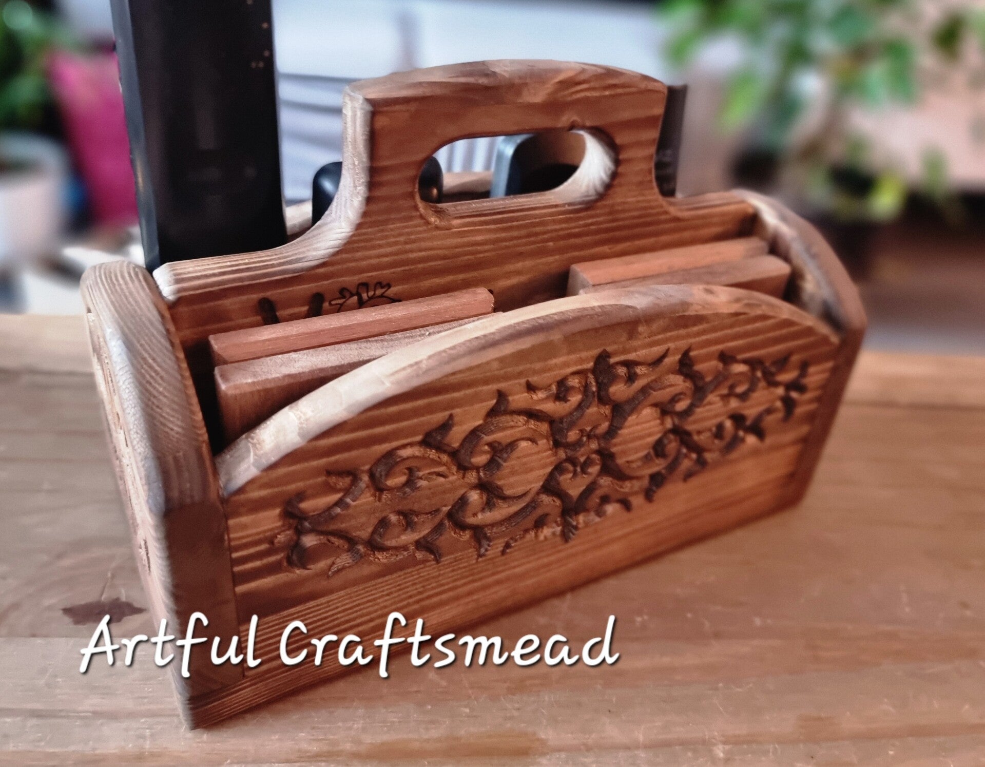 Handcrafted Pine Wood Remote Holder with Ornate Carvings**