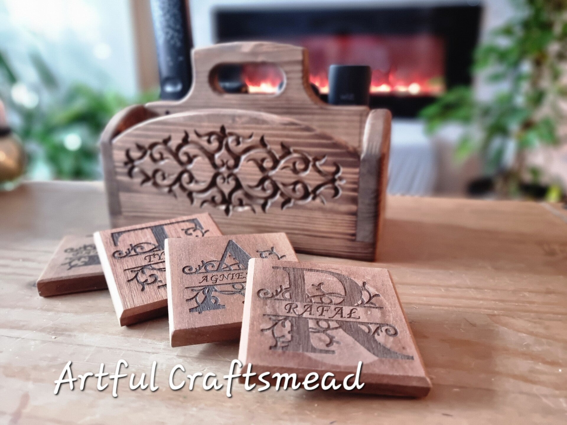 Handcrafted Pine Wood Remote Holder with Ornate Carvings, Remote Organizer and Coasters, Personalised Holder Basket