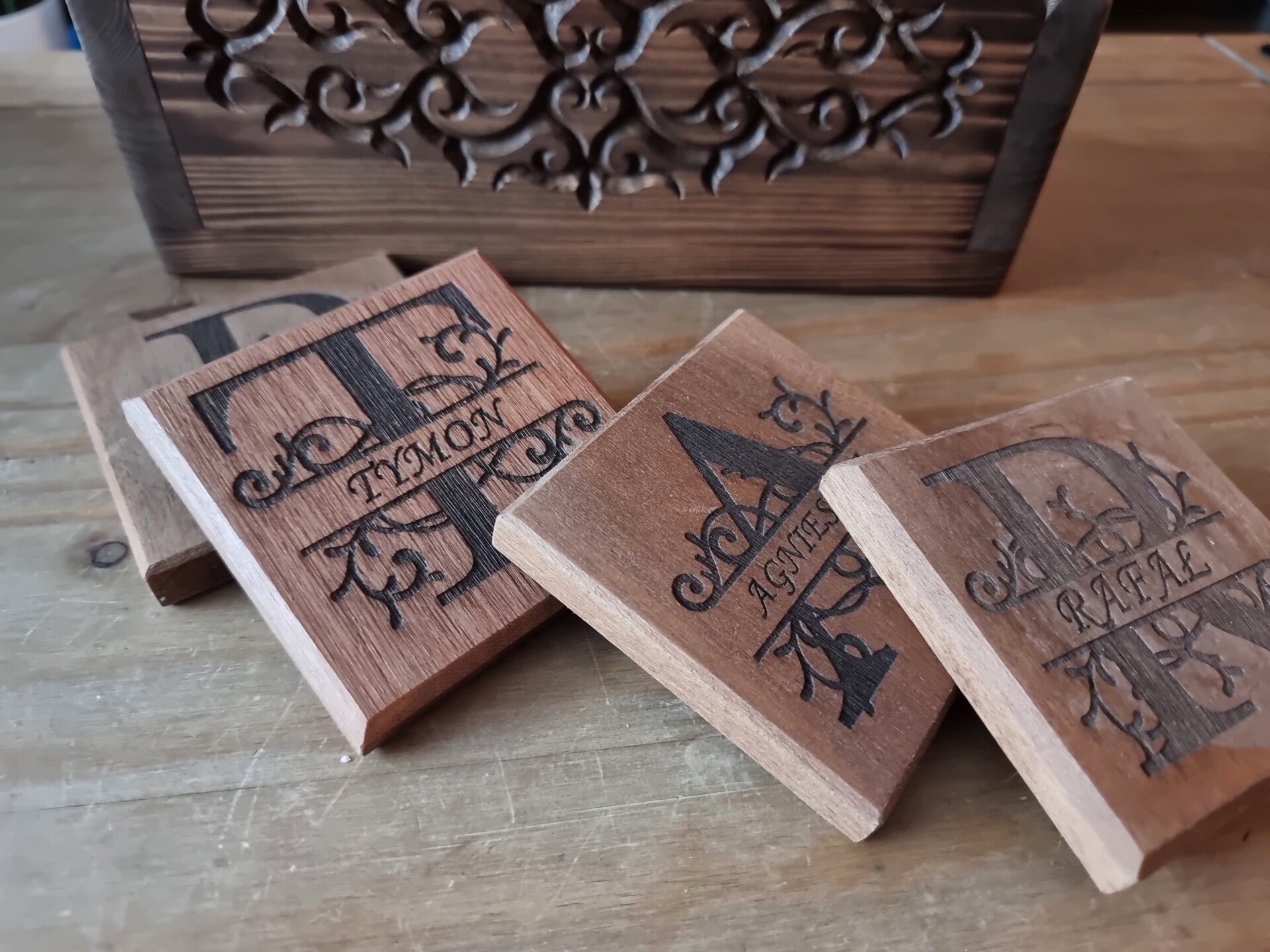 - **Additional Option:** Purchase matching hardwood coasters with beautifully engraved names.