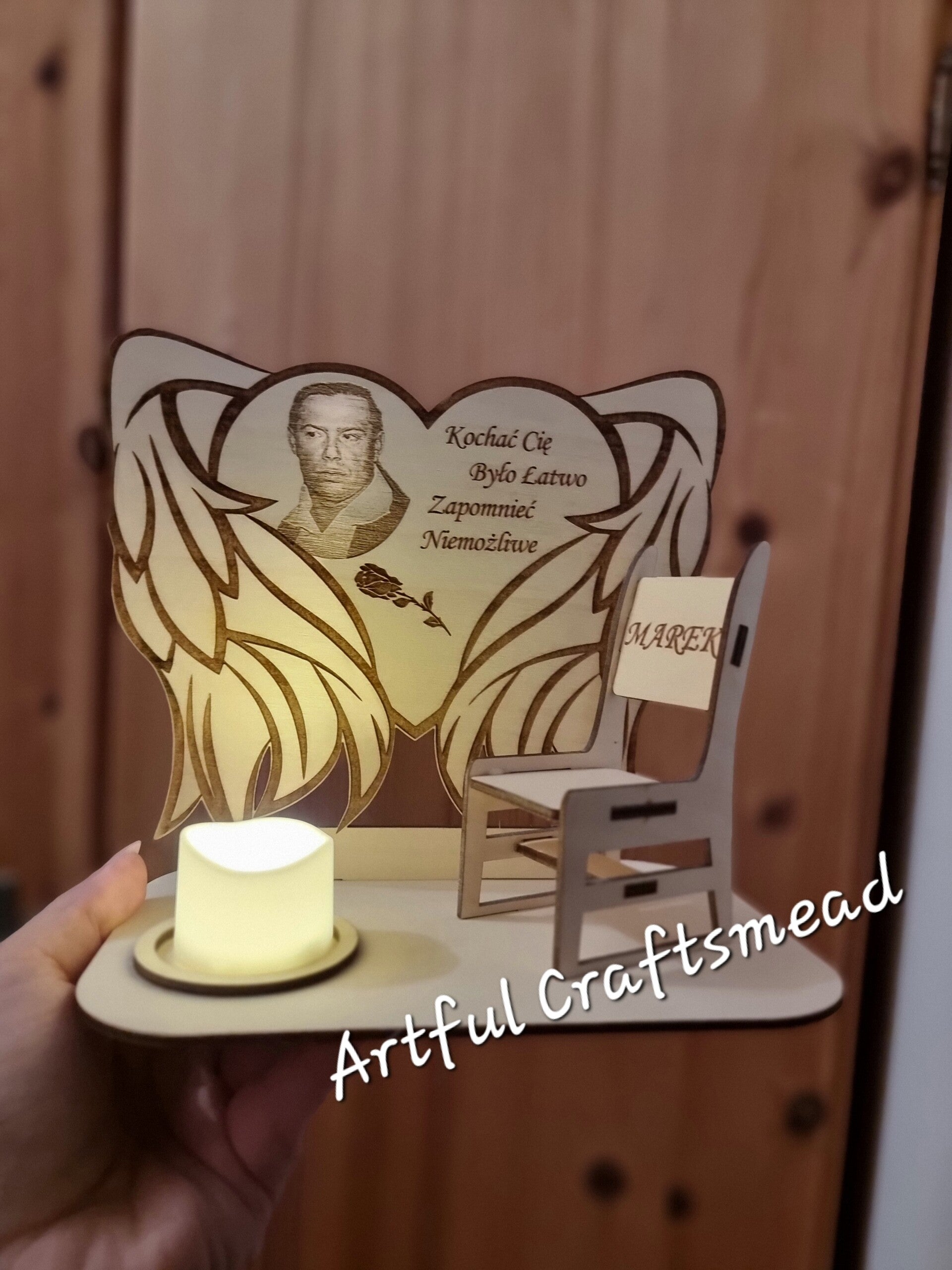 Introducing our exquisite, handcrafted heart wrapped in angel wings, symbolizing the protection and love of an angel. This memorial piece is designed to honor the memory of a loved one who has passed away. Made from high-quality plywood, this heart stands on a base with an empty chair beside it, engraved with the name of your loved one.