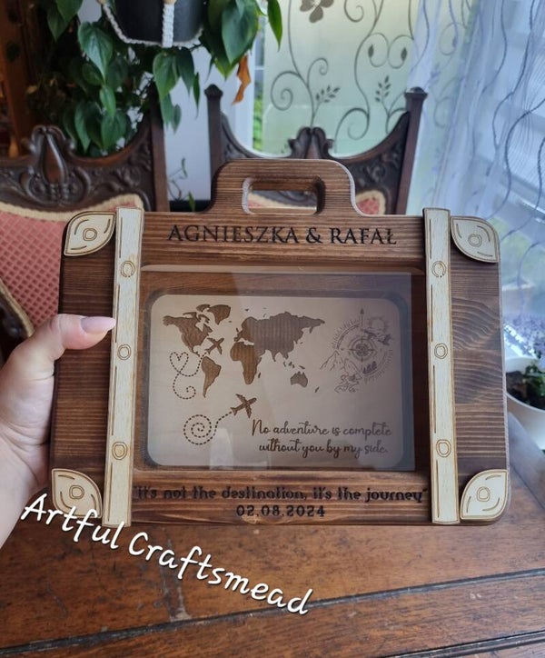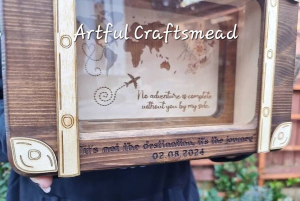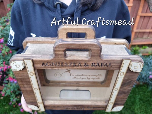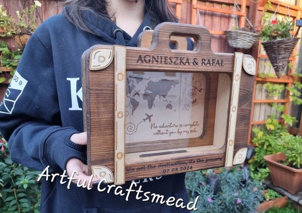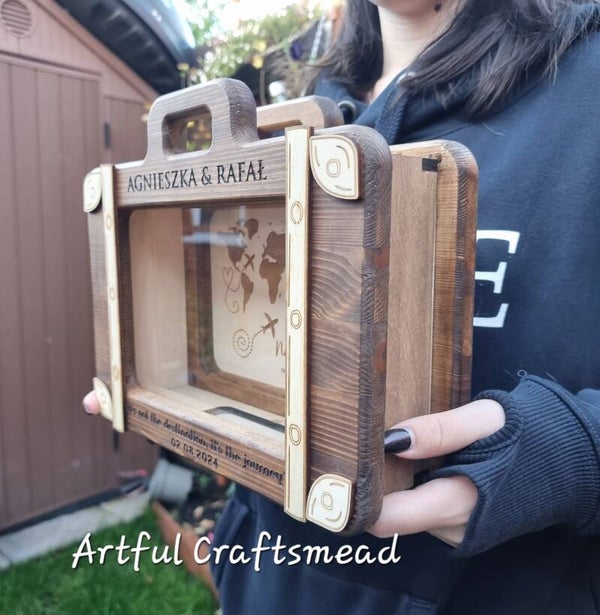 Personalized Wooden Suitcase Piggy Bank – The Perfect Gift for Couples,