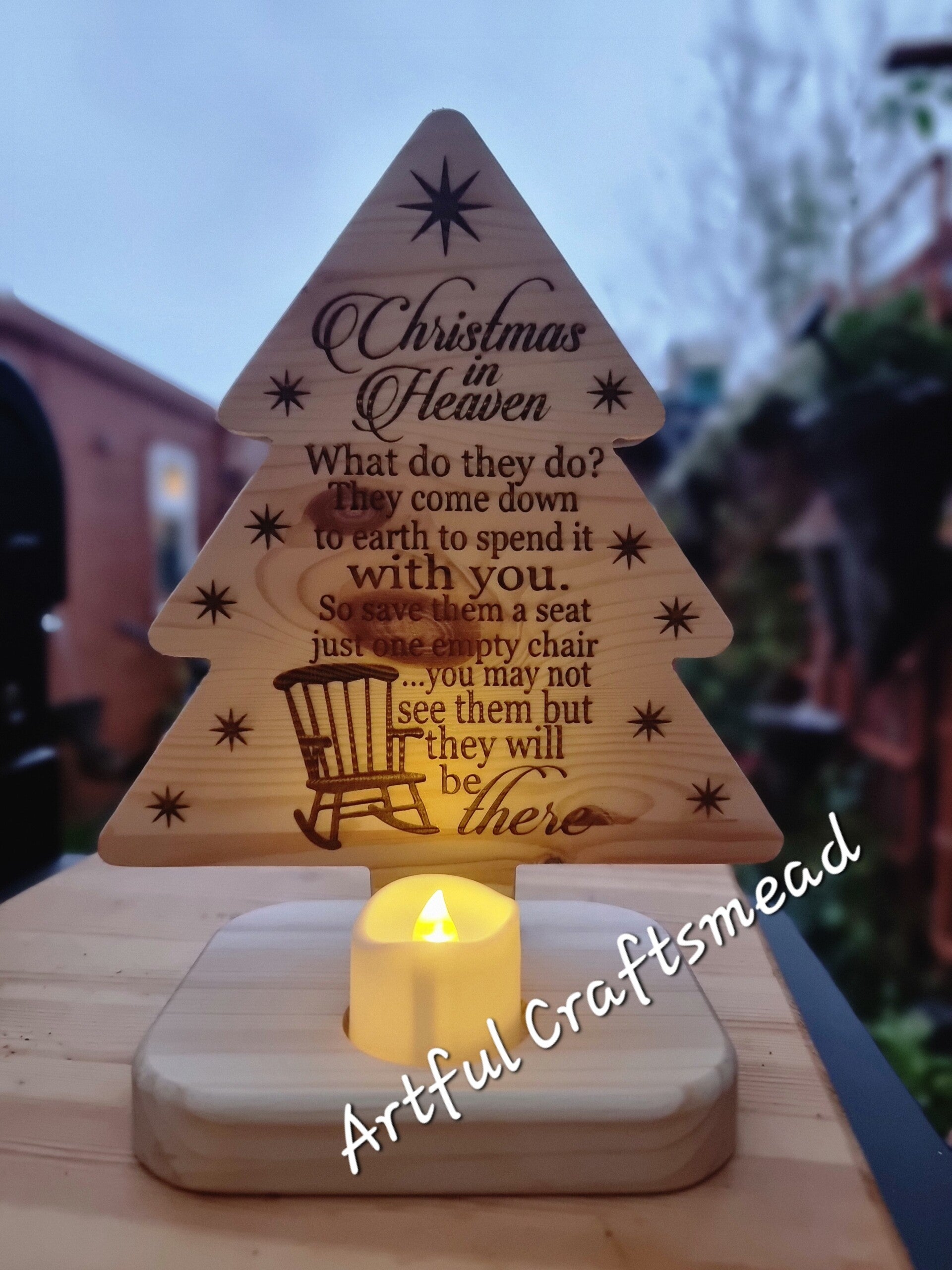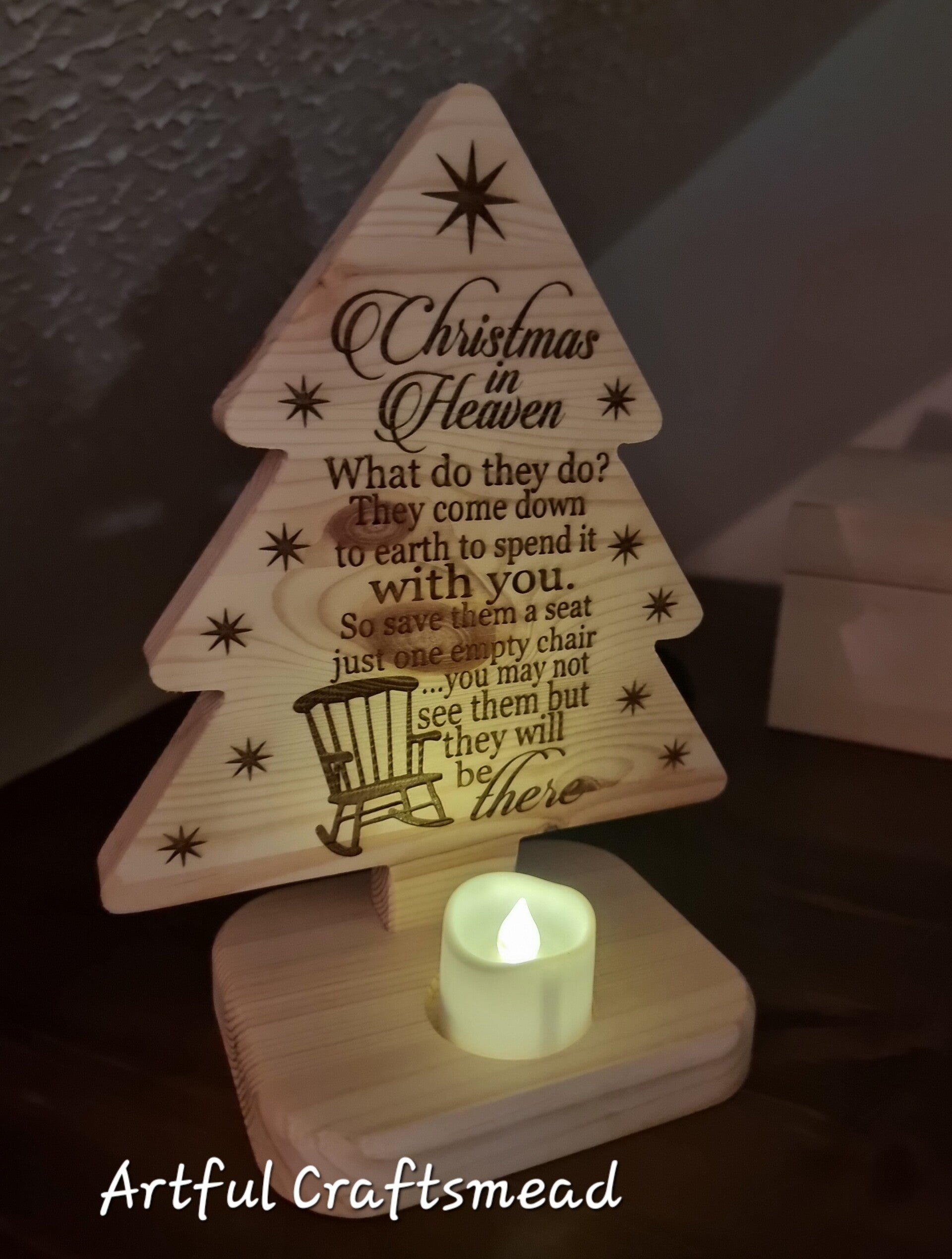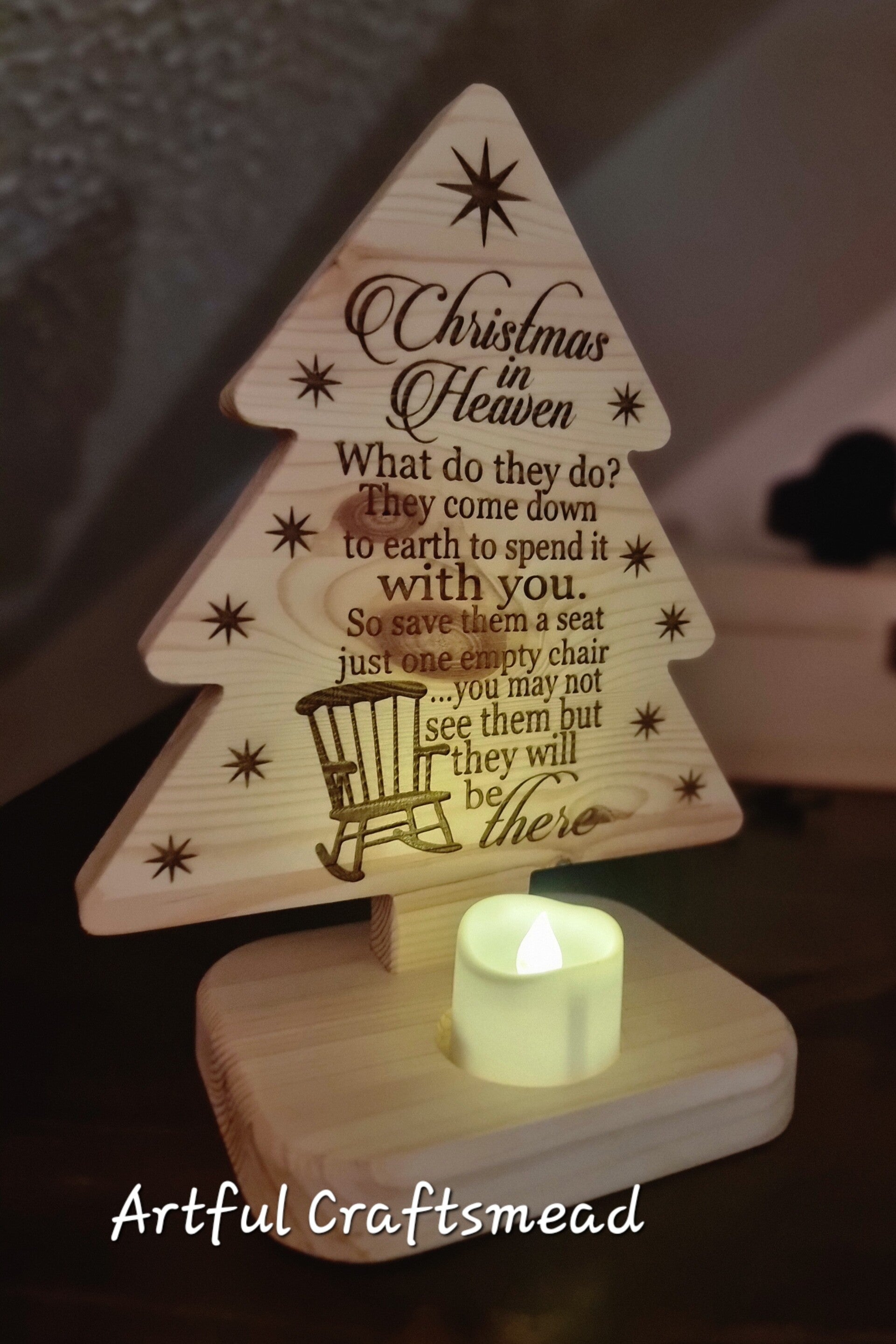 **Keywords**: Christmas in Heaven, wooden pine tree, memorial Christmas tree, engraved Christmas decoration, holiday decor, pine wood tree, lighted Christmas tree, handcrafted Christmas decor, remembrance tree, Christmas memorial gift.