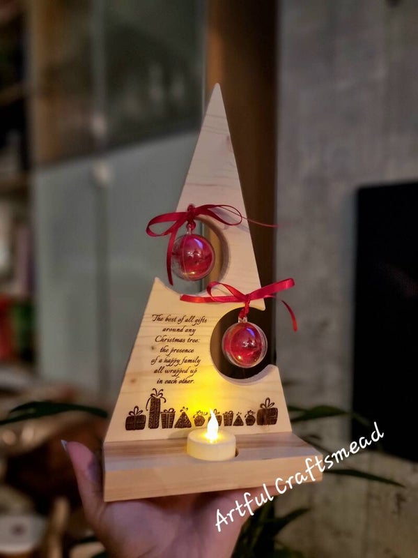 Personalised Beautiful Wooden Christmas Tree with Tealight and Baubles - Perfect Festive Decor, Solid Wood Tree