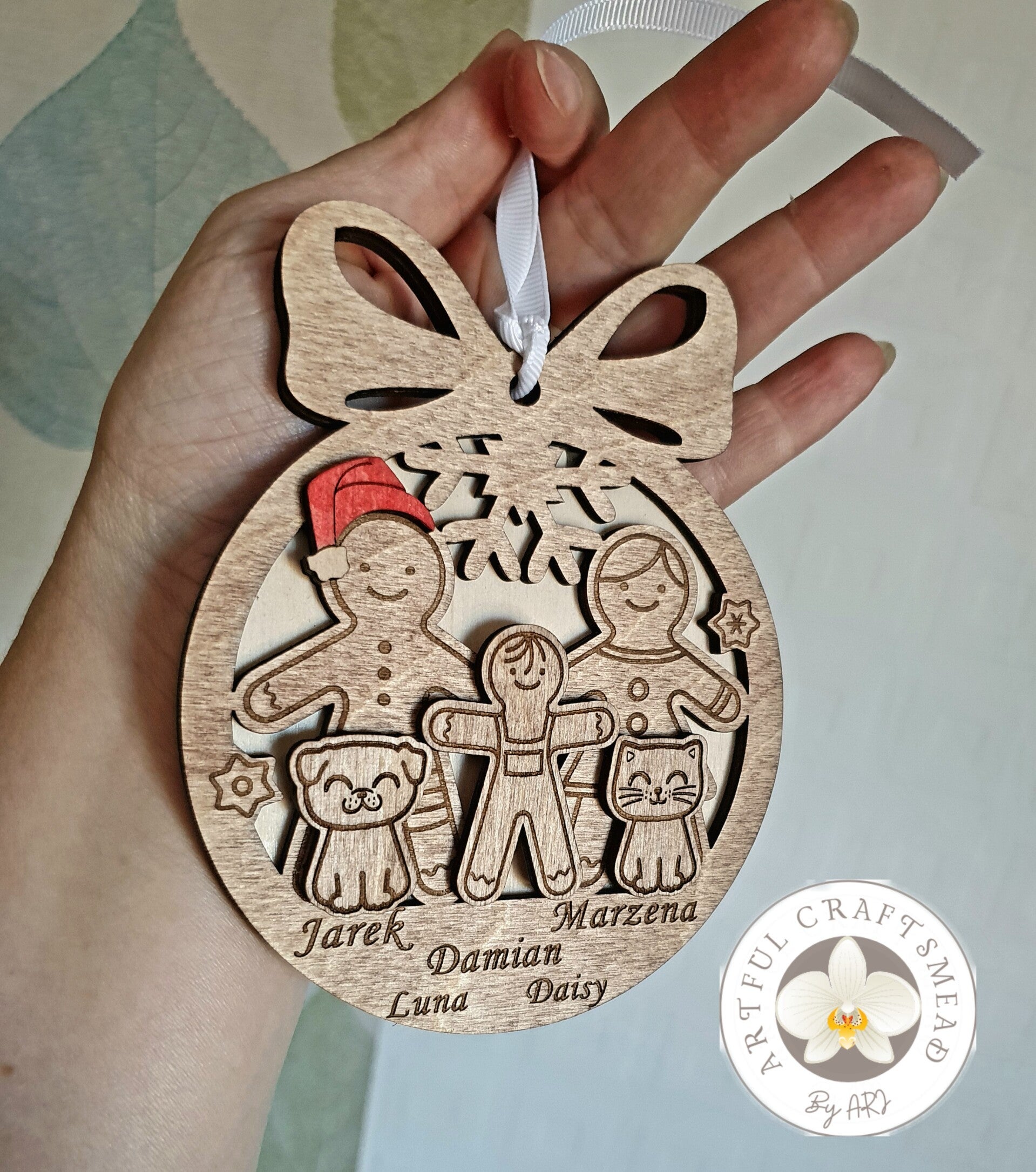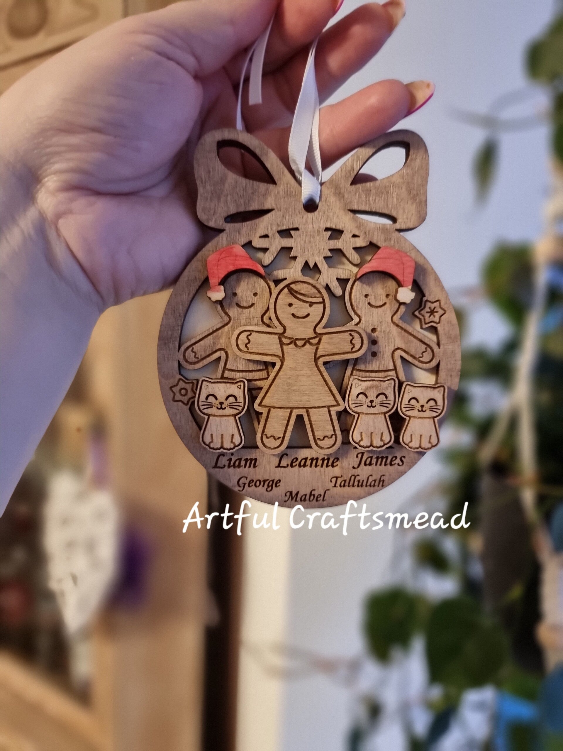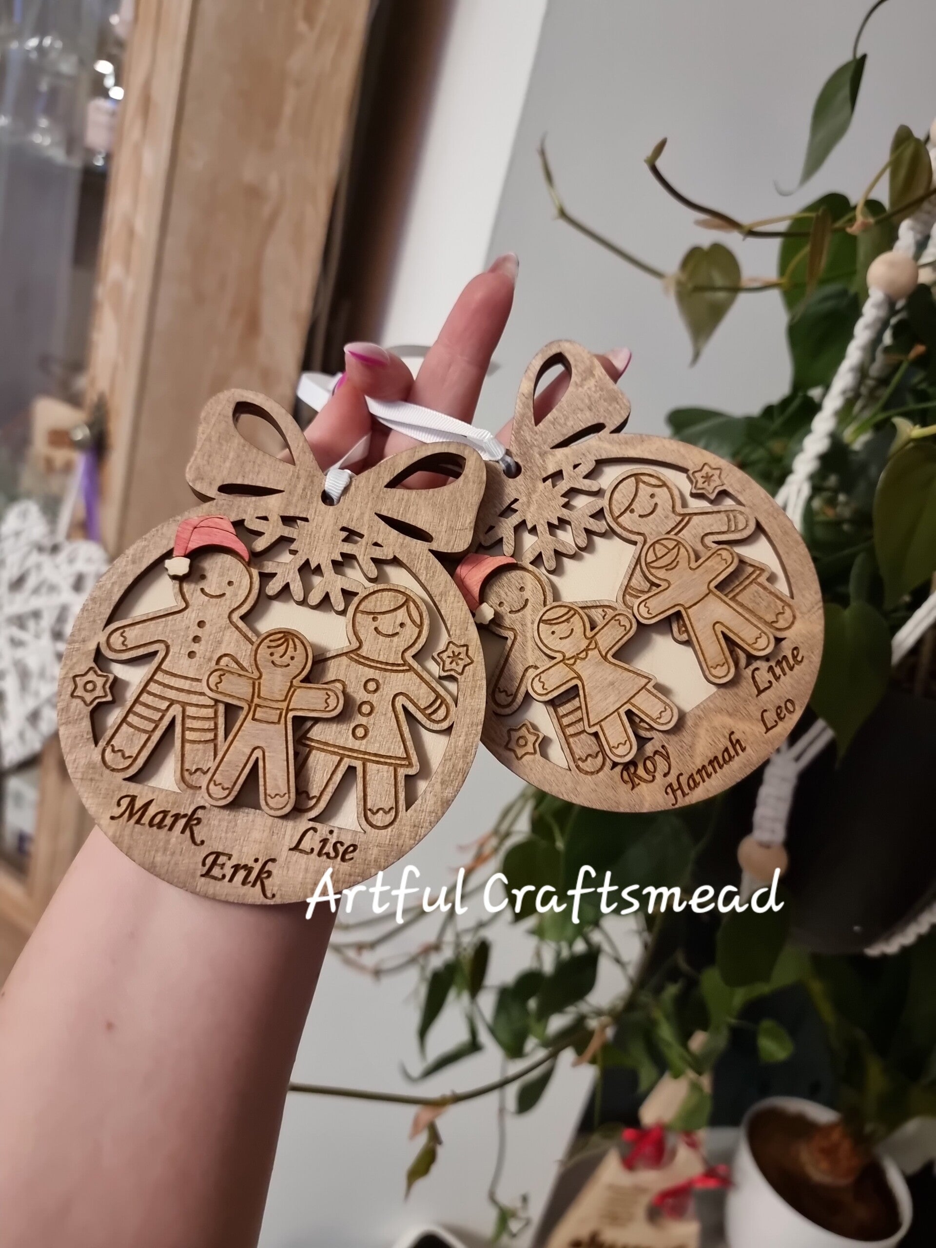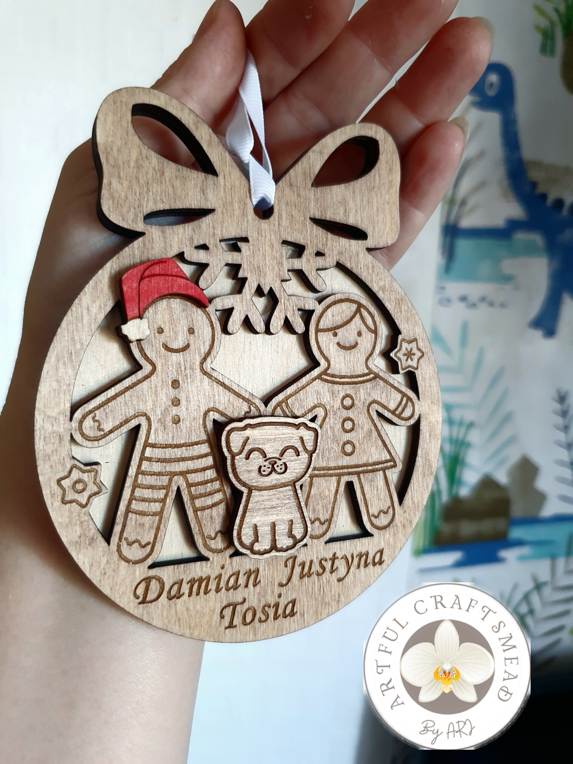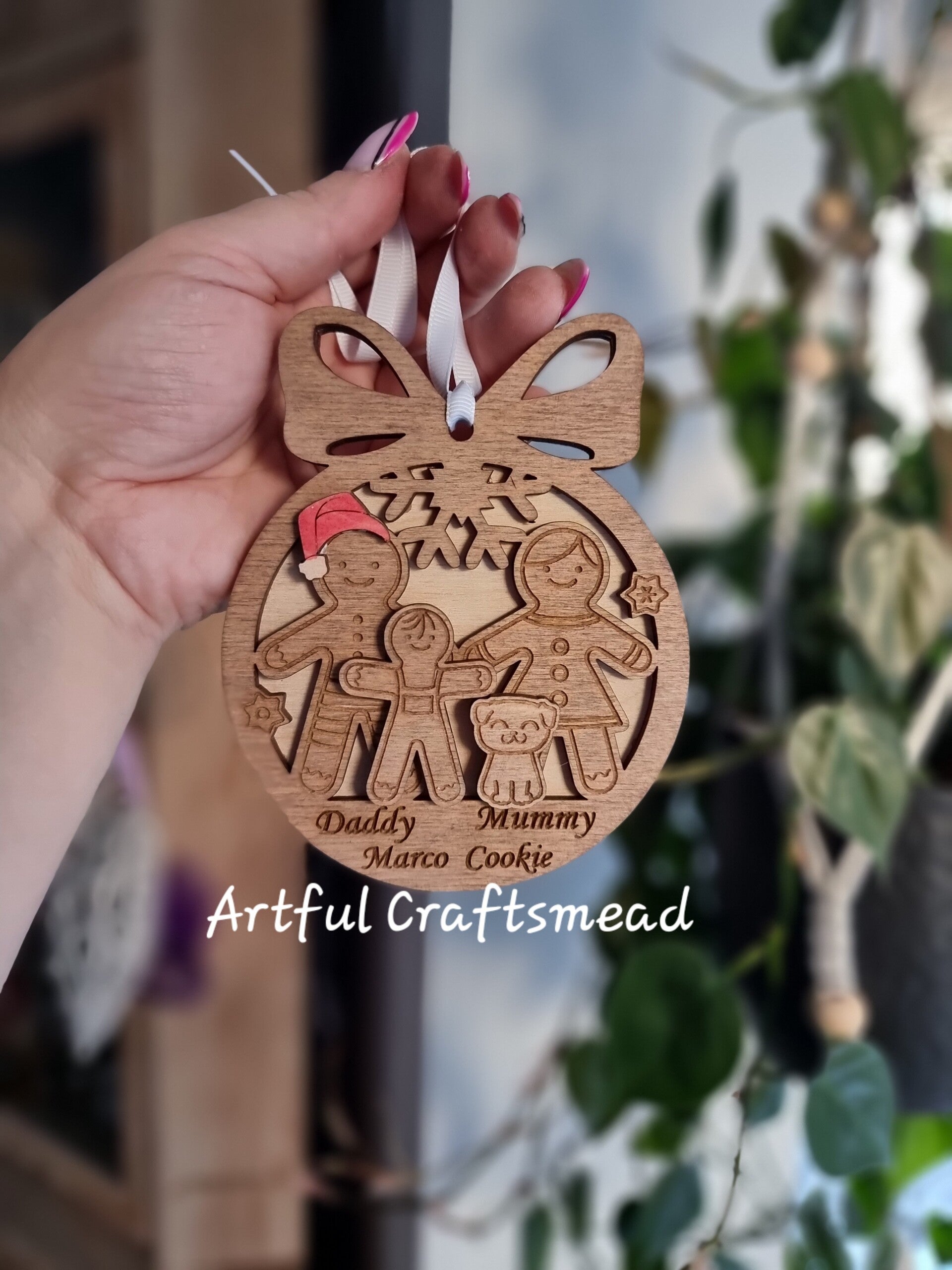 Gingerbread Family Bauble, Christmas Decoration, Personalised Wooden Bauble , Engraved Xmas Ornament, Christmas Tree