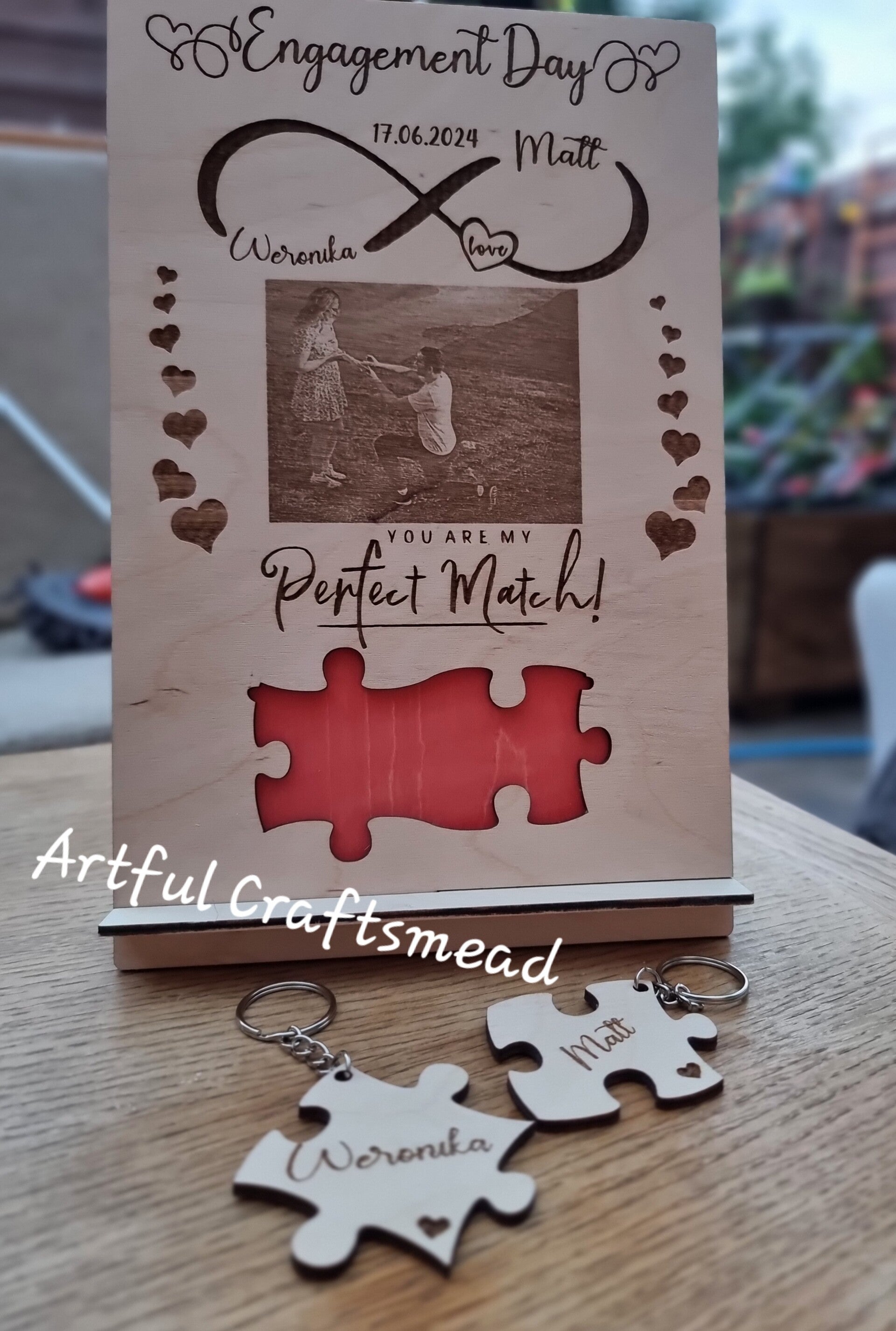 Surprise Puzzle: At the bottom, there’s a delightful surprise – puzzle pieces engraved with your names that can be removed and used as keychains. But don’t worry, removing the pieces won’t leave a hole; a red-painted backing board ensures a charming red shape of the puzzle remains visible.
