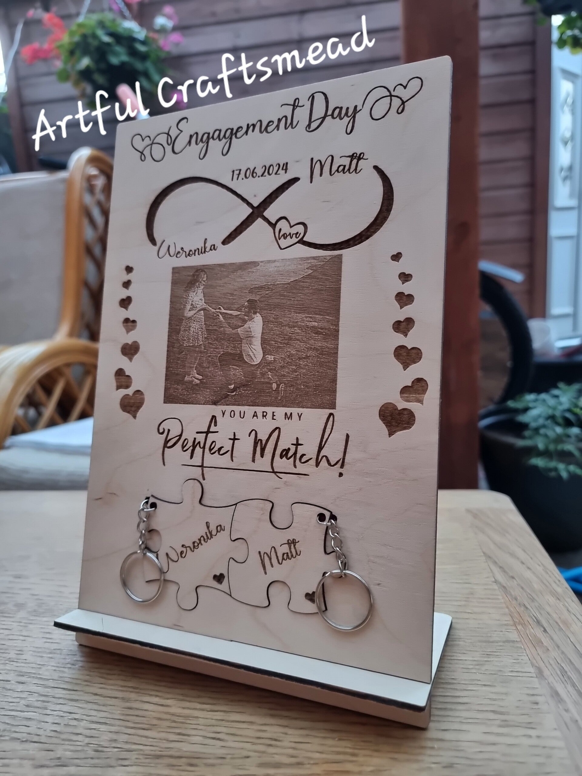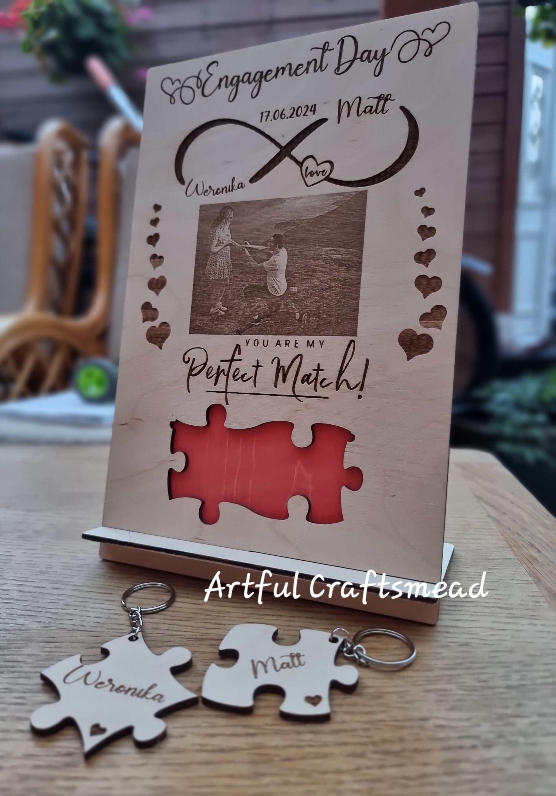 Personalised Engagement Plaque with Photo and Puzzle Keychains, Unique Gift For Couple With Names and Date