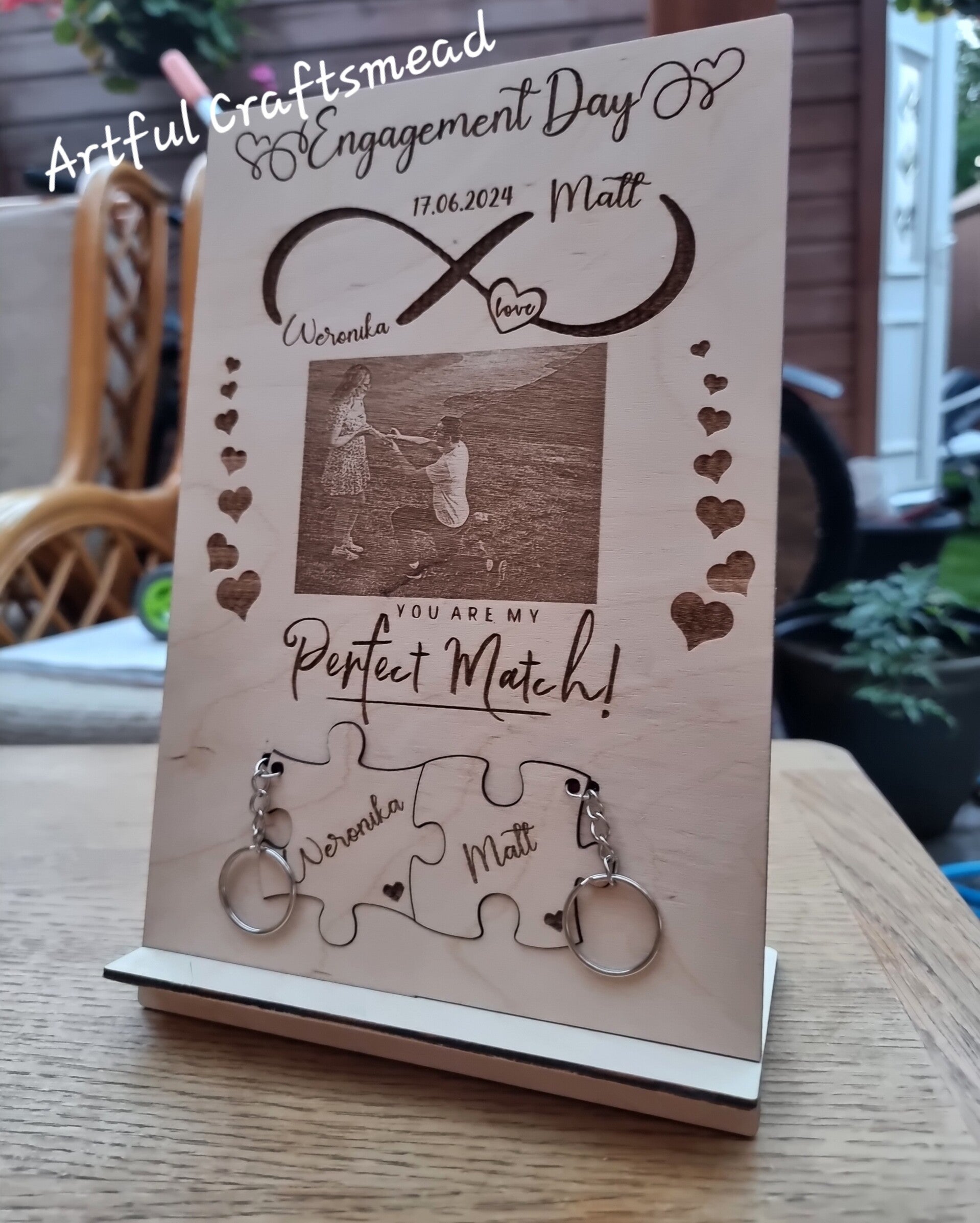 Elegant Design: The plaque features an engraved photo of the happy couple, with “Engagement Day” at the top and your names and date beautifully incorporated into an infinity symbol. It’s like capturing your love story in wood!
