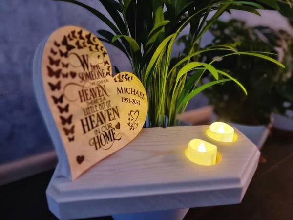 This unique wooden heart-shaped tealight holder is more than just a decorative piece—it’s a cherished tribute to someone special. Made from solid pine wood, this memorial holder boasts a one-of-a-kind design: