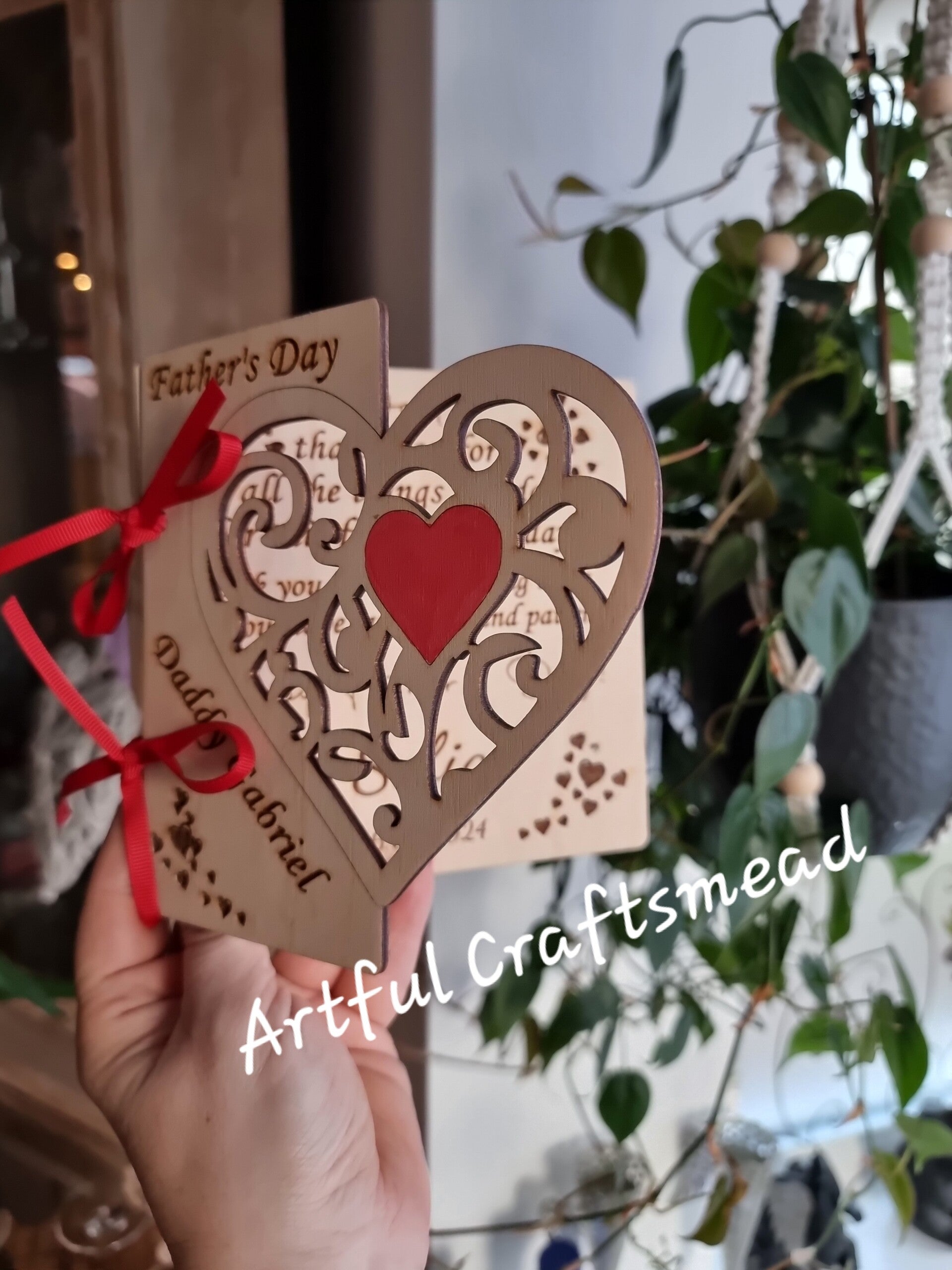 To nie jest zwykła kartka — to pamiątka, którą twój tata będzie pielęgnował na zawsze. Każda kartka jest misternie zaprojektowana z ażurową okładką z wyciętym sercem wykonanym z różnych wzorów. Wewnątrz serca znajduje się ręcznie malowane czerwone serce z wygrawerowanym napisem daty, imienia twojego taty i specjalnego tytułu Dnia Ojca. ❤️