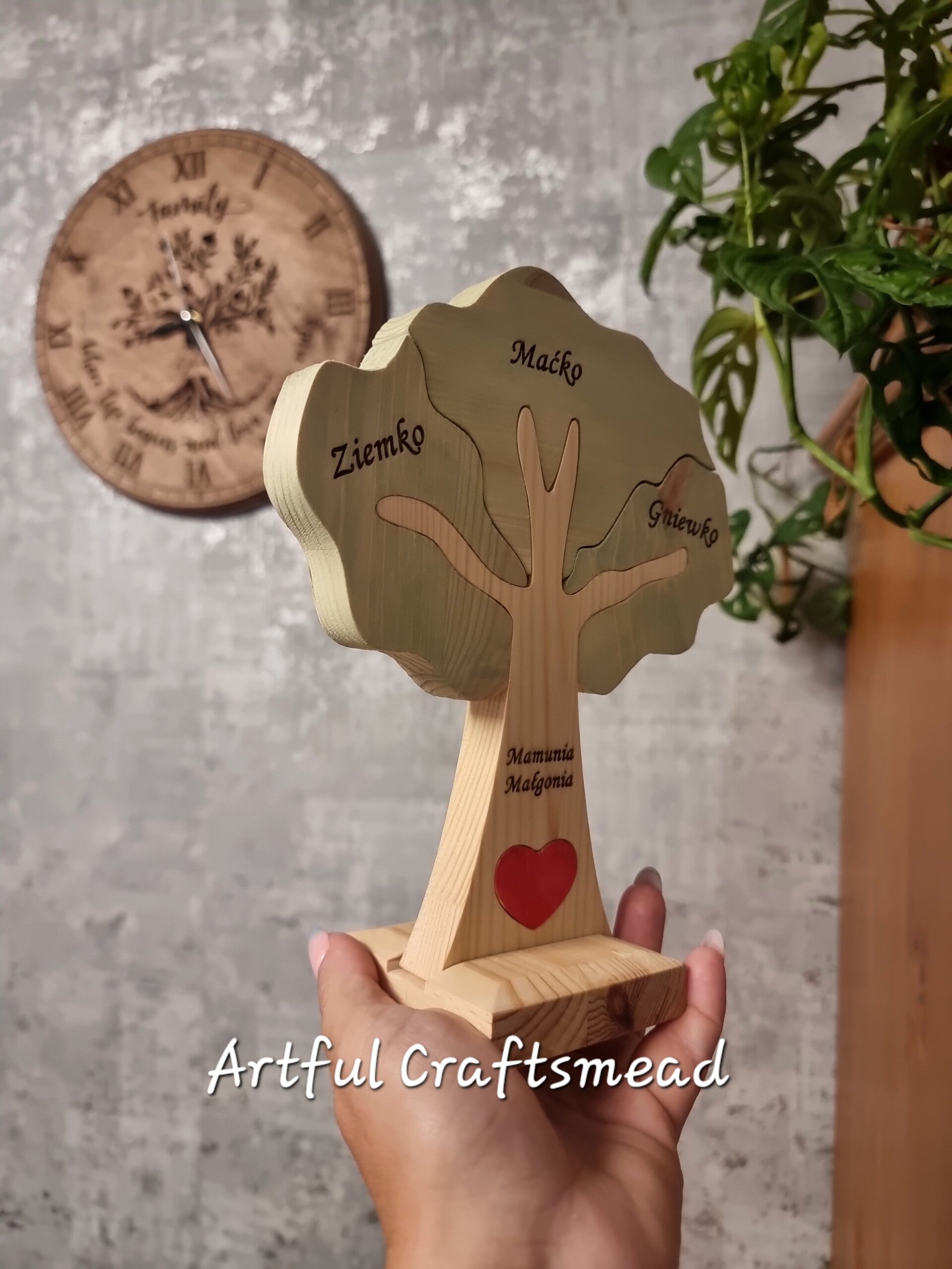 To add a touch of nature, the crown is stained in a delicate green, enhancing its natural beauty. Standing approximately 20cm tall, this family tree puzzle is a perfect addition to any home decor.