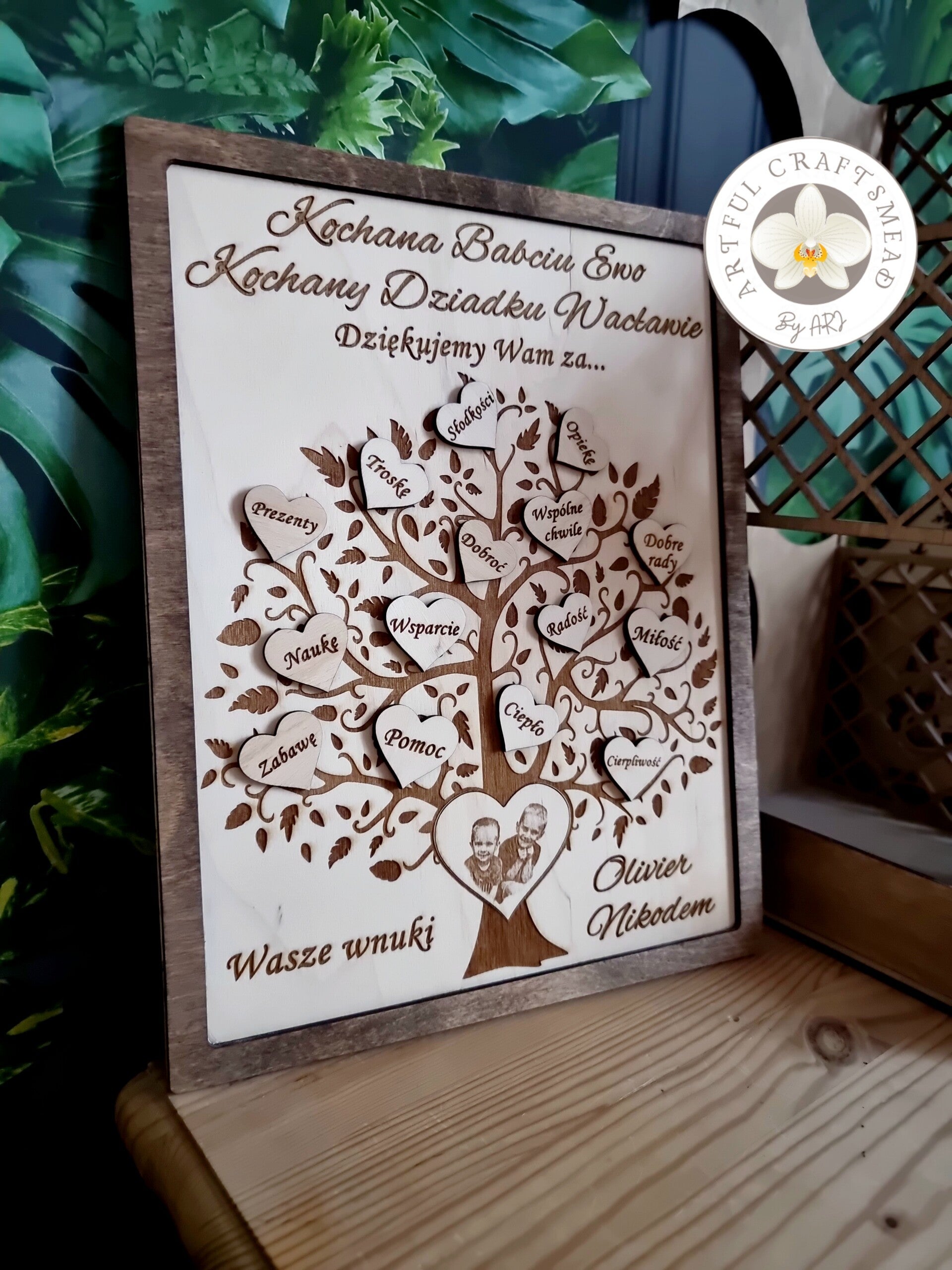 Przepięknie wygrawerowane drzewo: Na dole drzewa znajduje się serce, w którym wygrawerowane jest zdjęcie wnuków.