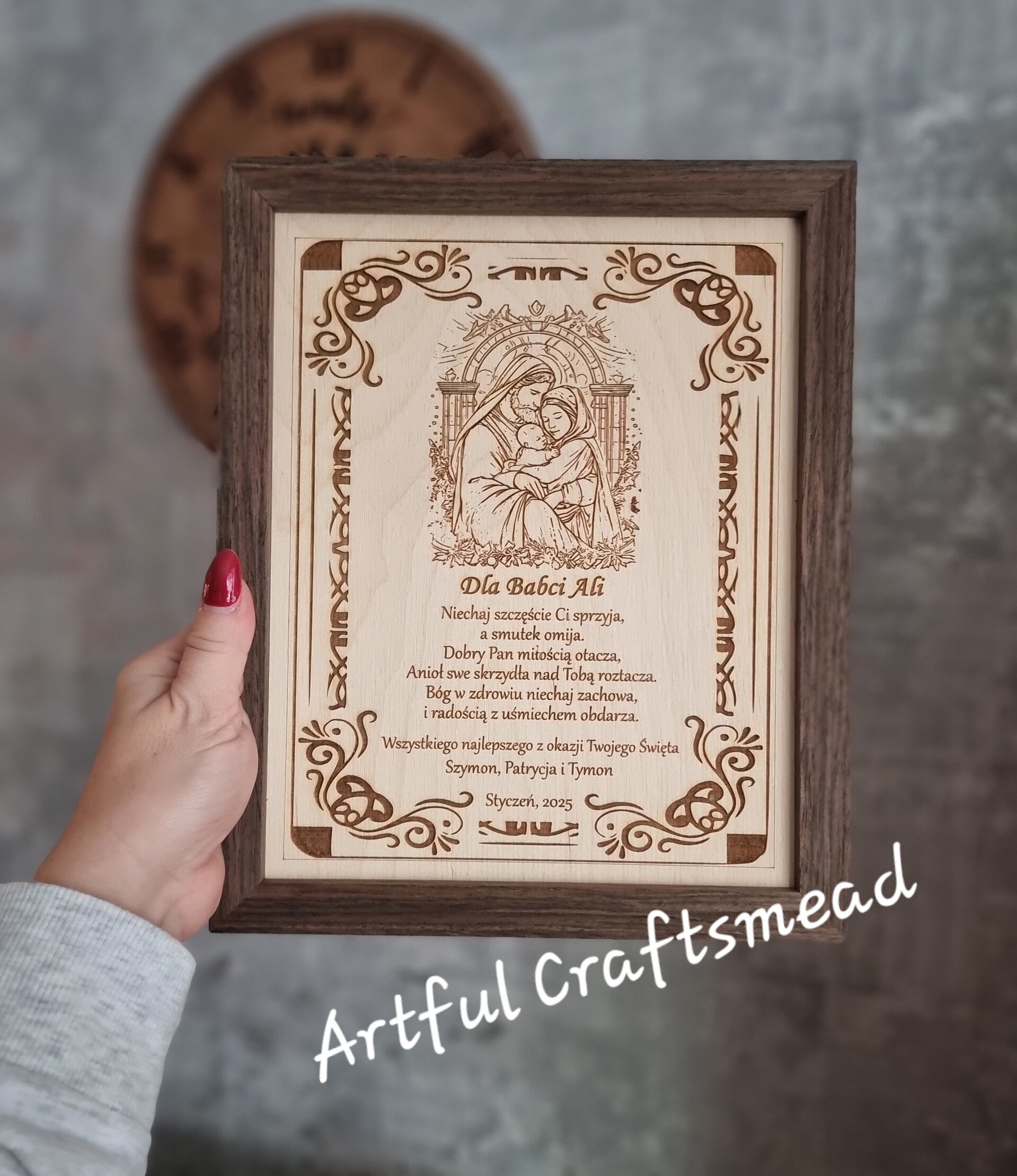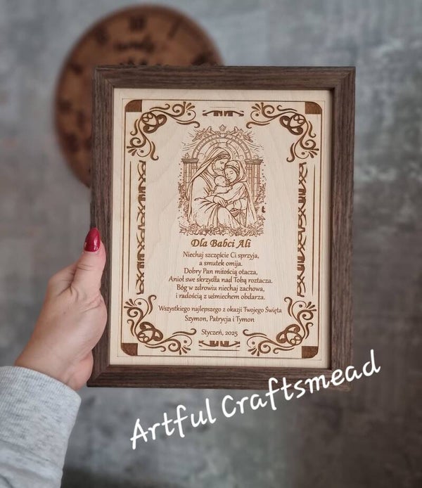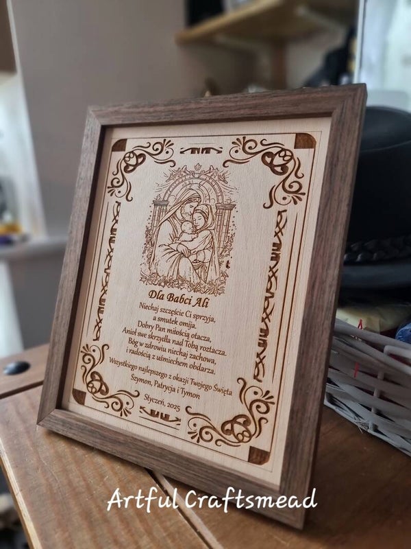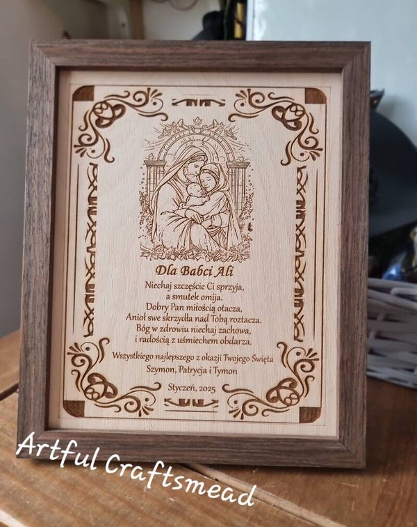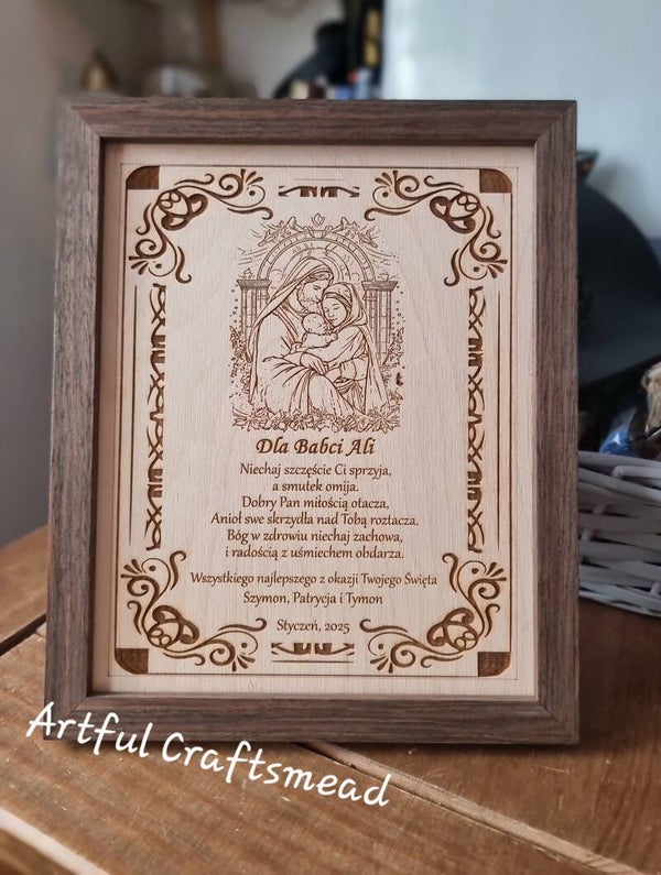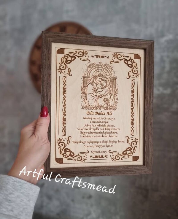 Szukasz szczerego prezentu, który łączy elegancję, sentyment i odrobinę humoru? Nasz grawerowany obraz Świętej Rodziny w solidnej ramie z ciemnego dębu to idealny wybór!