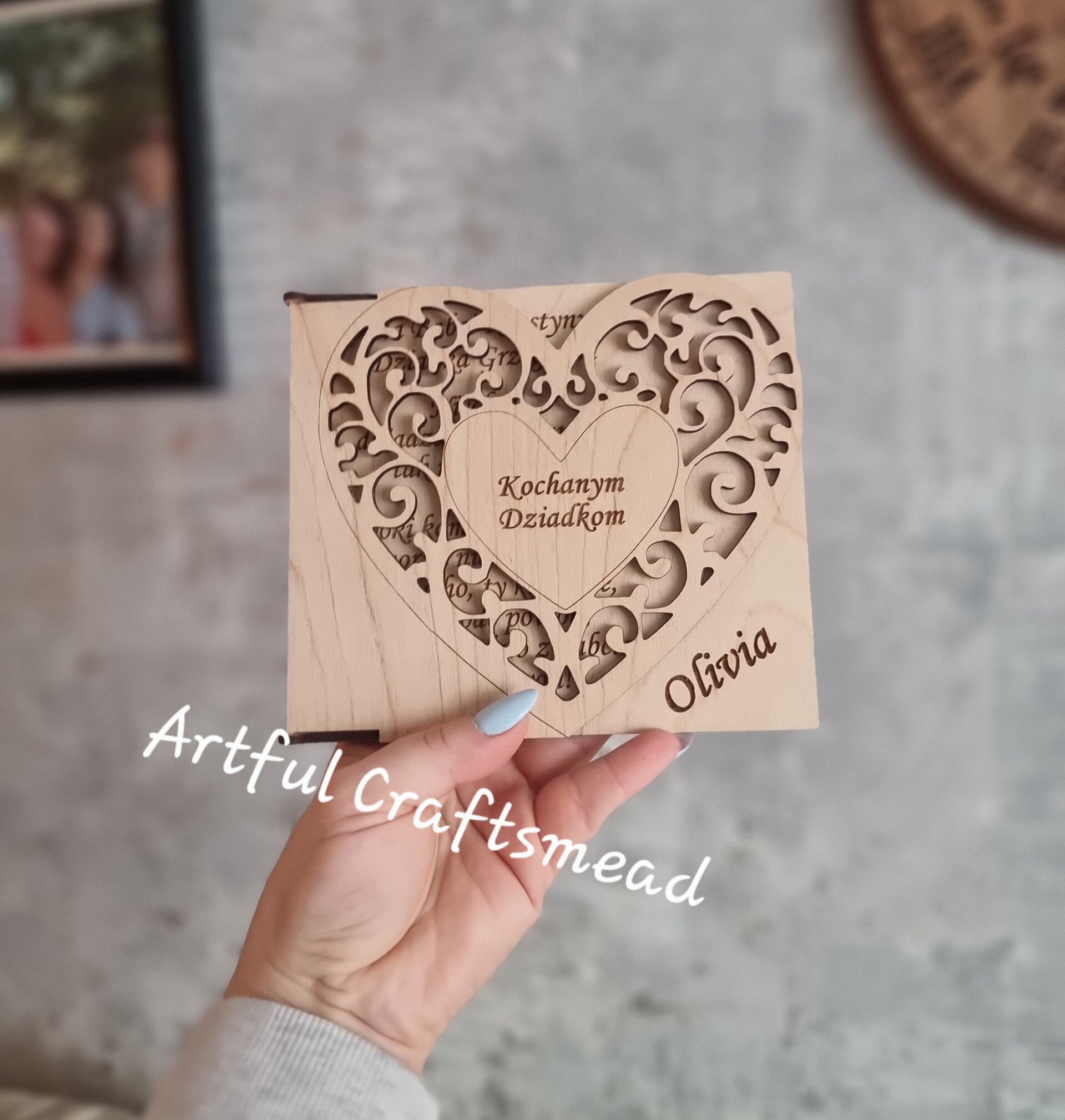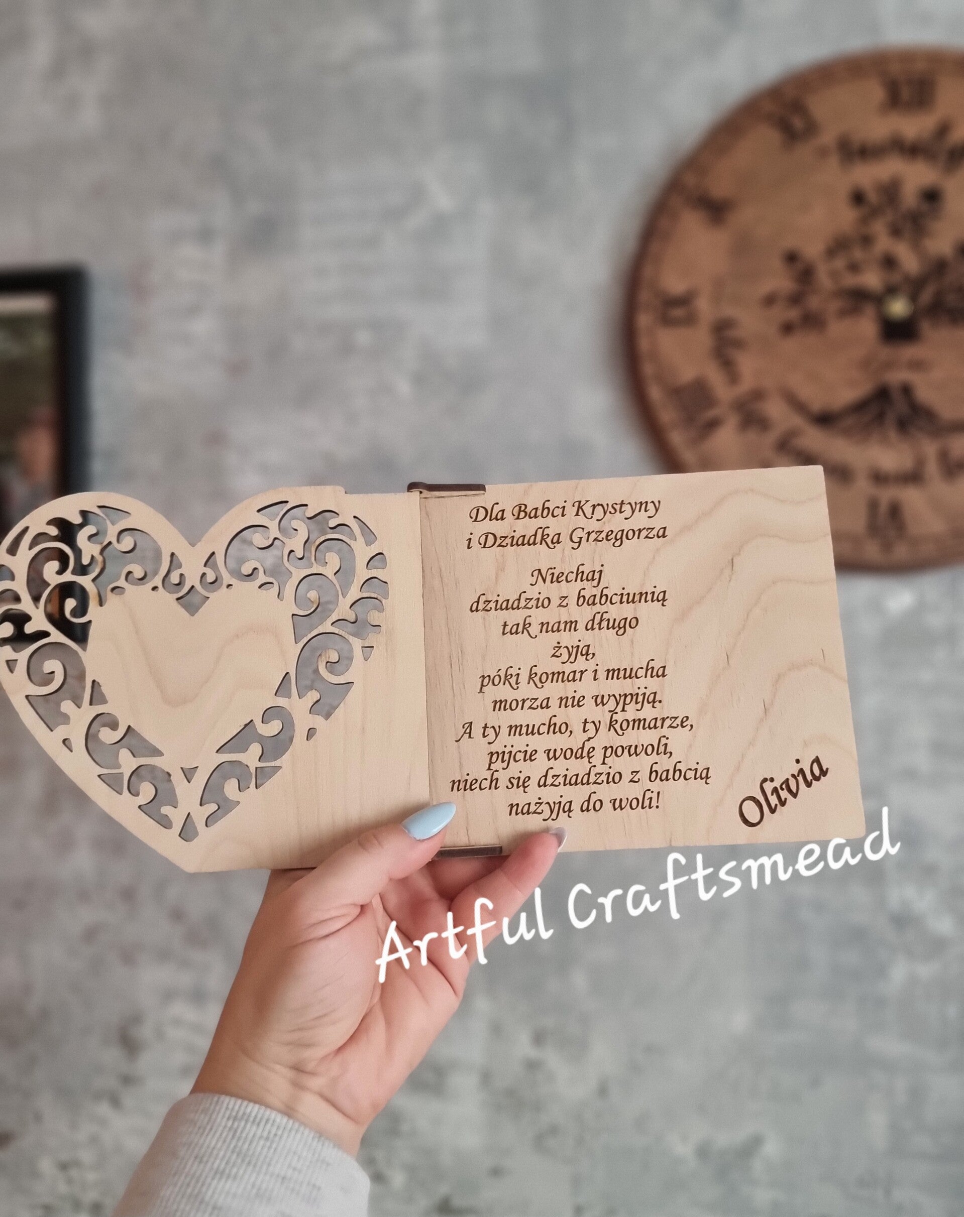 Personalised Wooden plywood opening card, Heart Design Card For All Occasion, With Names And Message, Personalizowana karta drewniana dla Dziadkow lub na inne okazje
