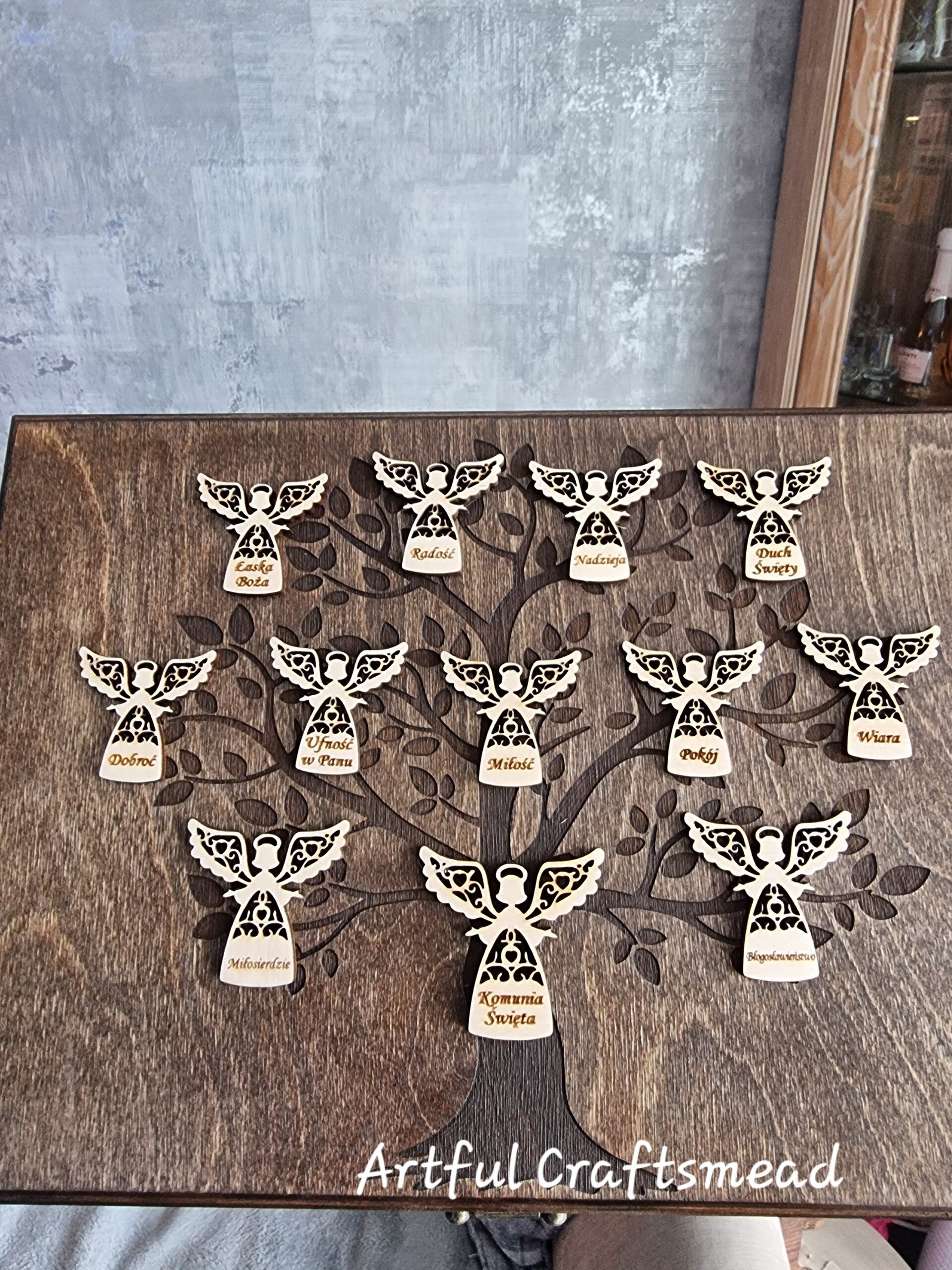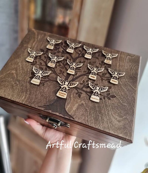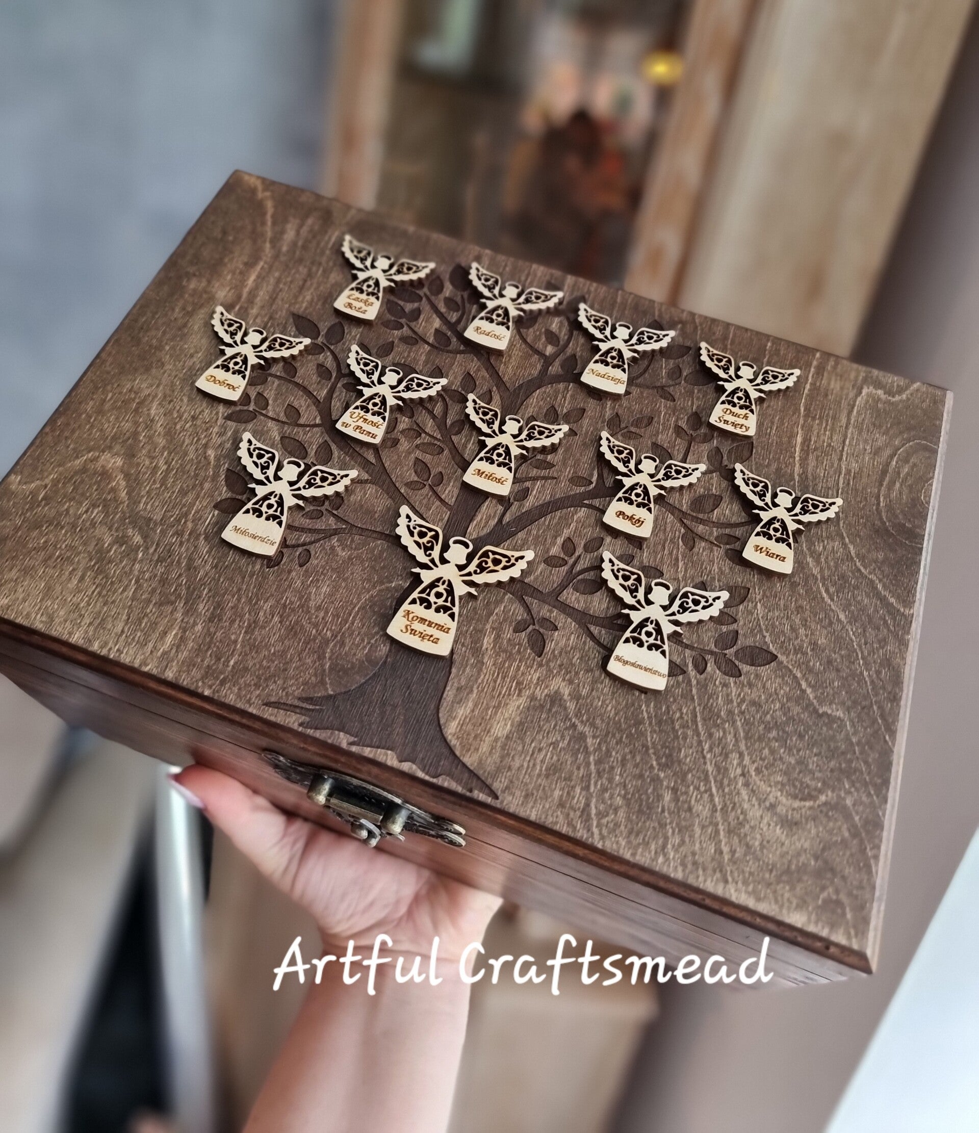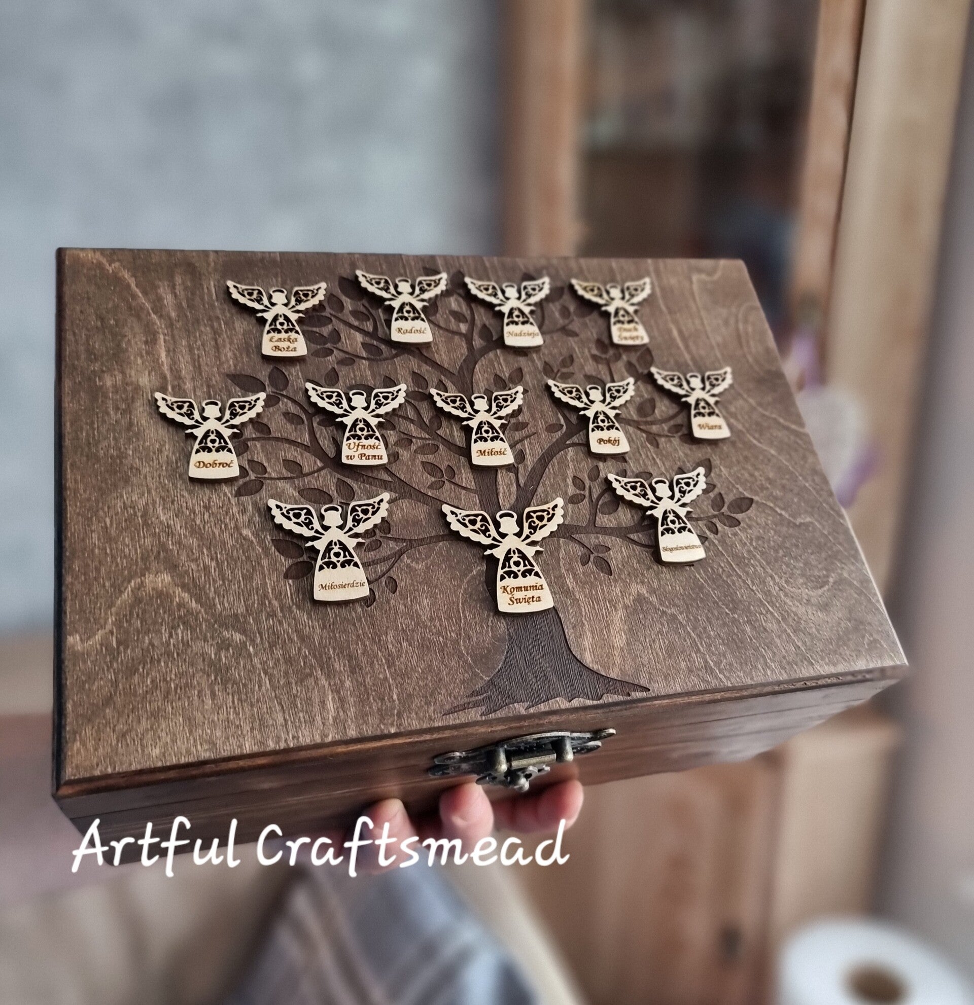 This beautiful box, measuring approximately 29x20x13cm, is made from solid pine wood and crafted from scratch by us with love and care. The lid features an intricately engraved large tree, adorned with 12 lovely angels. The central angel is slightly larger and engraved with the event's name, here shown as "First Communion." The other angels are engraved with words like love, divine grace, joy, hope, Holy Spirit, kindness, trust in the Lord, peace, faith, mercy, and blessing. You can provide us with your own words for the angels to make it even more special! ✨💖