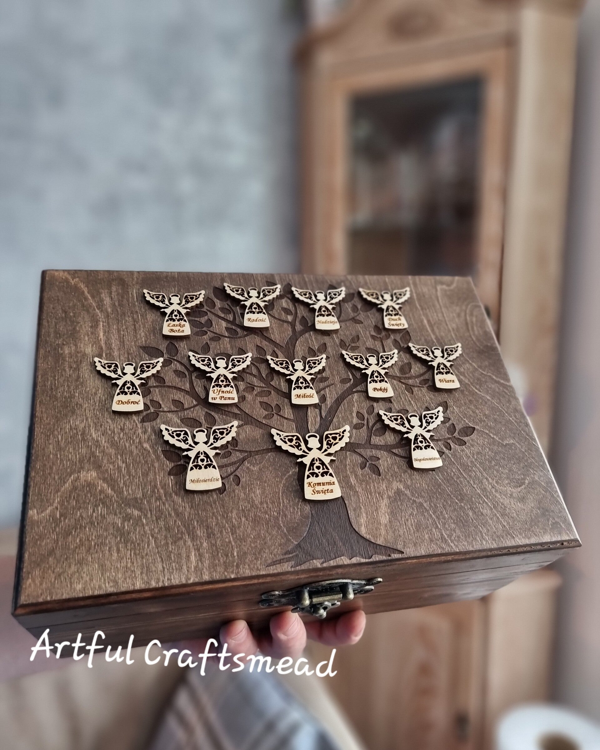 To piękne pudełko o wymiarach około 29x20x13 cm jest wykonane z litego drewna sosnowego i od podstaw przez nas wykonane z miłością i troską. Na pokrywie znajduje się misternie grawerowane duże drzewo, ozdobione 12 pięknymi aniołami. Centralny anioł jest nieco większy i wygrawerowano na nim nazwę wydarzenia, tutaj pokazaną jako „Pierwsza Komunia”. Pozostałe anioły są wygrawerowane słowami takimi jak miłość, boska łaska, radość, nadzieja, Duch Święty, życzliwość, zaufanie Panu, pokój, wiara, miłosierdzie i błogosławieństwo. Możesz nam przekazać własne słowa dla aniołów, aby uczynić je jeszcze bardziej wyjątkowymi! ✨💖