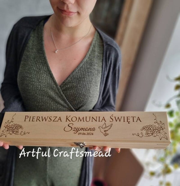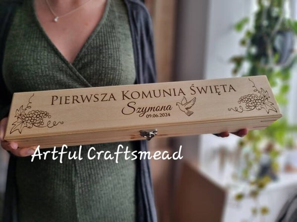 This beautiful box, measuring approximately 47x7x5.5cm, is made from solid pine wood and crafted from scratch by us with love and care. The sides feature a stunning graphic of grapes, and in the center, you can choose to have the text "First Holy Communion" or in Polish, "Pierwsza Komunia Święta," along with the child's name and date. ✨💖