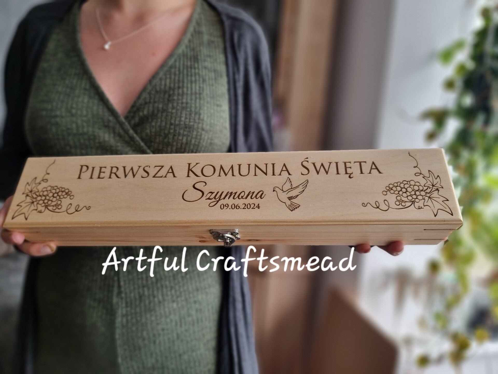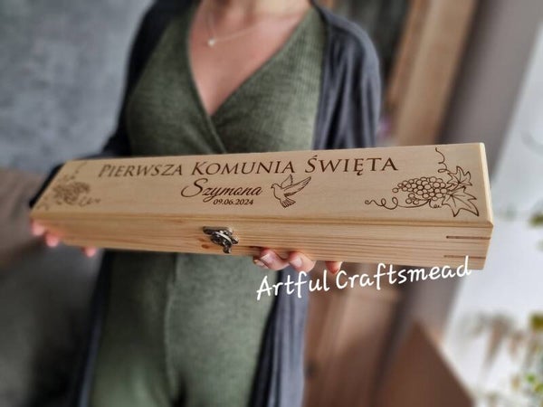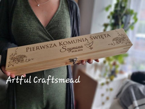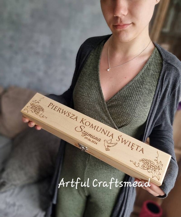 To piękne pudełko o wymiarach około 47x7x5,5 cm jest wykonane z litego drewna sosnowego i od podstaw przez nas wykonane z miłością i troską. Boki zdobią oszałamiająca grafika winogron, a w środku możesz wybrać tekst „Pierwsza Komunia Święta” lub po polsku „Pierwsza Komunia Święta” wraz z imieniem dziecka i datą. ✨💖