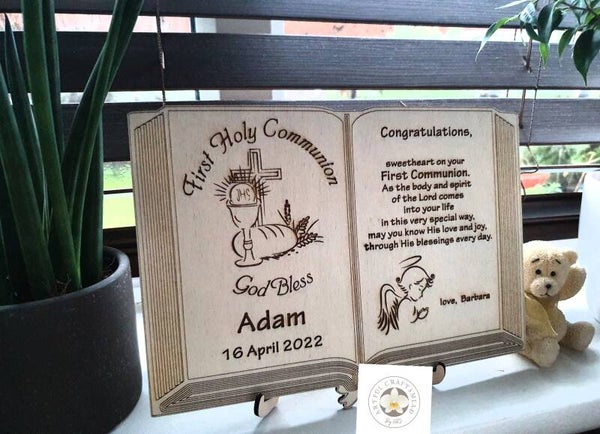 Ta spersonalizowana tabliczka to fantastyczny prezent pamiątkowy dla dziecka, nastolatka, a nawet osoby dorosłej z okazji Pierwszej Komunii Świętej. Jest spersonalizowana imieniem, datą specjalnej okazji i osobą, od której pochodzi pamiątka.