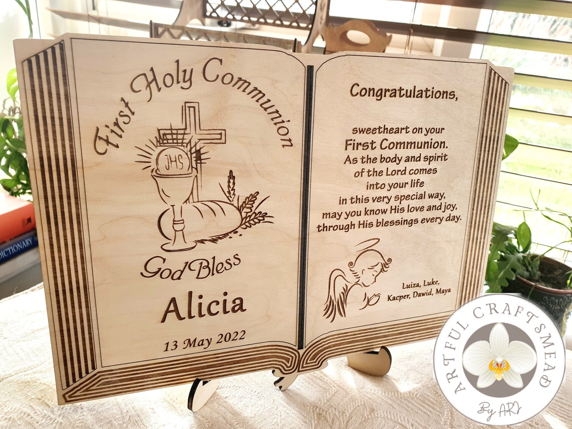 Handcrafted from high-quality plywood, this plaque is shaped like an open book and comes with a stand, making it easy to display anywhere in the home. 🌿📖