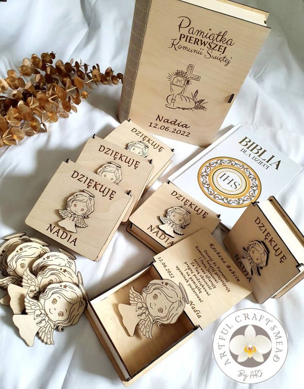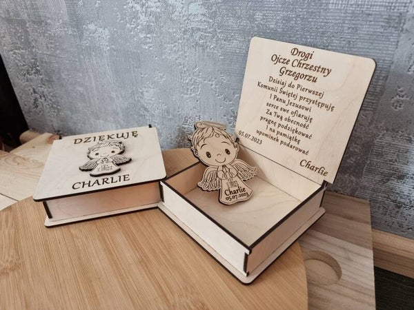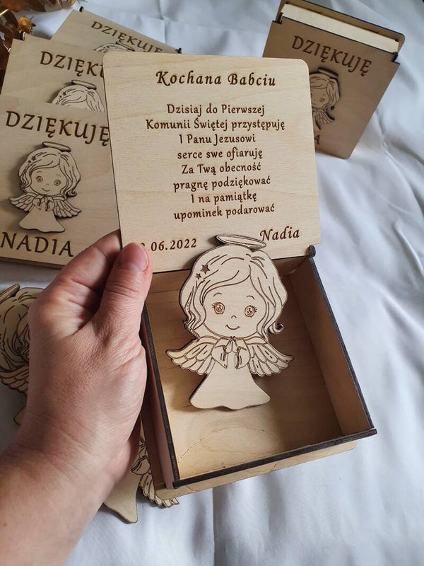 Ręcznie wykonane z wysokiej jakości sklejki, te urocze pudełka mają wymiary około 12x12x3,5 cm i mają uroczego anioła na środku pokrywy. Anioła można dostosować jako chłopca lub dziewczynkę, dzięki czemu jest to naprawdę spersonalizowany prezent. ✨👼