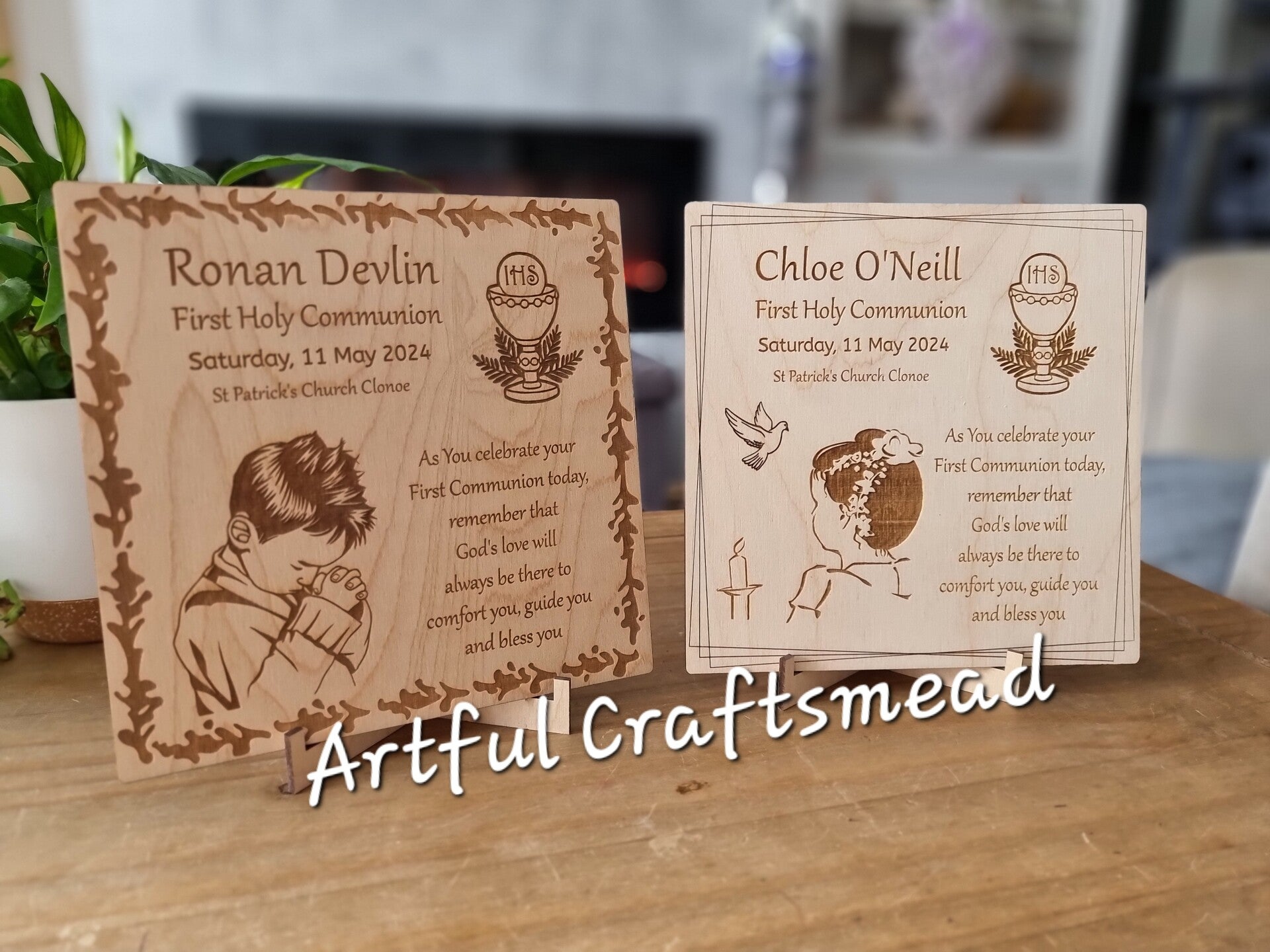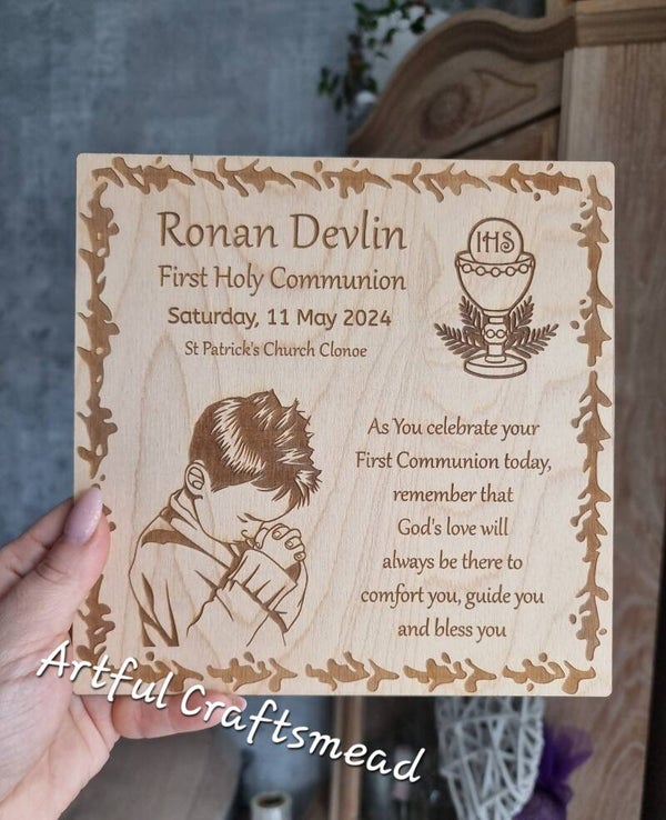 Visit our Etsy shop to select the design (girl or boy), provide the customization details, and place your order. Let this wooden plaque be a lasting reminder of the child's First Holy Communion.