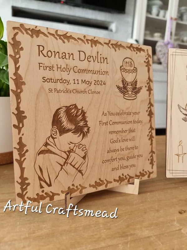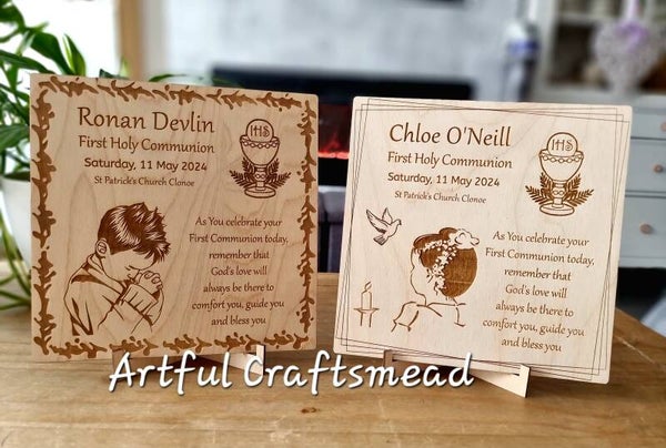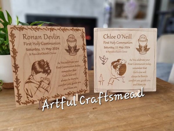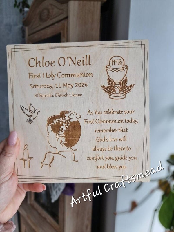 Celebrate the sacred occasion of **First Holy Communion** with our exquisite wooden keepsake plaque. This heartfelt memento is perfect for cherishing the memories of this special day.