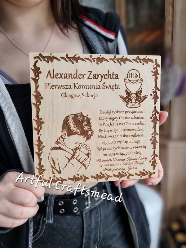 Personalized Wooden First Holy Communion Keepsake Gift Plaque, Custom With Name and Date and Wishes, Spersonalizowana drewniana tabliczka pamiątkowa z okazji Pierwszej Komunii Świętej
