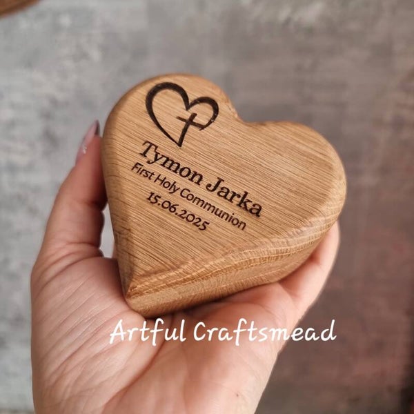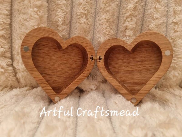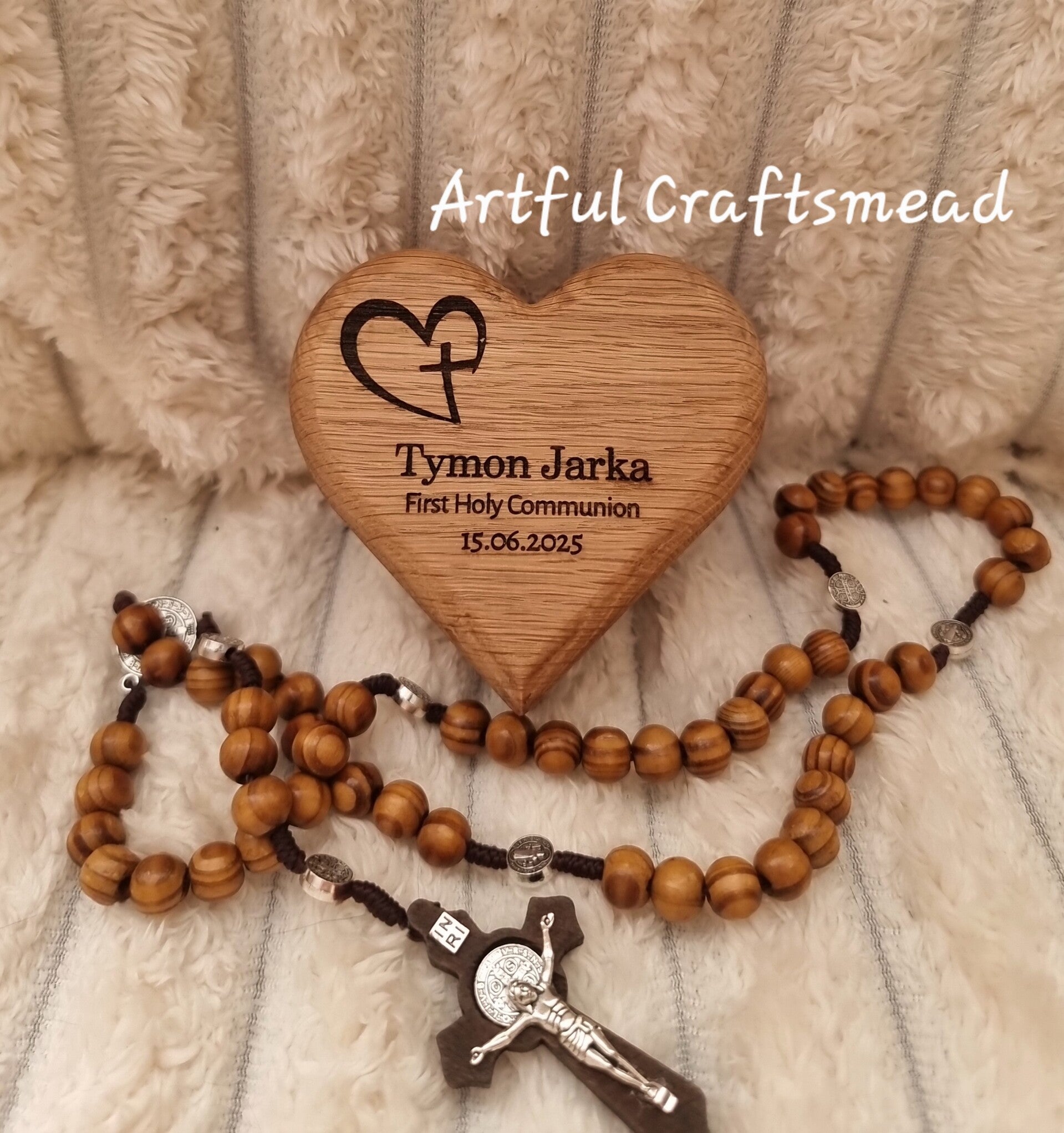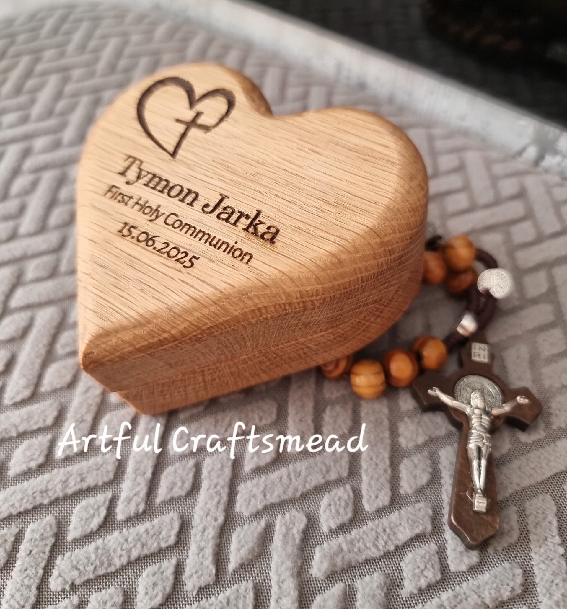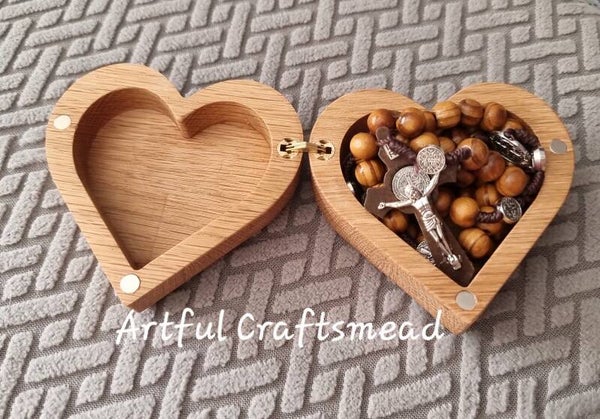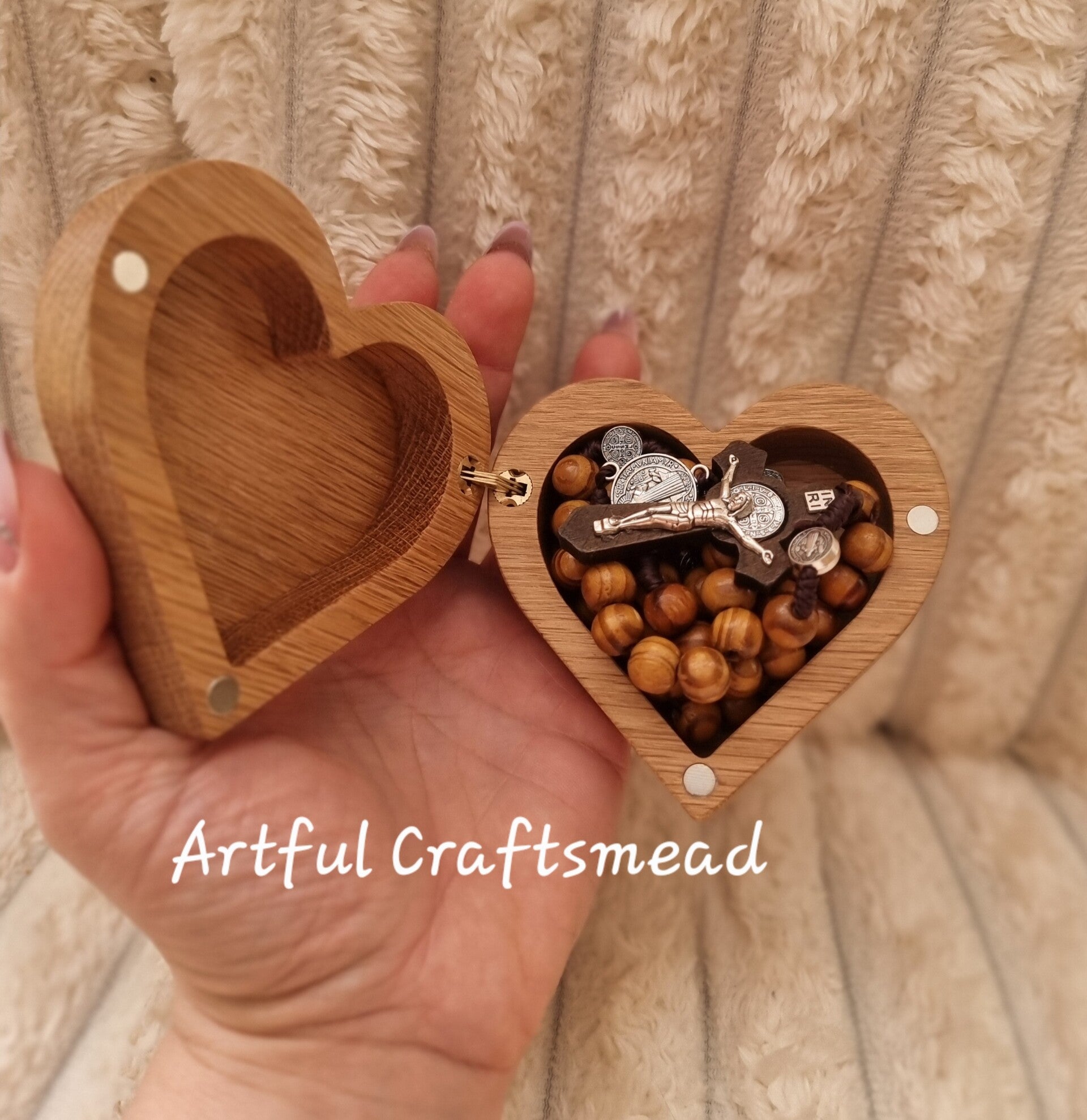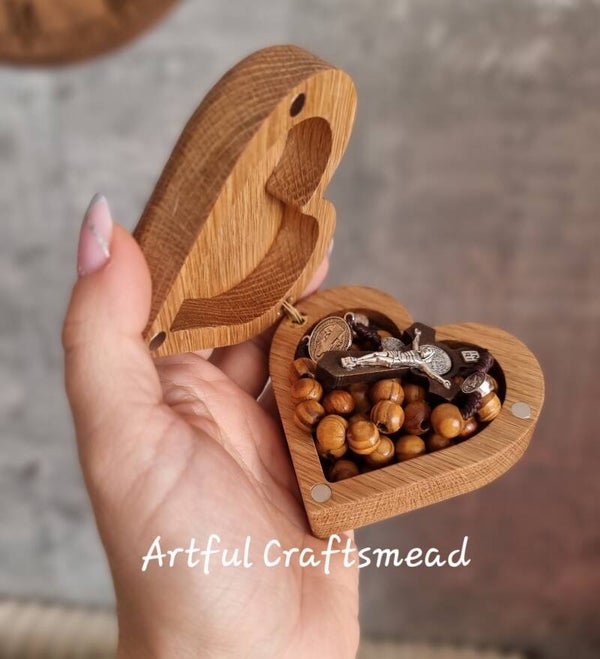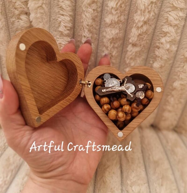 Crafted from solid oak, this delightful box is designed in the shape of a heart, featuring a single internal barrel hinge and two small magnets for secure closure. The external dimensions are approximately 9x8.5x4.5cm, while the internal dimensions for the rosary place are around 6.5x6.5x2cm. 📏✨